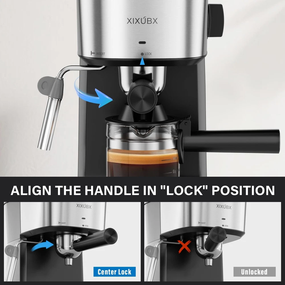 The 6Bar Espresso Machine features one-button operation for easy coffee brewing and milk frothing, ideal for beginners and enthusiasts. It delivers a quick 3-minute extraction with low-noise performance. Includes a marked cup and front indicator for clear visibility. Dual temperature control ensures stable flavor, while steam separation and auto pressure release enhance safety. The compact design fits various spaces, and the removable parts make cleaning simple. One-Button Operation: Only one button control effortlessly handles both coffee brewing and milk frothing, making it extremely user-friendly. Works perfectly with extremely fine coffee powder, suitable for users from beginners to professionals Fast Brewing & Precise Espresso: 6 bar pressure and an 800W heating system brew rich coffee in just 2 minutes. The easy-pour glass cup with clear markings ensures precise measurements, delivering fresh, authentic espresso quickly and effortlessly Powerful Functional Configuration: Bimetal temperature control keeps water steady for consistent coffee. Steam-water separation prevents dilution, ensuring rich flavor. The steam wand creates creamy milk foam for lattes, cappuccinos, and more Compact & Premium Design: Measuring 12.99”×9.06”×6.69”, this compact espresso machine fits kitchens, offices, apartments, or small countertops. The stainless steel cup warmer preheats cups to keep coffee hotter longer, enhancing the drinking experience Automatic Pressure Relief: After brewing, leftover pressure is automatically released, preventing sudden bursts of hot steam or water when opening or removing parts. This protects internal components, extends machine lifespan, and ensures safe, worry-free use. Easy Cleaning & Safety Features: Detachable drip tray and steam wand head make cleaning simple. Equipped with a high-temperature fuse and automatic shut-off for water shortage. Overfilled water drains from the brewing head to prevent excess pressure Usage Tip: If you have any questions about using this product, please feel free to ! Please read the product manual carefully before using the coffee machine. You can click to visit the or the product description section to watch more instructional videos