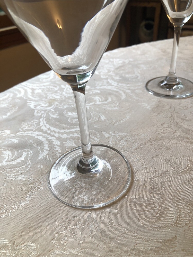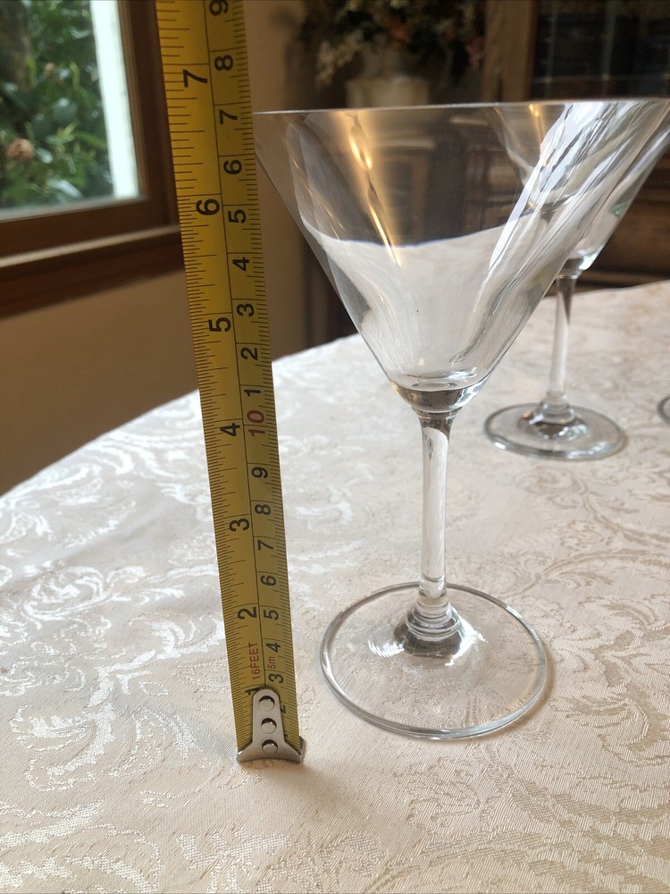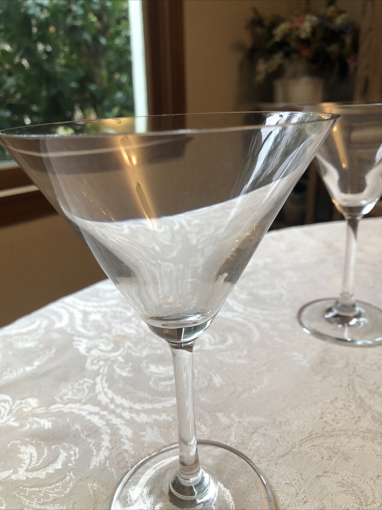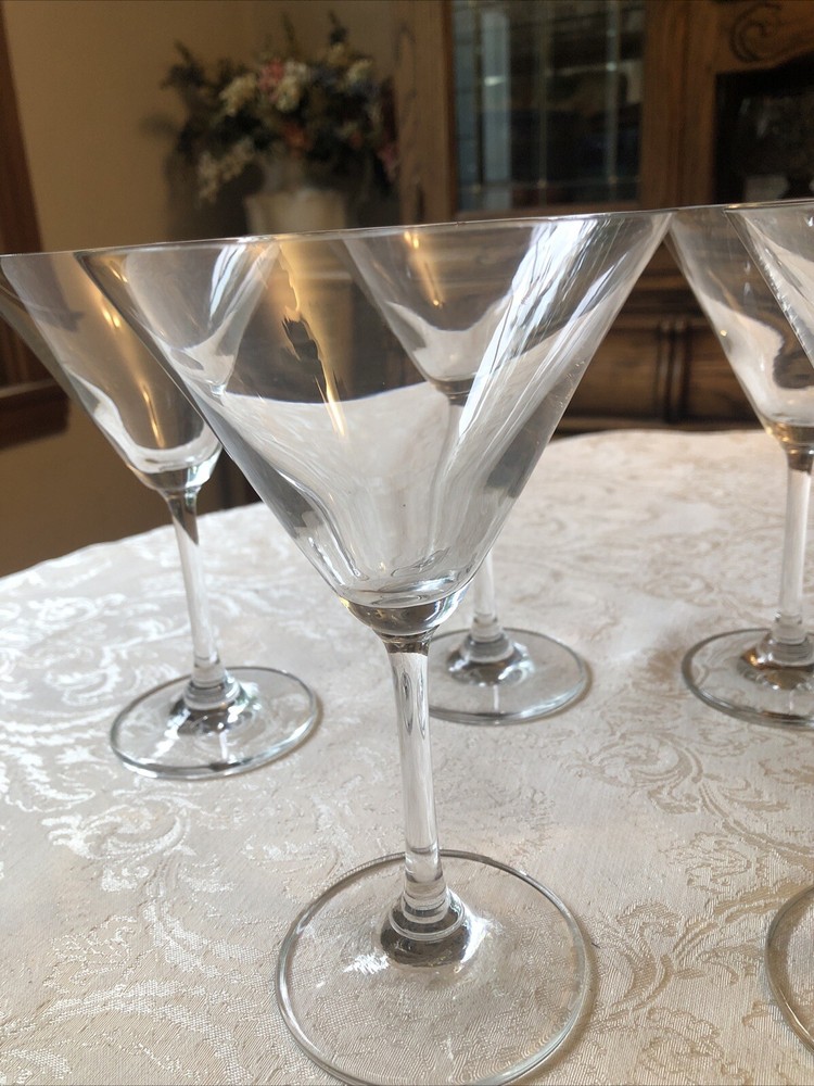 This is a set of six clear martini glasses made of glass material. The glasses are 6.75 inches tall and 4.5 inches wide at the mouth, with a 3-inch base diameter. They are suitable for all occasions and unisex adults. The glasses are vintage and original, made in the United States. They are machine washable and have a brand name but are unmarked.