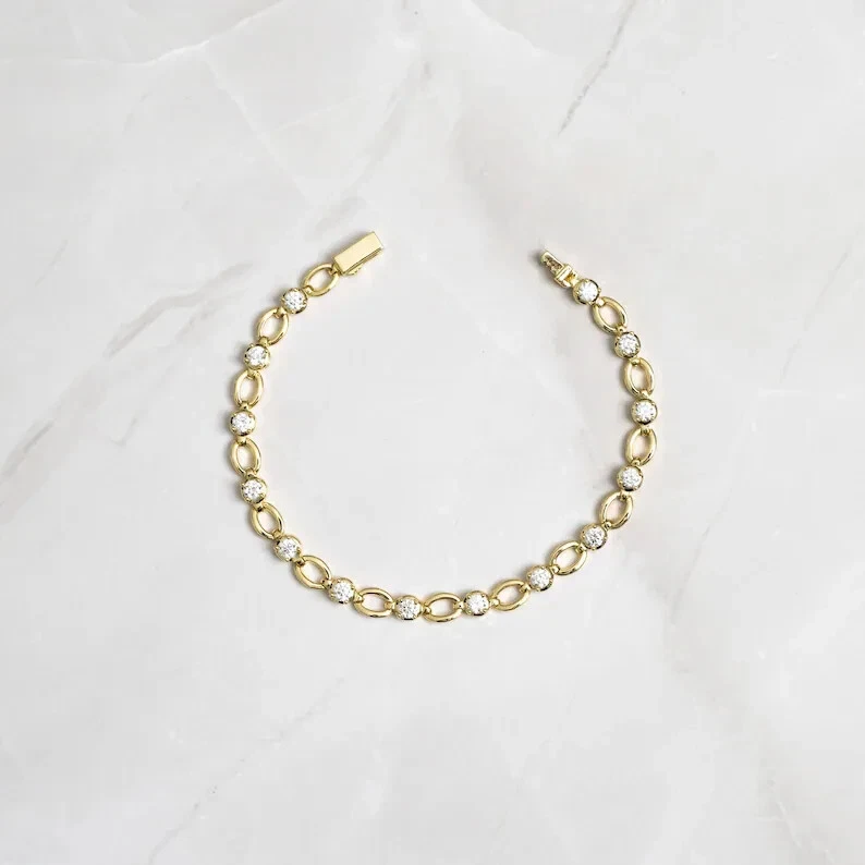 This 6 Ct Round Simulated Diamond Women's Tennis Bracelet features a stunning design in yellow Sterling Silver. The bracelet has a push-lock closure and is 7.5 inches in length with an adjustable feature. The main stone is a white simulated diamond with excellent cut grade and eye-clean clarity. It is handmade and personalized with engravings available as per the buyer's requirement, making it a perfect choice for special occasions like engagements, birthdays, weddings, and more. The bracelet is nickel-free and features a tennis link chain style with prong setting.
