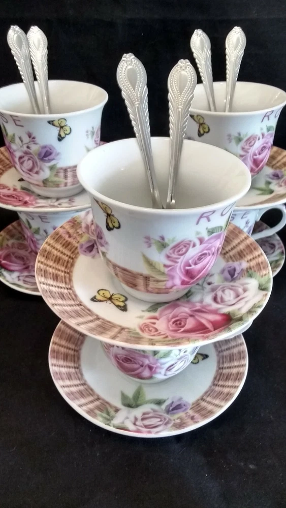 6 Cup 6 Saucer 6 Spoons Floral Tea Set ROSES BUTTERFLY Flower CLEARANCE SALE