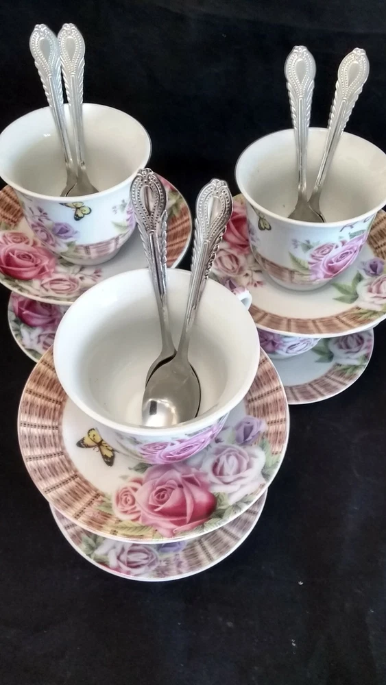 Indulge in the timeless beauty of this exquisite tea set that exudes sheer elegance. The set includes six cups, six saucers, and six spoons, all adorned with a mesmerizing floral design of roses and butterflies in shades of red, pink, and white. The round shape and porcelain material make it perfect for all occasions, and the 7 oz capacity of the cups is perfect for a piping hot cup of your favorite beverage. This stunning set is not just beautiful but also practical, with features like being microwave and dishwasher safe. It's the perfect addition to your kitchen and dining collection, and it's sure to impress your guests. Bring home this floral tea set and enjoy the perfect tea-time experience. New Set of 18 pc total. 6 cups & 6 saucers & 6 spoons Brand new but No box. BUY MORE AND SAVE. TWELVE PIECE SET - plus 6 spoons Ships fast from U.S. 7 oz cups with saucers set