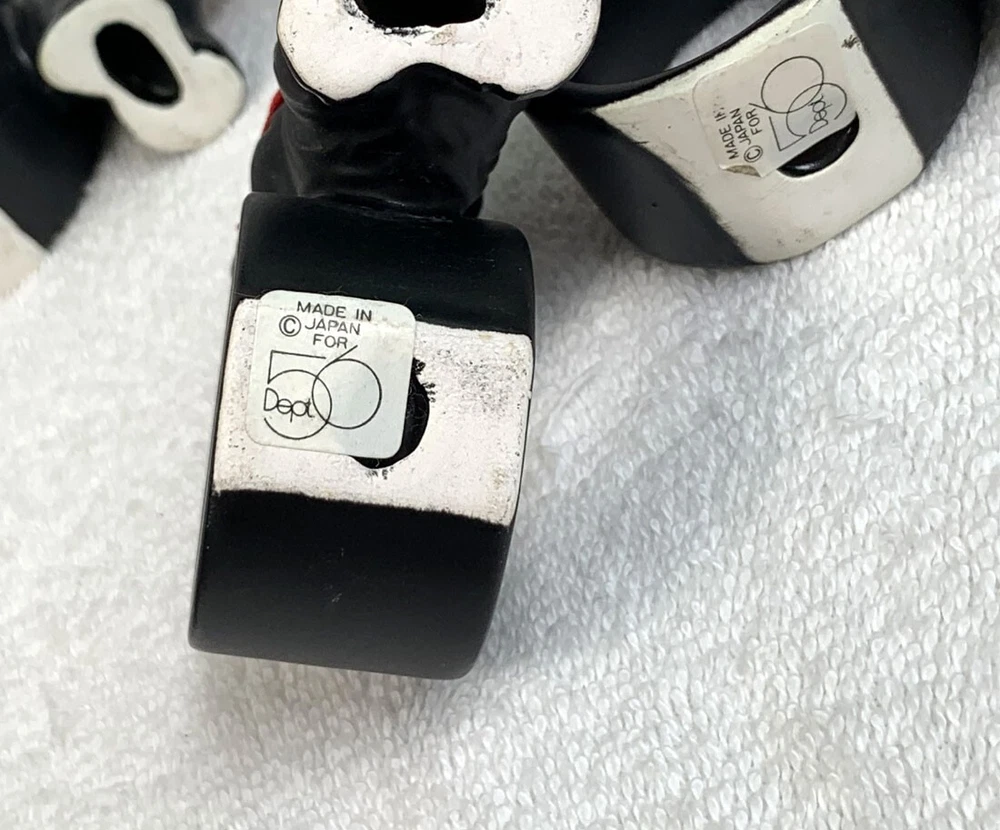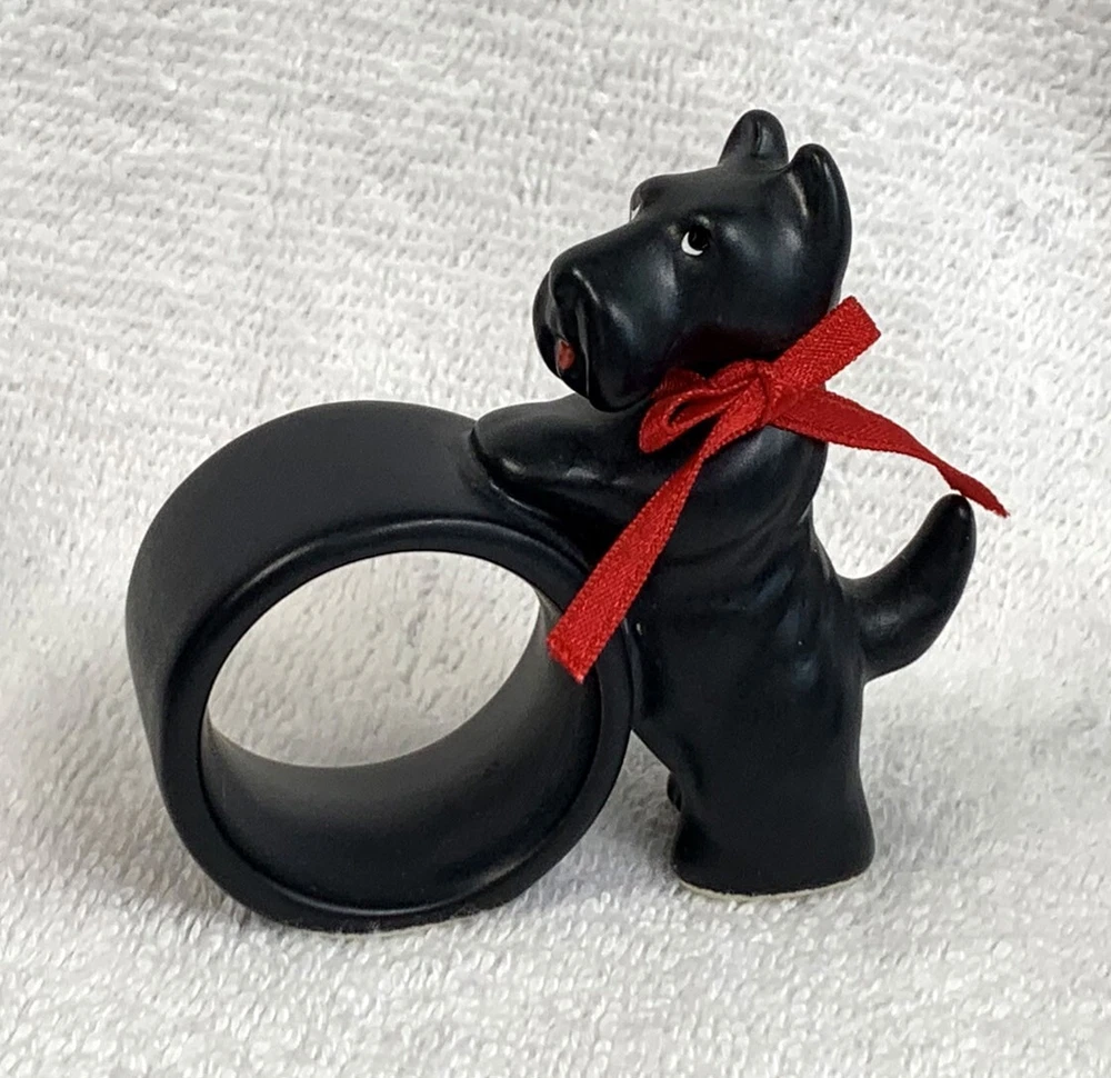 6 preowned Dept 56 napkin rings Ceramic Black Scottie dogs with a red ribbon around the neck The dog stands 3" tall No damage