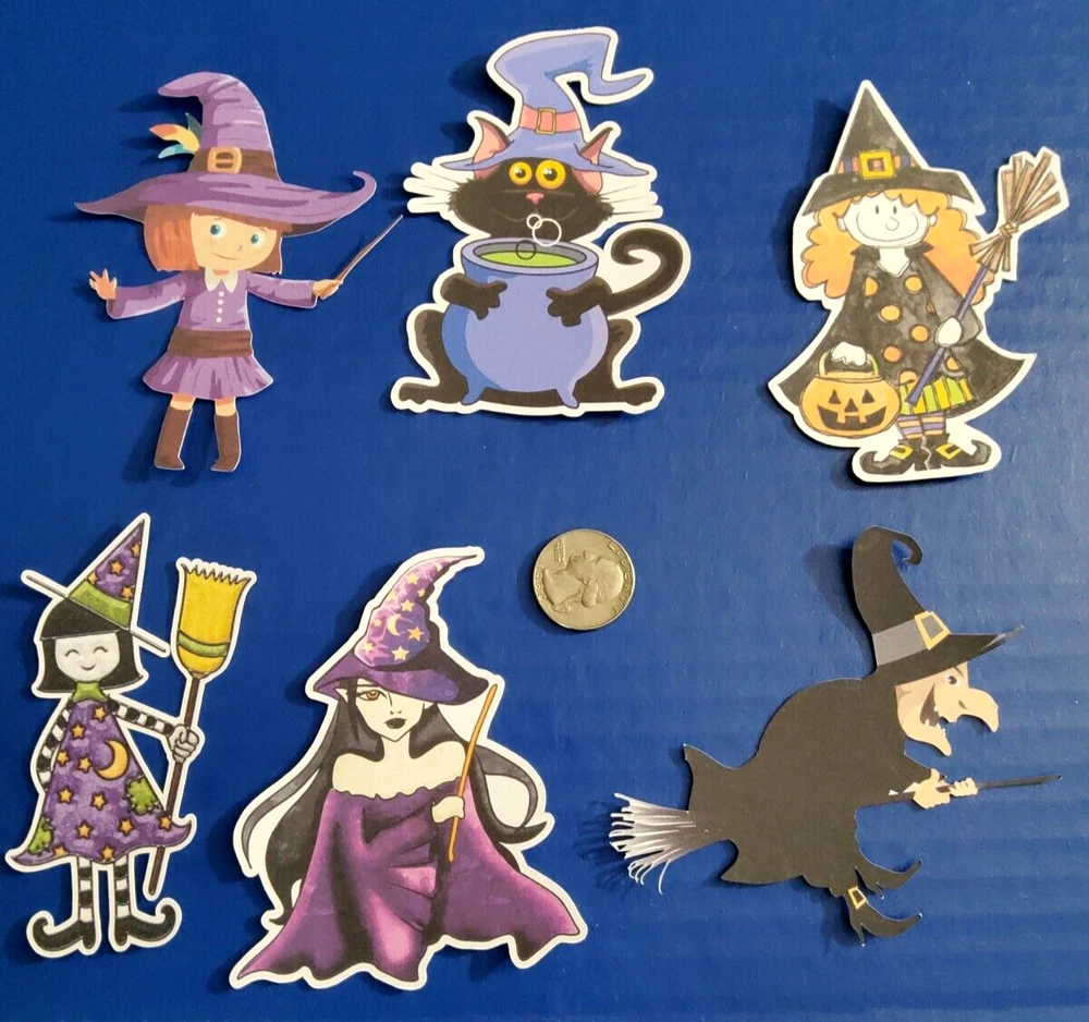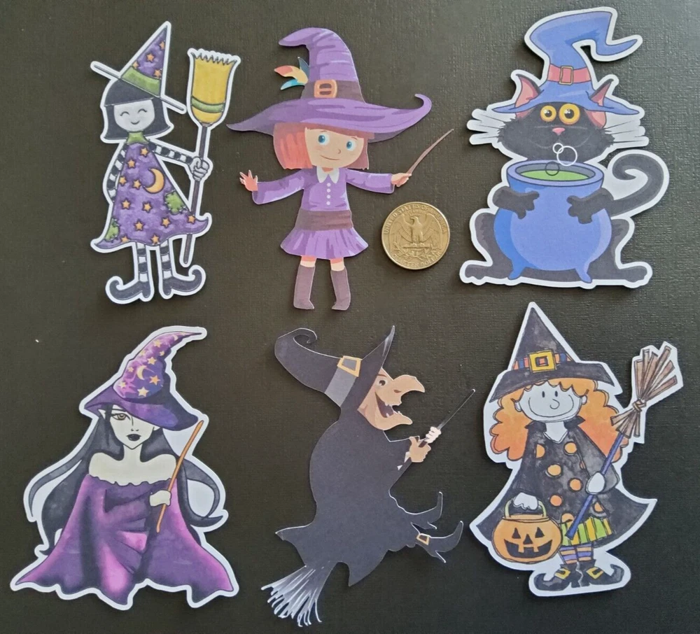 6 Beautiful Halloween Witch Designs Die Cut Card Toppers - Lot 10Ae Made on cardstock. Size of each design is 4 inches. These will be a great addition to your crafting supplies. I also have several listings of ready-made greeting card sets and lots if you would care to check those out. **Shipping next business day by Ebay letter .** Additional sets purchased at the same time will ship for $1 each. Thanks for looking.