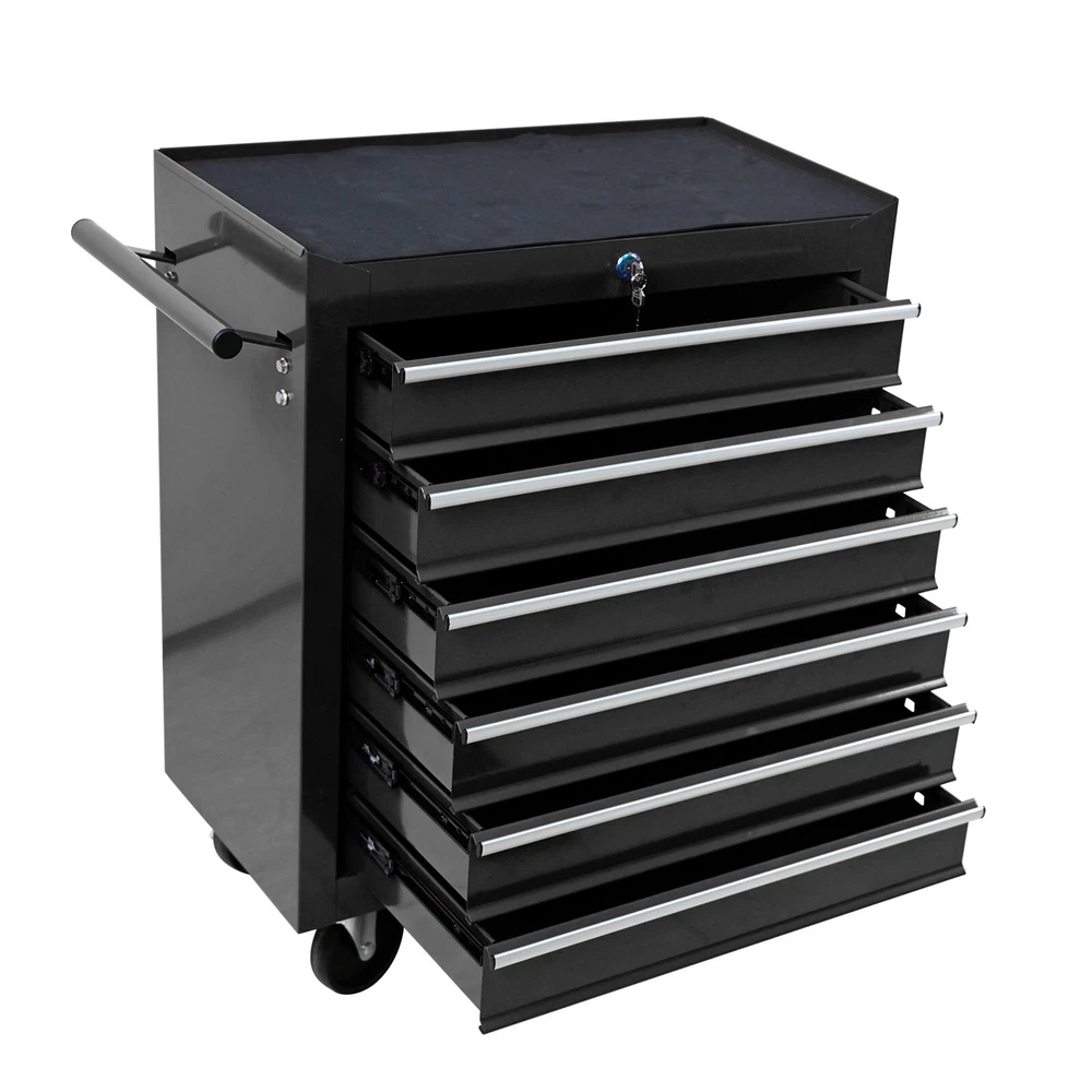 Package Size Length (in.): 26.37 Width (in.): 14.76 Height (in.): 27.95 Weight (lbs.): 57.09 Product Features 6 Drawers multifunctional tool cart with wheels The tool box is also lockable and can be used as a removable, attachable and mobile case The opening and closing of the drawers of the tool cabinet is very gentle thanks to the ball-bearing drawers The robust and powder-coated steel construction is used for high wear resistance. This assembly trolley has 4 steering wheels, 2 of which with parking brakes, so you can move the trolley freely in the garage, but also stop in one place Description Top&Drawer Liner Protect your tools scratches Ball-Bearing Drawer Slides Pull or push the drawer easily and smothly Key Locked Drawers With keyed locking system(2 keys in included) Flour Universal Wheels,Two Brakes Move easily anywhere and stop quickly with 2 lockable wheels Product Information Proudct Name 6 Drawers Workshop Tool Trolley Material Cold Rolled Steel Surface Finish Powder Coating Powder Coating 4" Casters (2PCS with brake and 2PCS without brake) Size 615*330*745 Drawers Dimension 540*300*85 Package Size 670*375*725 Color Black Net Weight 24KG Gross Weight 26KG