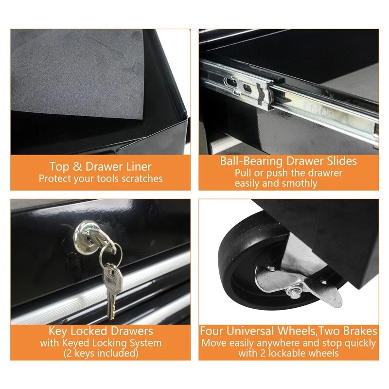 6 Drawers Tool Cart Workshop Rolling Tool Box Chest Storage Cabinet w/Lock & Key Features and Details: 6 Drawers multifunctional tool cart with wheels The tool box is also lockable and can be used as a removable, attachable and mobile case The opening and closing of the drawers of the tool cabinet is very gentle thanks to the ball-bearing drawers The robust and powder-coated steel construction is used for high wear resistance. This assembly trolley has 4 steering wheels, 2 of which with parking brakes, so you can move the trolley freely in the garage, but also stop in one place Specification: Color: Black Material:Cold Rolled Steel Product Dimensions:24.25"L12.99"W29.33"H Surface Finish :Powder Coating Powder Coating:4" Casters (2PCS with brake and 2PCS without brake) Drawers Dimension : 540*300*85 Weight (lbs.): 48.50