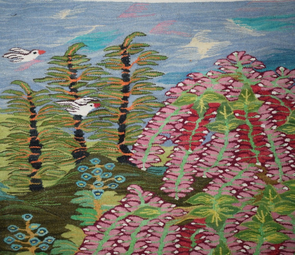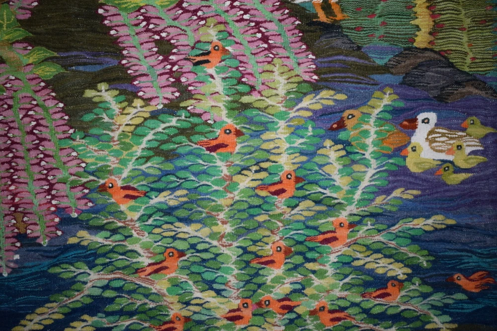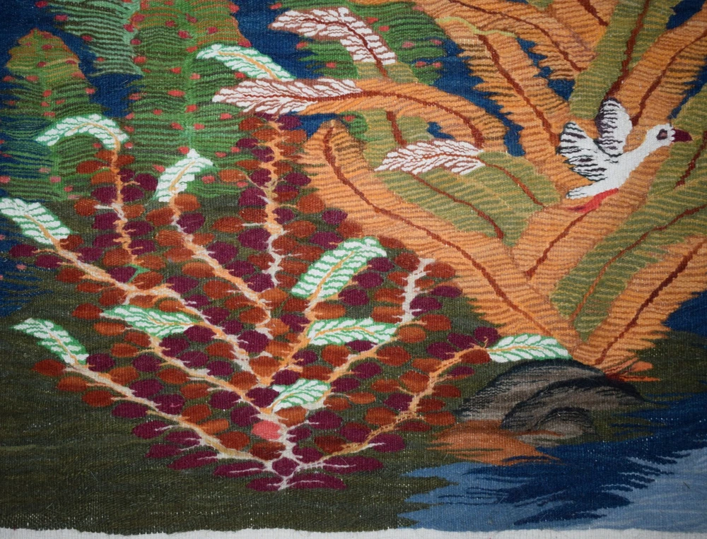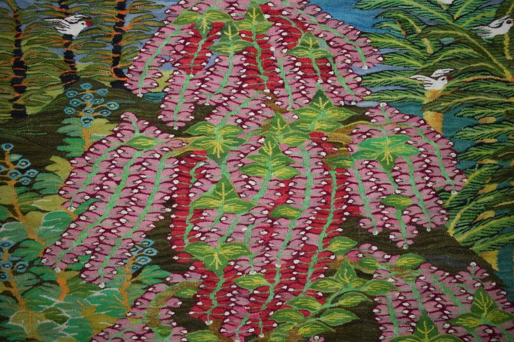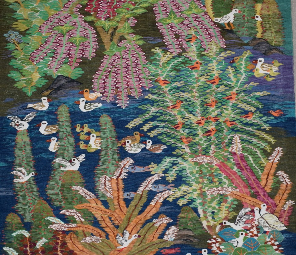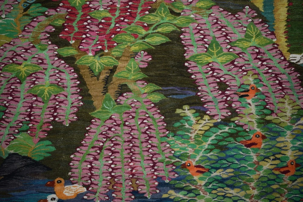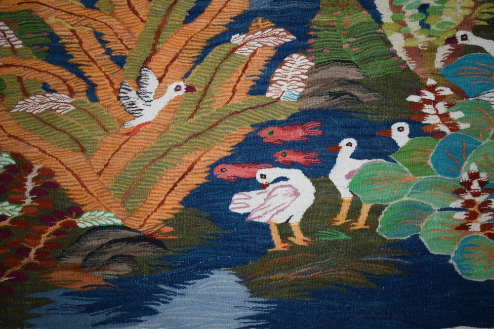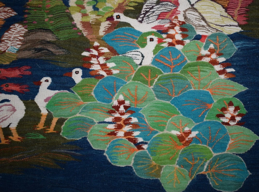 6 FT Handwoven Egyptian Kilim Rug Wall Hanging Tapestry Garden Ducks Birds Pink 6 FT Handwoven Egyptian Kilim Rug Wall Hanging Tapestry Garden Ducks Birds Pink Handwoven Egyptian Tapestry — Natural Dye Wool Thread — Artisan Wall Art — Wissa Wassef Style Experience the beauty of authentic Egyptian handwoven tapestry, crafted using natural plant-based dyes on high-quality wool threads. What makes each piece truly extraordinary is that the skilled artisans weave entirely from imagination — without sketches or guides — improvising every detail as they work. This rare mastery ensures that no two pieces are alike, making each tapestry a one-of-a-kind expression of artistic genius. The natural dyes give vibrant, long-lasting colors while being eco-friendly. This is a showpiece — a large, richly detailed scene with a cascading pink flowering tree at the center, surrounded by lush tropical plants, ferns, and succulents. Ducks swim in deep blue water, white birds perch among the foliage, and vibrant orange coral-like plants fill the lower half. Incredible color depth from top to bottom — greens, blues, pinks, oranges, and teals all woven together. Size: 6.0 x 3.8 ft / 71.5 x 46 inches / 182 x 117 cm (approx.) Can be used as a rug, wall hanging, or decorative throw