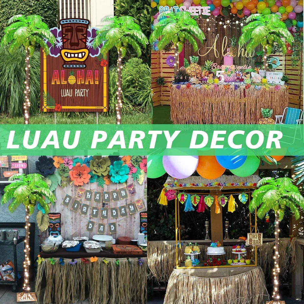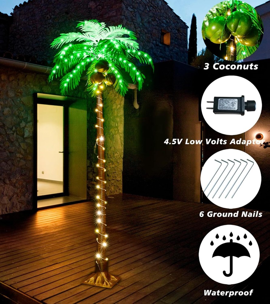 6 FT LED Lighted Palm Tree with Coconuts Outdoor Artificial Palm Tree Tropical Palm Tree Lights for Patio Pool Hawaiian Luau Jungle Party Tiki Bar Christmas Indoor Decoration Prelit Palm Tree with 3 Coconuts: The palm tree is designed by brown straight trunk and green palm fronds with LED lights. This coconut tree can add some tropical style to your patio, pool, Hawaiian party, tiki bar, Palm Sunday, Christmas decoration, etc Artificial palm tree for Outside & Inside Decor: Artificial palm tree is powered by 4.5 V low voltage adaptor, which is more safe. Designed with long life span LED lights, more save-energy. IP44 waterproof functions make it more suitable for outside use Specification: The lighted palm tree for outside decoration is 6 FT height, designed with LED lights, include green led lights hidden in the fabric leaves, and warm white led lights attached to the brown trunk Easy to Assemble: It is very easy to assemble and looks terrific. You just need screw the trunk into the base, and separately connect 2 trunks and the male & female plug.Then shape the leaves as you want Widely Application: Wherever on the beach, swimming pool, yard, garden, party, home, indoor or outdoor, And whenever winter or summer, daytime or holiday, always bring you the Hawaiian travel happiness Product Dimensions 28"D x 28"W x 72"H Color Warm White Material Polyvinyl Chloride Item Package Quantity 1 Recommended Uses For Product Decoration Occasion Summer Hawaiian Luau Party, Christmas, Indoor & Outdoor, Patio、Yard、Garden, Pool、Beach Special Feature Plug In Adapter, Outside Patio, pool, beach, Summer Hawaiian Party, Inddor Outdoor Decoorations, IP44 Waterproof, Tropical palm tree with coconuts, Easy to Assemble Plug In Adapter, Outside Patio, pool, beach, Summer Hawaiian Party, Inddor Outdoor Decoorations, IP44 Waterproof, Tropical palm tree with coconuts, Easy to Assemble Seasons Summer, All Seasons Tree Type palm