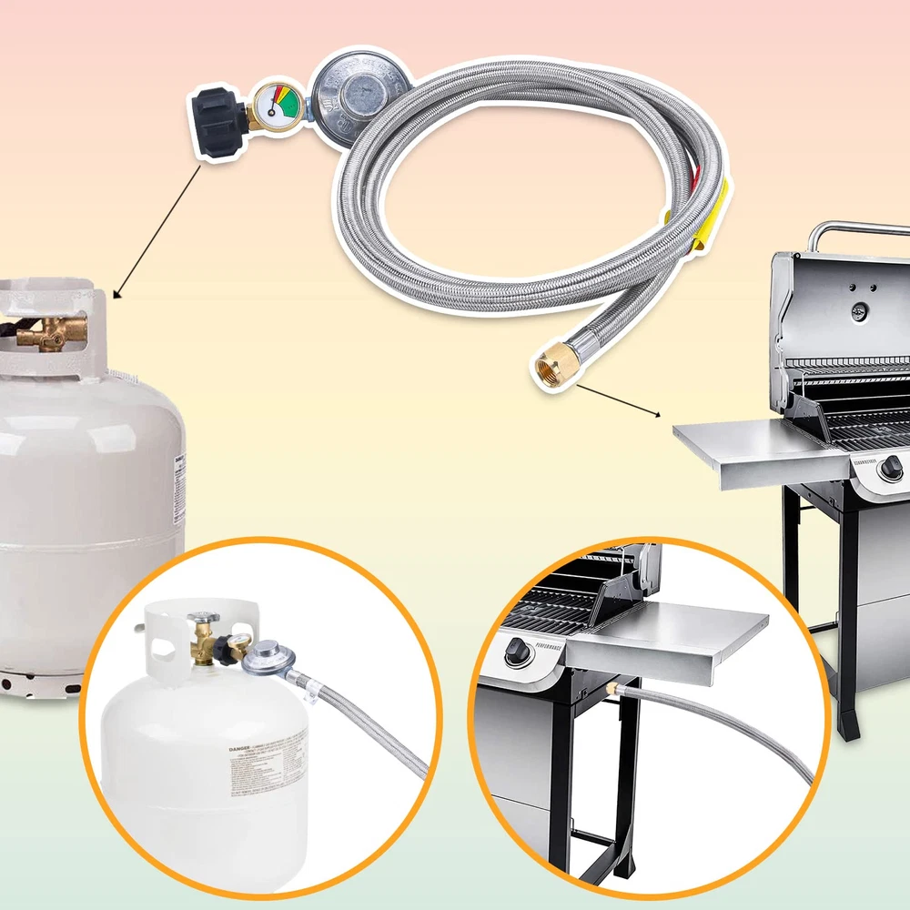 Stainless braided hose prevents whatever animals from chewing through it . The attached propane gauge can detect dangerous leaks and read fuel level at glance for Weber Genesis 300-series gas grills, Genesis Silver C, Genesis Gold ,Genesis Platinum , Spirit E-210/E-310 etc. and most of Char-broil gas grill with side burner,Dyna-Glo dgp350snp-d,mfa350bnp/mfa350cnp ge530bsp-d, dge486ssp-d, dge486gsp-d etc.,Uniflame GBC873W-C, GBC873W, GBC940WIR, GBC940WIR-C, GBC976W, GBC956W1-C, GBC1076WE-C, BH12-101-001-02 etc., most of Kenmore gas grill and most of Easy installation - No tools required, tool-less attachment to tank. It is normal if you hear noise in the regulator, it is the resonance of the gas in the regulator. Connects to QCC1/Type1 LP tanks and cylinders,fits to gas grills, heaters ,fire pit table and most QCC1/Type 1 low pressure gas application.Great for BBQ, camping, tailgating, heating needs or having an outdoor cookout. Provides secure, air-tight connection between grill or fire pit and tank, no gas leaks, ensures safety while using grill, no issues with regulator or gas, air flow is kept stable and at appropriate levels