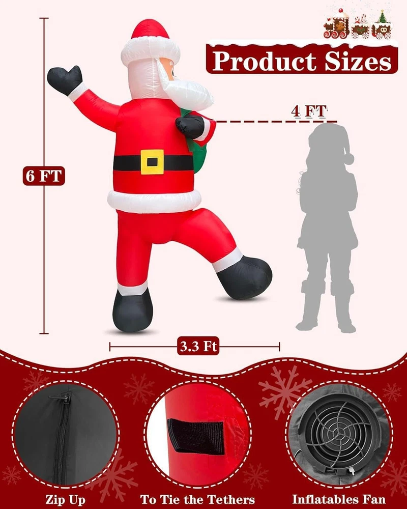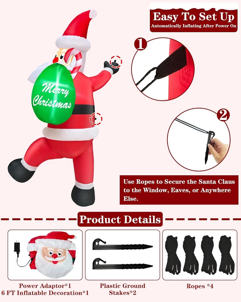 Item Weight: 1.83 pounds Country of Origin: China Color: Multicolor Style: 6 Ft Inflatable Santa Item model number: RH-120-1000U4-1 Cartoon Character: Climbing Santa Claus Occasion: Christmas, Yard, Malls, Walls Type: Does not apply Theme: Christmas Special Feature: Climbing Santa Claus with Gift Bag, Hanging Santa Inflatable, Bui Material: Oxford cloth Brand: Does not apply Product Dimensions: 1 x 1 x 1 inches Item dimensions L x W x H: 1 x 1 x 1 inches gtin13: 313108928979 Light Color: Bright White UPC: 313108928979