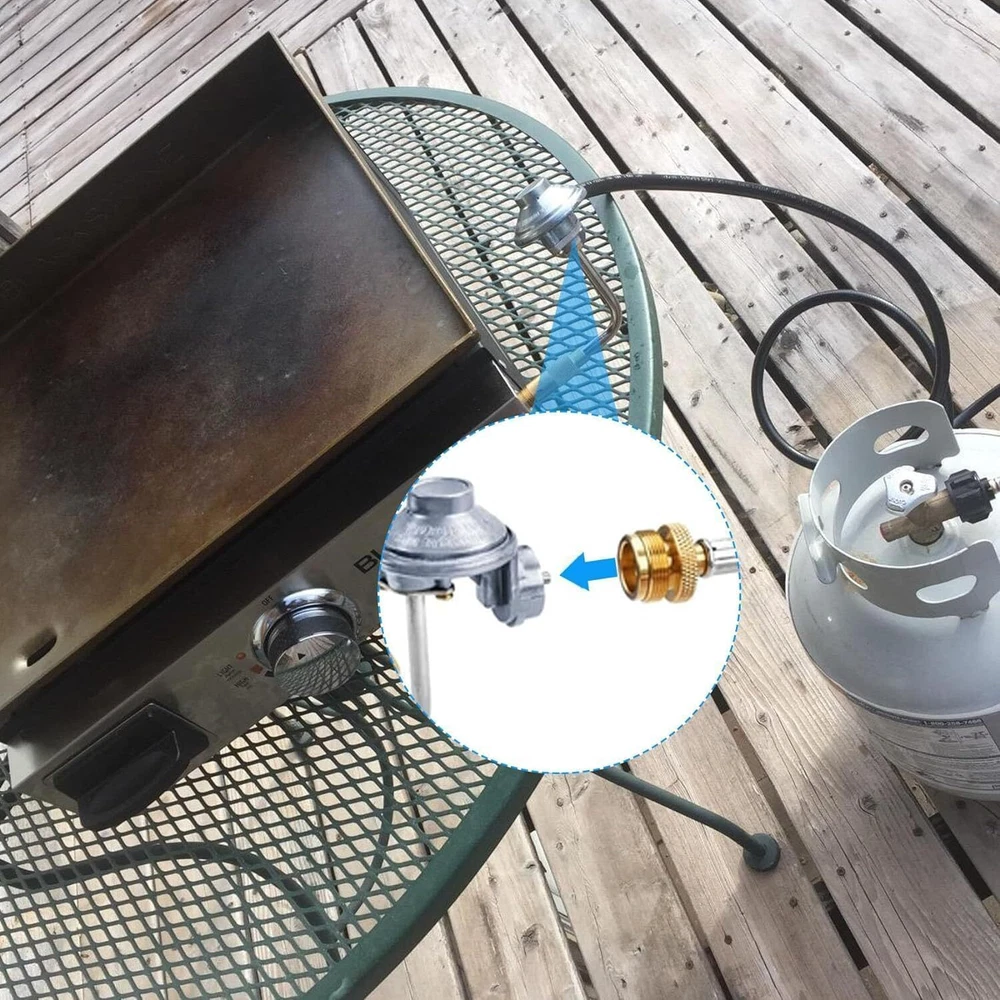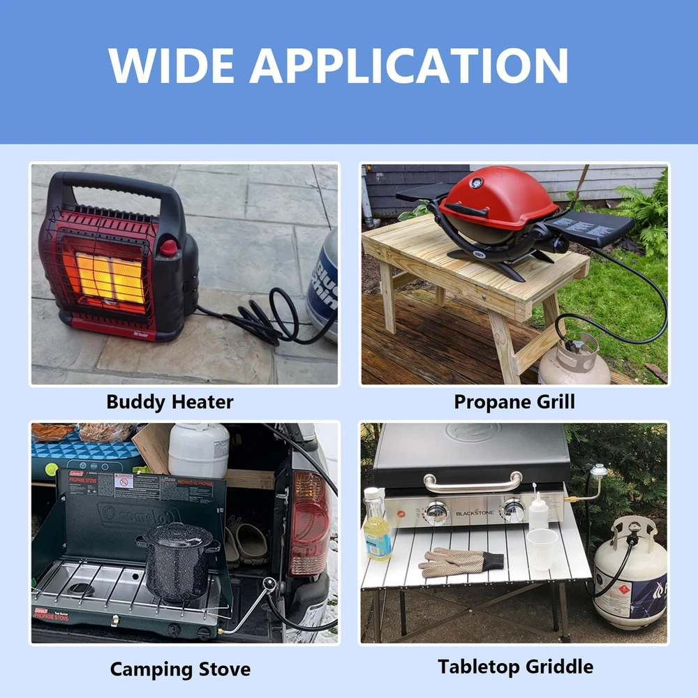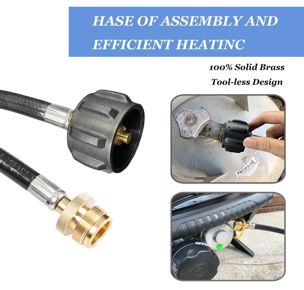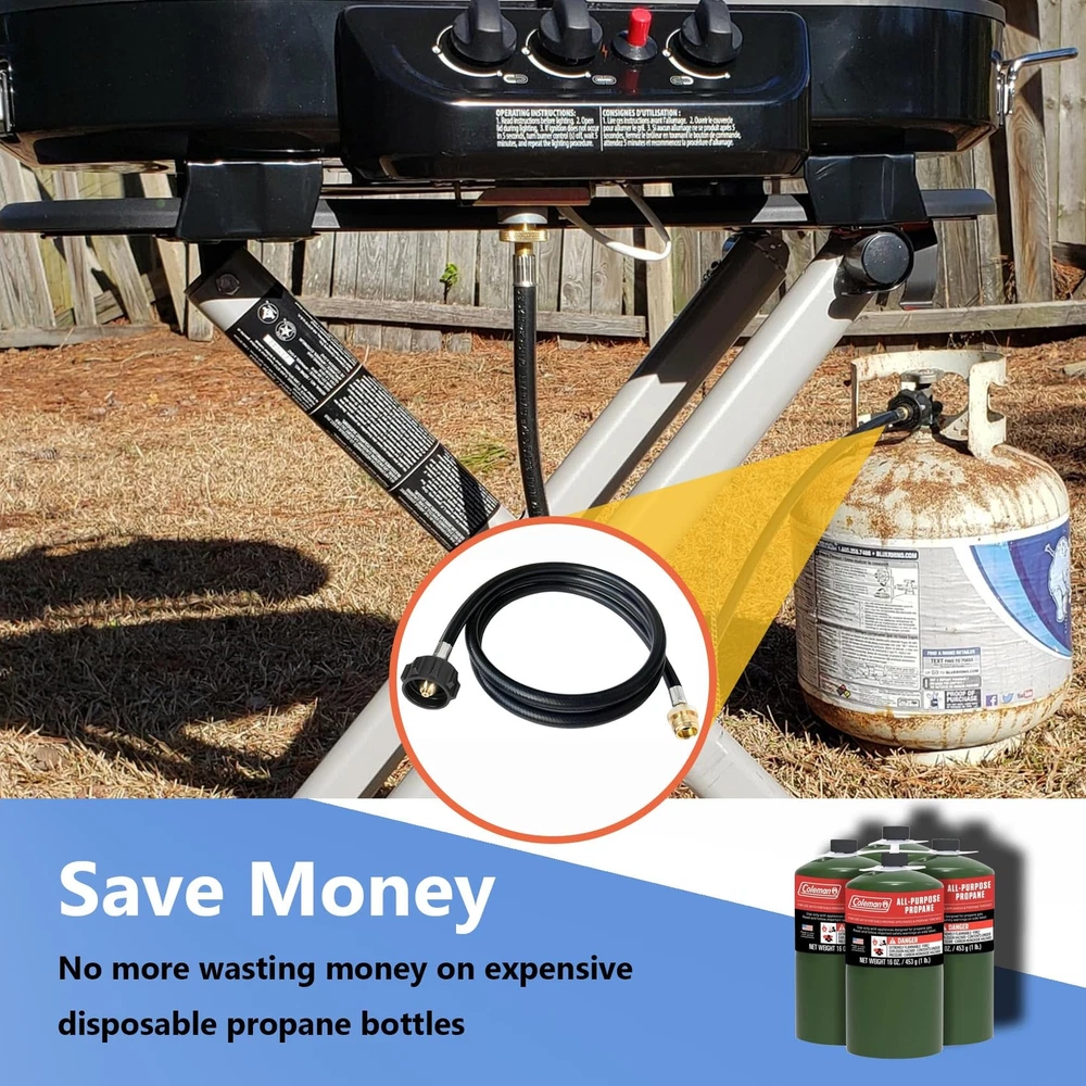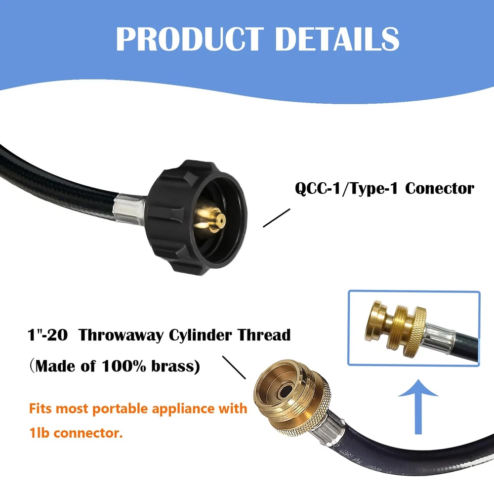 1 lb to 20 lb PropaneTank Adapter Hose: This propane adapter hose with handwheel is 6 ft long with QCC external swivel threads connects 1 lb bottled equipment to a 20 lb propane tank or larger. Easy to use and no more money wasted on expensive 16.4 oz/1 lb disposable disposable propane cylinders. Universal Adapter Hose :This 6FT propane adapter fits Weber Q grills, buddy heater, Coleman propane tent heater, Blackstone grills, camping stoves, portable grills, Weber traveler grill accessories and more.It is suitable for camping, tent heating and other heating needs or outdoor picnics. SAFETY & DURABLE & PREMIUM:Our adapters are made of 100% solid brass, which will not break during use, providing a tight, leak-free connection that is safer and more reliable. This universal adapter hose is made of triple-layer material that is tougher, more weather-resistant, and flame-retardant to withstand different climates and temperatures without cracking. Easy to Install:This adapter hose requires no tools and comes with a handwheel for manual tightening. Attach end of the propane tank adapter's handwheel to a larger propane tank and the other end to a 1-pound fitting on the original propane appliance. After-sales Service: is committed to providing customers with high-quality products and the best service. Before and after purchase if you have any questions about the product please feel free to us, we will provide you with satisfactory solutions.