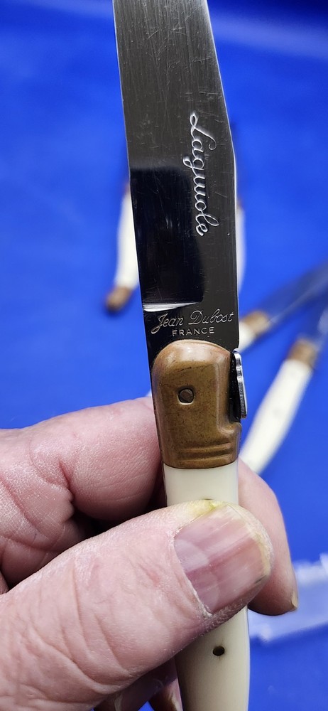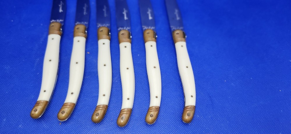 Elevate your dining experience with this stunning set of six Laguiole steak knives from France. Crafted with high-quality stainless steel blades and elegant brass handles, these knives are perfect for any occasion. The beige color of the handles adds a touch of sophistication to your table setting, while the bee accent on each knife adds a unique touch of charm. Each blade measures 4 1/2" in length and 9" total length knife with a straight edge, making them the perfect size for effortlessly cutting through your favorite meats. Whether you're a professional chef or a home cook, these Laguiole steak knives are a must-have addition to your kitchen. Impress your guests and enjoy every meal with these exquisite knives.