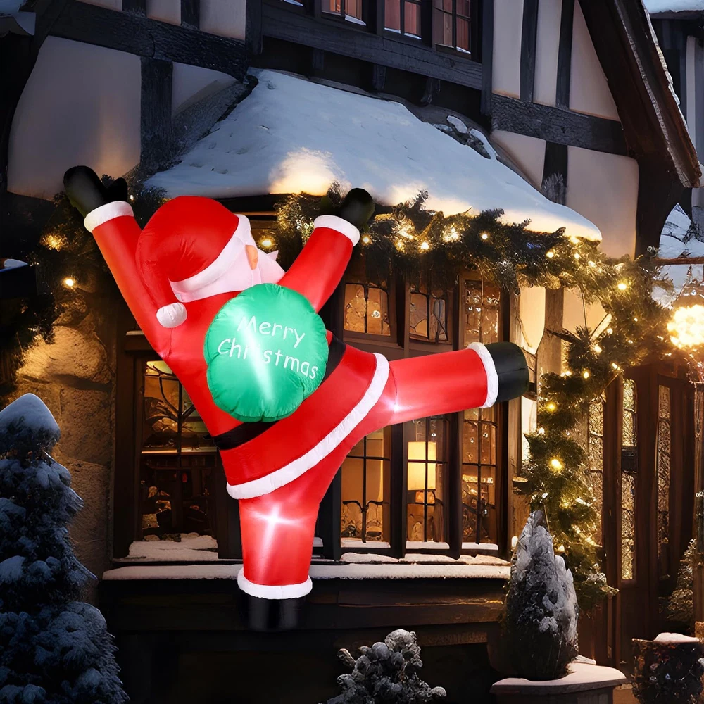 Features: Christmas Santa inflatable is made of waterproof polyester fabric, reliable and long lasting, which is waterproof and weatherproof, LED lights can light up the Christmas garden, for a long lasting using. The blow up Santa Claus is ideal decoration for Christmas, indoor, outdoor, front door, courtyard, lawn, garden, parties, restaurants, cafes, shops, roof, window, door, etc., it will bring everyone a wonderful and unforgettable memory. Specifications: Material: waterproof polyester fabric Color: black, red green, white Size: 5.9 ft in height Package includes: 1 x Christmas Santa inflatable 1 x Blower fan 1 x Adaptor plug 1 x Manual 1 x Rope 5 x LED light Notes: Manual measurement, please allow slight errors on size. The color may exist a slight difference due to different screen displays. Winding risk may exist, please keep our product away from children. Package Include: you will receive 5.9 feet height hanging Christmas Santa Claus inflatables, 5 LED lights, 1 blower fan with a working current voltage of 12V/0.8A, standard adaptor plug, manual and ropes; You just need to connect your blower fan to your Christmas inflatable and plug it in, cute inflatable Santa will show up in minutes Quality Material: this blow up hanging Santa is made of waterproof polyester fabric, reliable and long lasting, which is waterproof and weatherproof, non fading and well sewn, you don't need to worry about tearing or holes, LED lights can light up the garden, for a long lasting using Special Design: the inflatable Santa Claus climbing is different from general inflatable decorations, our large Christmas inflatable can be tied in many places, let you have a Christmas different from the past and the whole neighborhood can see and enjoy, creating a warm and fun atmosphere Easy to Use: this Christmas inflatable outdoor decoration is easy to use, plug in the power supply to inflate, using the rope to tie Santa Claus anywhere you want, easy to disassemble, easy to deflate and store, can be placed in any corner; Please make sure the blower fan is facing up when inflating because facing the ground will affect the inflation effect Practical Decorations: the blow up Santa Claus is ideal decoration for Christmas, indoor, outdoor, front door, courtyard, lawn, garden, parties, restaurants, cafes, shops, roof, window, door, etc., it will bring everyone a wonderful and unforgettable memory