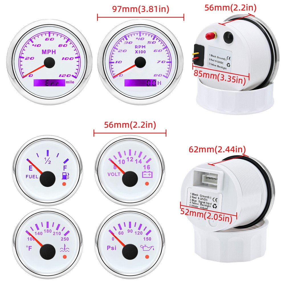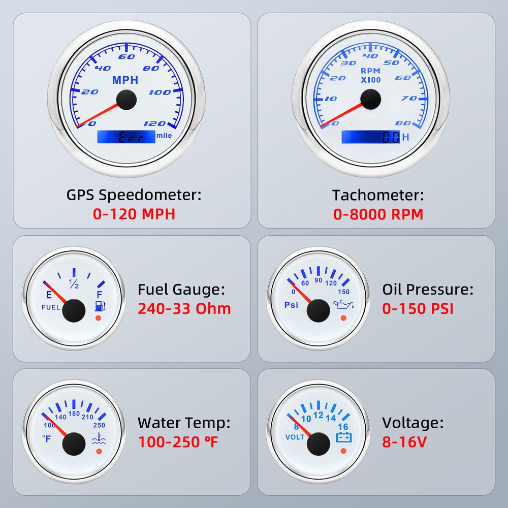 6 Gauge Set 85mm GPS Speedometer 120MPH Tachometer 8000RPM with Senders for Boat 85mm GPS Speedometer 120MPH&Tacho 8000RPM/52mm Fuel/Temp/Oil/Volt with Sensor Features: Suitable for all cars,tractors,vans,vessels,boats,yachts,etc. The signal comes directly from the satellite signal receiver (GPS Speed Sensor) The gauge has the advantages of high precision, quick location confirmation and short start up time. IP67 waterproof and dustproof grade. Stepper motors used for full range of stepping gauges, great feature with its less power consumption,longer life,higher precision,etc. With curved glass (with anti-fogging function). With ultra-wide working voltage design( long-term operating voltage: 9-32V,Maximum up to: 36V (≤ 1 min)). Technical Data: Fixing dimension:85mm(3-3/8 inches) Indicating Range:0-120MPH Item:White&Silver Working Voltage:9-32VDC(12VDC/24VDC) 7 Backlight color:red,green,blue,white,yellow,cyan,purple Tachometer Engine hours:0.0-99999.9H Backlight:7 Color backlight Indicating Range:0~8000 RPM Signal:Pulse For Tachometer,you can substitute for different unit, please contact us before / after purchase or note on the order. Tachometer: 0-3000rpm/0-4000RPM/6000RPM/7000RPM Volt Gauge Sizes:52 mm (2-1/16") Measuring Range:8-16 (V) Backlight: 7 Colors Fuel Level Gauge Sizes:52 mm (2-1/16") Measuring Range:Empty - Full Resistance: 240 (E)-33 (F) ohms Backlight:7 Colors Water Temperature Gauge Install diameter: Φ52mm Indication range: 0~120℃/100-250℉ Input signal: 287.4~22.4 ohm Storage temperature: -40~+85 Backlight: 7 Colors Oil Pressure Gauge Install diameter:Φ52mm or 2-1/16" Indication range:0~10bar/0-145 PSI Operating temperature:-30~+75 Storage temperature:-40~+85 Backlight: 7 Colors Package Includes: 1X 85MM Digital GPS Speedometer Gauge 1X GPS Antenna 1X Tachometer 1X Voltmeter 1X Fuel level gauge 1X Water temp gauge 1X Oil pressure gauge 1x Fuel level Sending Units (240-33ohms) 1X Oil pressure Sensor (1/8NPT) 1X water temp Sensor (1/8NPT) 1X Tachometer Sensor(M16*1.5) Installation Instruction NOTES: The Sending units will be included Payment Delivery details Terms of sales About us Contact us Payment Payoneer is accepted due to payment security and customer convenience concern. To accelerate the shipping process, please clear your payment ASAP after auction closure or placing the order. Delivery details 1. Orders will be processed and dispatched within the handling time after payment is clear, normally it will be handled within 1-2 days. 2. We only ship to confirmed eBay address while you paid. 3. If you have not received your shipment within estimated delivery date from payment, please contact us and we will offer a solution. Please do not worry about the estimated delivery time. Since eBay expands the delivery time to protect the buyer's right. The exact delivery time will take 9-12days, 15-18days. Hope it is OK for you Terms of sales 1. Please contact us within 30 days t from the date you receive your order if you have any issues with the product 2. All returned items MUST BE in the original packaging and you MUST PROVIDE us with the shipping tracking number 3. We will refund YOUR FULL WINNING BID AMOUNT, upon receipt of the item in its original condition and packaging with all components and accessories included. International Customers Please check with your country customs office to determine what these additional costs will be prior to bidding / buying. Import duties,taxes and charges are not included in the item price or shipping charges. These charges are the buyer responsibility About us We are full-time sellers on eBay. We are committed to product quality and customer service. we have sold gauges or sending units on the market over 10 years and welcome any retailed or wholesales business here. Contact us 1.If you have any question or concern, please do not hesitate to contact our customer support team. 2.E-mails are answered Monday through Saturday. Please allow up to 24hours for a response to your message