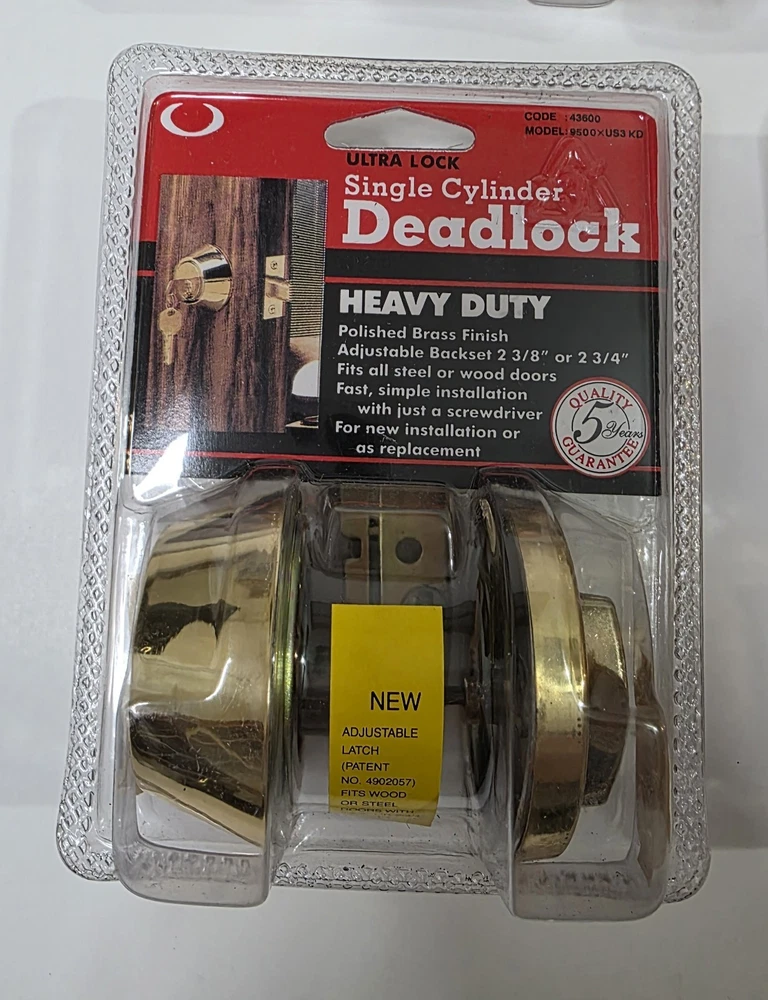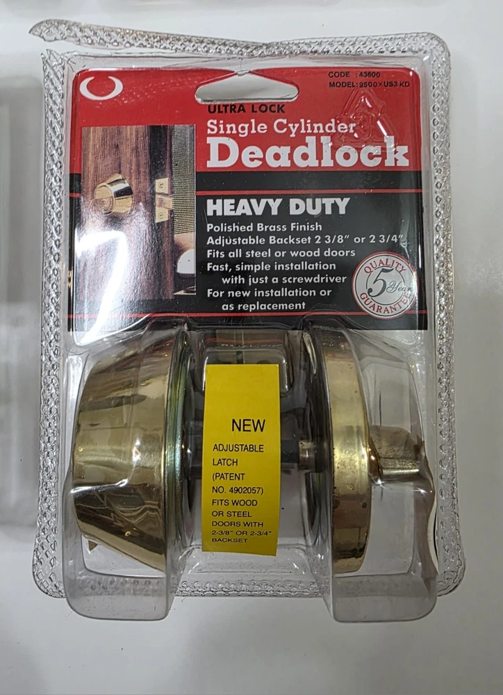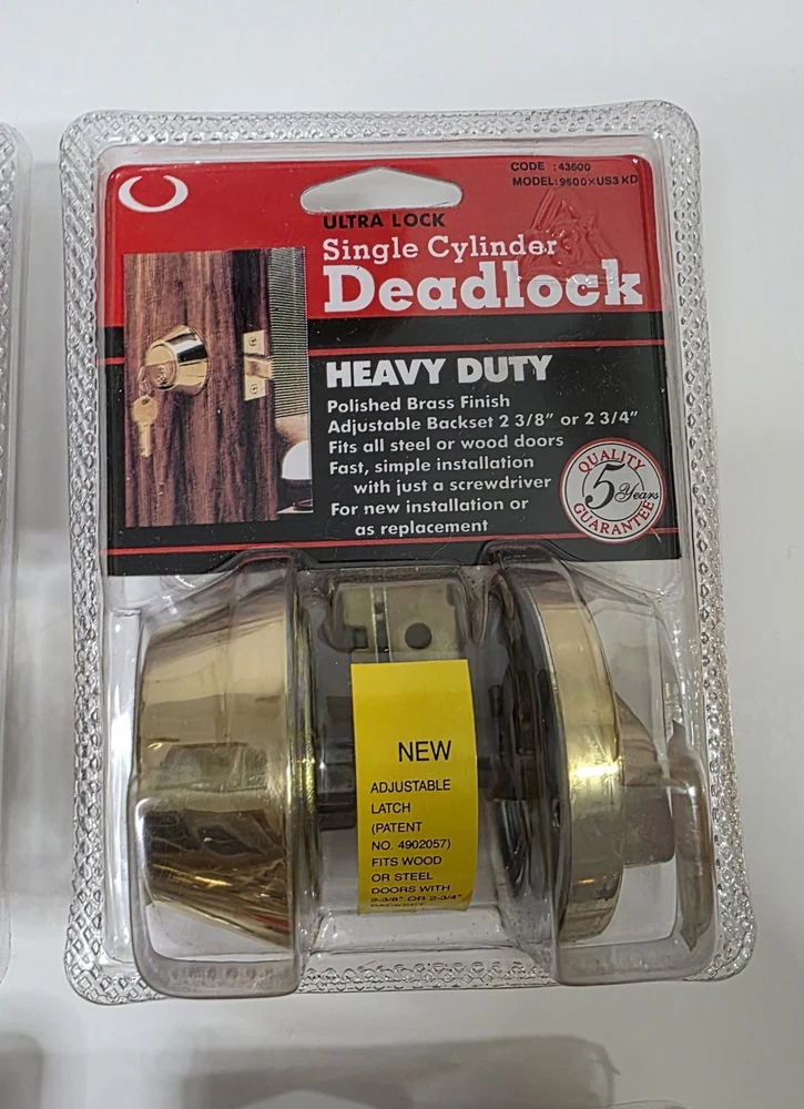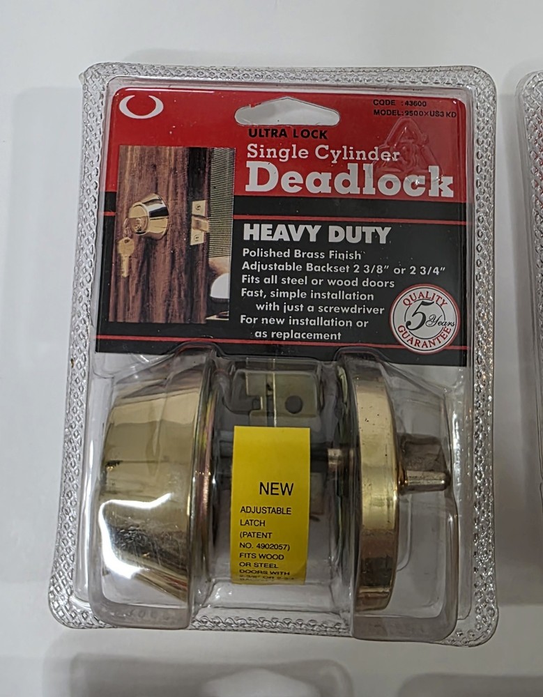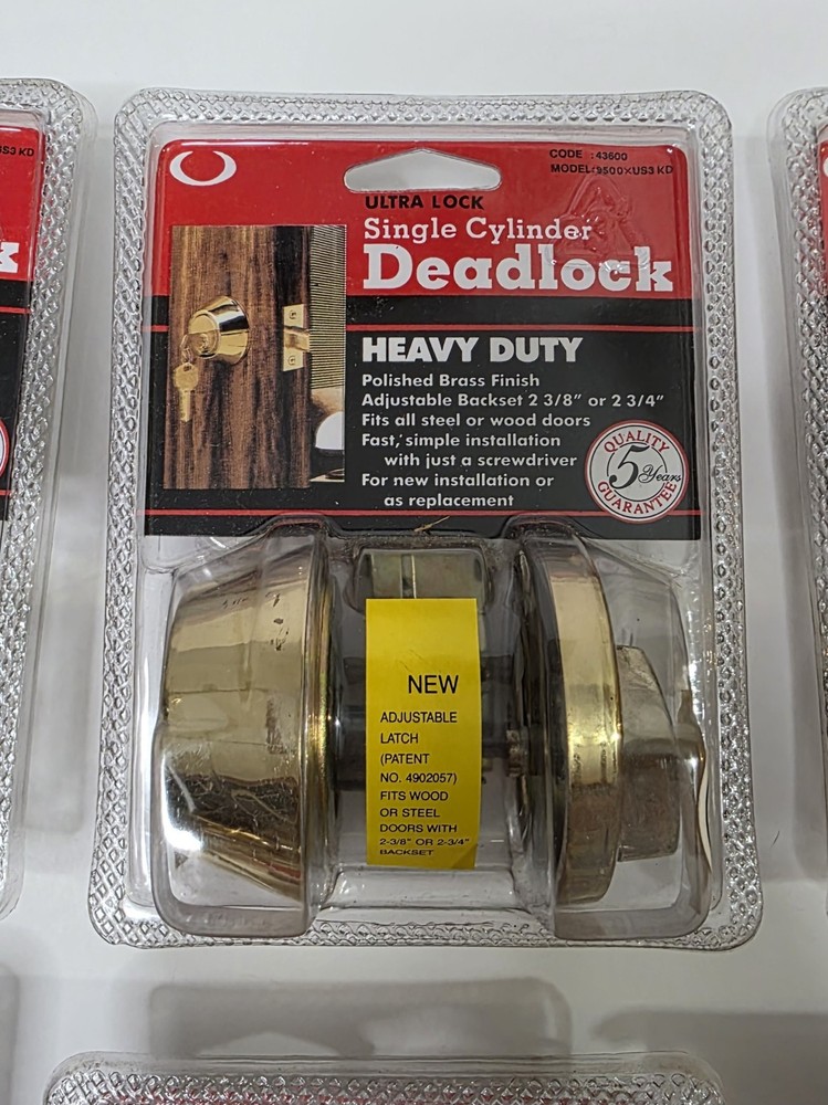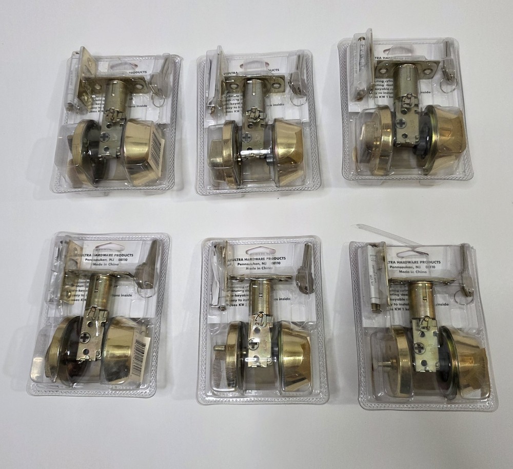 This listing is for a lot of 6 Ultra single-cylinder heavy duty deadbolts in polished brass finish. 5 are factory sealed 1 is open box (see photos) Adjustable backset: 2-3/8" or 2-3/4" Universal fit for most residential wood or steel doors Easy installation with just a screwdriver 5-Year Quality Guarantee (per packaging) Perfect for landlords, property managers, or anyone upgrading multiple doors. Great option for apartments, rentals, or house flips. Condition Note: Some sealed locks may have minor cosmetic wear on the hardware from factory handling or storage. See all photos for condition.