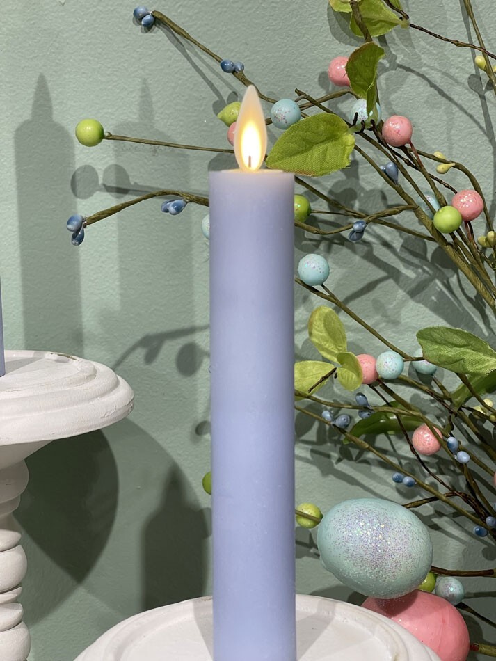 Let your home come alive with these 6 inch Moving Flame Taper Candles! The tapers feature an ivory wax finish with a realistic dancing flame, and the included remote offers convenience and ease of use. Experience the ambiance of candlelight without the worry of an open flame. The perfect taper for your Spring and Summer tabletop Decor! Blue 6.25 Inch Tall not including the flame tip. 7.25 Inches overall height. Realistic moving, flickering flame 6 hour timer function Remote Included 1 X AA battery for each taper sold separately Set of 2 Wax dipped approx 70 hours battery life on one AA batteries (not included). On/off button on bottom. Product Specifications SKU: #LC3326S-Blue Size: 6.25" H x .75" Dia Color: Blue Set of 2 Scent: Unscented Type: Moving Flame Taper Timer: 6 Hours Battery Size: 1 x AA Sold Separately Battery Life: 70 Hours