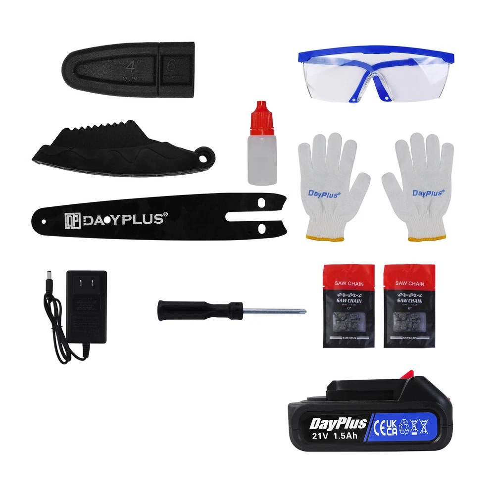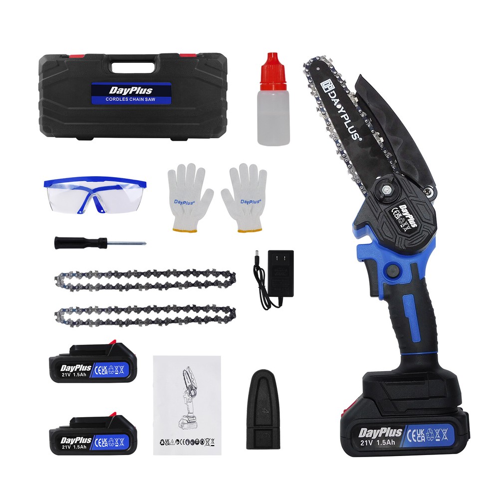 Colour: Blue gtin13: Does not apply UPC: Does not apply Accessories Included: Gloves, Carry Bag, Saw Chains, User Manual Type: Electric Chainsaw Mini Wood Cutter Power Source: Battery MPN: Does not apply Manufacturer Warranty: Lifetime Assembly Required: Yes Free Trial 180days Definition: Return the product for full refund during 180 days Battery Included: Yes Motor: Brushless motor Attachments Included: Chainsaw Power: 1000 W EAN: Does not apply Brand: Dayplus Custom Bundle: No Features: Cordless Color: Blue Voltage: 21V Noise Level: 70 dB