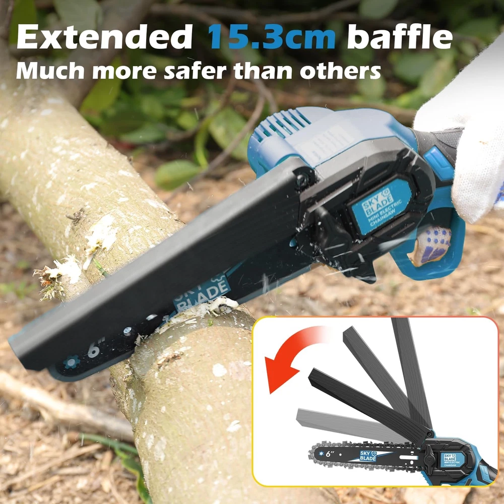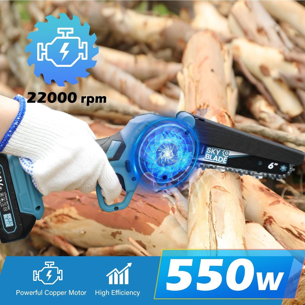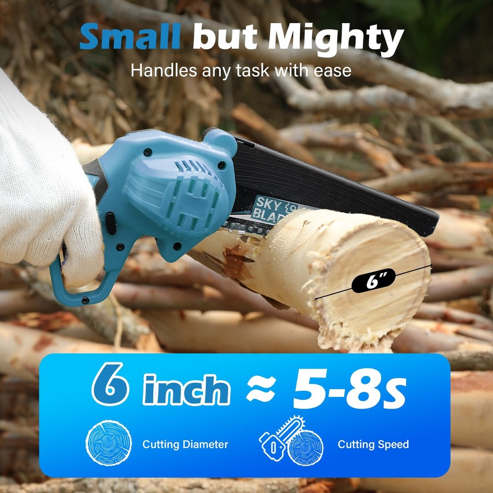 mini chain saw 6" with 2x1500mAh Large Capacity Battery Superior Motor——Stronger, Faster, Longer 550W tree cutter ego pole saw milwaukee pole saw greenworks chainsaw chop saw mini miter saw motosierra de bateria best gift ideas for men mini tools rotorazer 3000 7-in-1 saw fun gifts for men electric tools bow saw saws mens gifts unique milwaukee chainsaw m18 fuel chainsaw gas electric saw for wood cutting gifts for men unique rare finds pocket chainsaw gardening supplies clearance skil tools man gift 【Ultra-Light Ergonomics】2.6lbs Featherweight Champion! The only cordless chainsaw engineered for true one-handed operation. Effortlessly maneuver in tight spaces like attics/gardens, reducing arm fatigue by 67% compared to standard 8lbs models (user test data). 【Dual-Power Endurance System】Industry-first 2×1500mAh Smart Batteries with TÜV-certified protection. Delivers 30+ minutes continuous runtime - cut 150+ logs on single charge! Built-in thermal sensors prevent overheating even in 95°F environments. 【TurboCut Technology】Laser-hardened 6" chain rips through 6" hardwood in 10 seconds (third-party verified). 40% faster cutting speed vs gas competitors. Diamond-shaped air vents maintain optimal torque during prolonged use. 【Dual Safety Switch Mechanism】Innovative physical lock design requires simultaneous activation of the start button and grip pressure sensors to power the chainsaw, eliminating accidental startups. 【LED Light】To improve safety, clarity and efficiency, the tree chainsaw is equipped with an automatic LED light supplying essential illumination in dim environments. 【What will you get?】We offer everything you need for daily maintenance: 2 batteries, 1 suitcase, 3 chains (one pre-installed), 1 oil bottle, 1 pair of gloves, 1 charger, 1 protective glasses and 1 screwdriver. 【Service】We are confident in the quality of the product. In the process of daily use, if the mini cordless chainsaw has quality problems or have any questions about the power chain saws, please contact us at any time, we are always there.