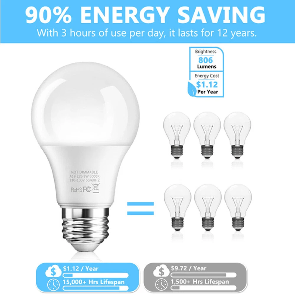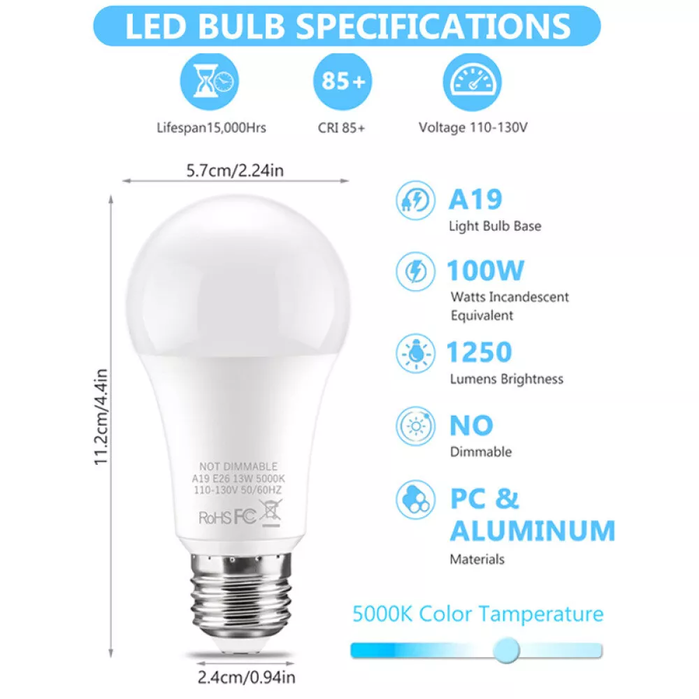 6 LED Light Bulbs 13W / 100W Replacement Daylight 5000K E26 Lamp Daylight White Visit Our Shop H ot Sale Pro motion Contact Us Description 𝐖𝐇𝐘 𝐂𝐇𝐎𝐎𝐒𝐄 𝐔𝐒? 【Bright and Cost-Effective】: The A19 LED bulb, designed with energy-saving LED chips, consumes only 13W of power to match the brightness of a 100W incandescent bulb, significantly improving energy efficiency. This can save you approximately 90% on your annual electricity costs. Opting for multi-packs can lead to further savings. 【True-to-Life Colors】: Our 100W equivalent bulbs boast a Color Rendering Index (CRI) of over 85, close to the perfect natural light standard of 100, combined with a high lumen output of 1250, to not only light up your home but also bring the vibrancy of natural light into every corner, filling every detail with the vitality of color. 【Durable and Long-Lasting】: Crafted with cutting-edge PC materials and advanced manufacturing processes, our bulbs integrate innovative heat dissipation technology, enhancing their longevity to over 15,000 hours—equivalent to the lifespan of 15 traditional bulbs. Say goodbye to frequent replacements and keep your living spaces bright for years to come. 【Your Safety, Our Priority】: Our bulbs meet strict testing standards and are certified by ETL, CE, and FCC, providing stable, flicker-free lighting without glare, effectively preventing eye fatigue and protecting the vision of you and your family. They emit no ultraviolet or infrared radiation, ensuring a healthy lighting environment. 【Easy to Install, Bright in Seconds】: With a traditional A19 shape and standard E26 base, there's no need for complicated wiring; simply screw in for instant brightness and color. Suitable for a wide range of applications, including kitchens, bedrooms, living rooms, bathrooms, hallways, entrances, dining rooms, gardens, garages, basements, porches, terraces, balconies, verandas, front porch lighting, offices, and hotels. 【Worry-Free Purchase, Worry-Free After-Sales】: If you have any questions about the bulbs, please contact us at any time. Our professional customer service team will respond within 12 hours. We are confident in the quality of our products, offering a 90-day no-questions-asked return policy and a 2-year warranty for quality issues. Shop with confidence and enjoy your purchase now. Specification: Lumens: 13W (1250lm) 15000 Hours Lifespan A19 GLS shape: E26 Screw, AC 110-130V 50-60Hz Available in Packs of 6 Bulbs Daylight White Replacement for Incandescent bulb No lead or mercury. 90% saving in running costs Ideal for general purpose room lighting Size :57mm x 112mm Wide beam angle of 180° with a Frosted Cover Package: 6x LED Light Bulbs Payment We accept PayPal Only! Import duties, value added taxes and any other charges are not included, Buyers are responsible for import duties, custom fees and taxes, if any. Please check with your country's custom office to determine the additional costs impose on the item prior to buying. We are absolutely NOT responsible for any import tax or Customs duty. Shipping 1)All items will be shipped to your ebay address .Please update your latest address when you check out,and please make sure to provide us with correct,precise and detailed shipping address. 2)All items will be shipped in 1-2 business days (excluding Sat,Sun & Holiday) after payment received and cleared. For the long-time holiday, we'll post the info on our store and reply you automatically via emails. 3)If you don't receive items over 30 business days,please make sure to contact us before leaving any neutral or negative feedbacks.We'll try our best to help you solve the problem. Return Your satisfaction is our main concern, so we try ensure your order is perfect in every way. However, things can occasionally go wrong and you wish return any item bought from us within 30 days of receipt for a refund or have the item exchanged. This can be for any of the following reasons - You need to exchange for a different item. You simply don't like your item. The wrong item was sent. The order was faulty or damaged. In the result of you wanting to return an item, you have 30 days to do so, in your return please include reason and action you would like to be taken. The buyer is responsible for the return postage, and if an exchange is required then extra postage cost will need to be paid. In the rare case of a faulty item or wrong item received then please get in contact with our customer service team and we will get the problem resolved as quickly as we can.