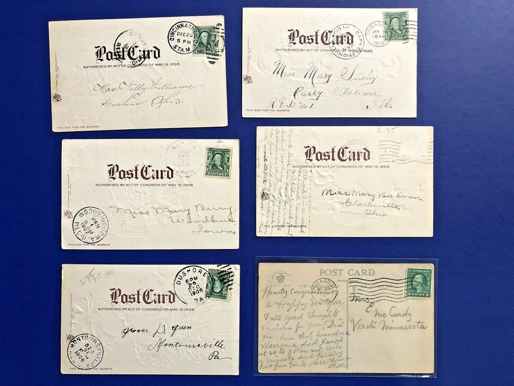 6 New Years Antique Postcards, Children IAP Publ, For Collectors Nice w Value This is a very nice set of 6 NEW YEARS POSTCARDS showing CHILDREN, HOLLY and BERRIES, FLOWERS, and other New Year motifs. There are also postcards with a very attractive young DUTCH GIRL in a shoe boat, a young girl in a cameo portrait, children with a baker, and a child holding a candle under a clock showing 12 o'clock. These postcards were published by International Art Publishing Co. (IAP) in the early 1900s. IAP made postcards during the 1895 - 1915 era and mostly from Germany, and is considered one of the best publishing companies for quality postcards of that era. One of their most famous artists was Ellen Clapsaddle who is highly popular with collectors. Her work especially with children is well regarded and sought after. These postcards are unsigned from different artists and all part of various IAP NEW YEAR SERIES. They are quite colorful and attractive, with lots of details. These postcards are ANTIQUE and were published in the early 1900s. They are all embossed (except 1) and some have GOLD trim. Overall, a nice selection of antique postcards! These are collector items because of their age, being from IAP as the publisher, and their appeal to New Years and Children collectors. The postcards are UNPOSTED (1) and POSTED (6) with cancel dates of 1906-1908, with one being 1916. One has their stamp removed. All but one of the postcards are EMBOSSED and some with GOLD TRIM. Five of these postcards have UNDIVIDED backs. All but one was "Printed in Germany". These are BETTER POSTCARD and good for a collector. The postcards will keep their value! They are sleeved and in good condition. However, please expect some creases, cuts, stains and edge wear due to their age. The photos show the postcards and the backs. The postcards are shipped in a sturdy envelope. We only ship within the USA; we do not ship internationally. USA shipping is with tracking, and we use eBay Standard Envelope mail when the value is under $20 and the weight is under 3 oz; and, we use USPS First Class mail when the value is over $20 or the weight is over 3 oz. We combine shipping whenever possible. If you purchase multiple lots, you can wait and we will send you an invoice for the combined shipping before you pay. In case you have already paid for the lots, we will still combine the shipment and refund you any extra shipping charges back to your account. Please visit our eBay store, VINTAGE POSTCARDS FOR COLLECTORS , for other fine antique and vintage postcards and collectible items. We are a well-established antique postcard dealer, and have a good reputation for meeting our customer's expectations. We have a strong inventory of antique 1900's HOLIDAY and GREETINGS postcards including from publisher's such as TUCK & SONS and INTERNATIONAL ART PUBLISHING (with artist Ellen Clapsaddle). Let us know of your interests and desires. Thank you, and we very much appreciate your patronage!