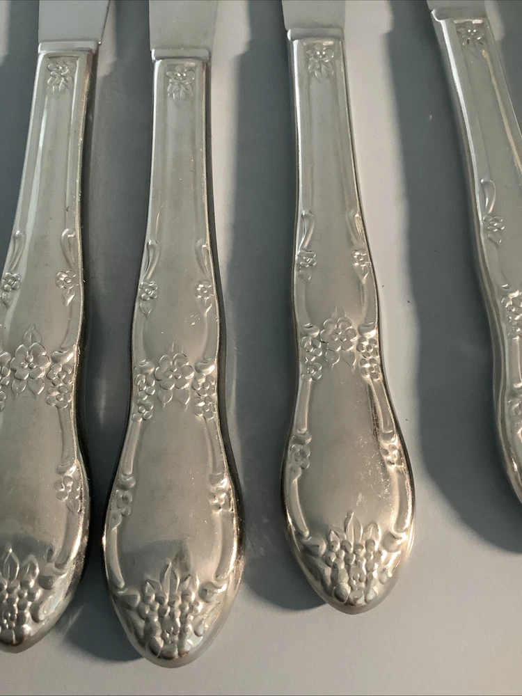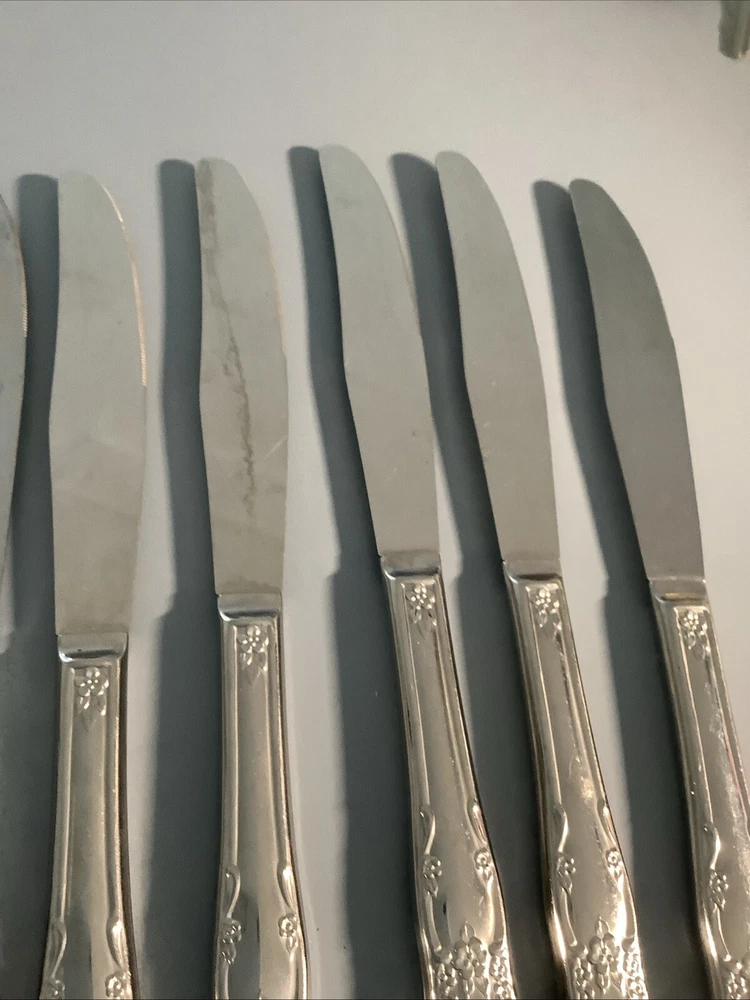 You are getting six dinner night. They are in good. Use condition with every day uses and scratches. They are about 8 1/2 inches long.