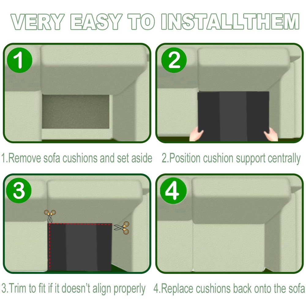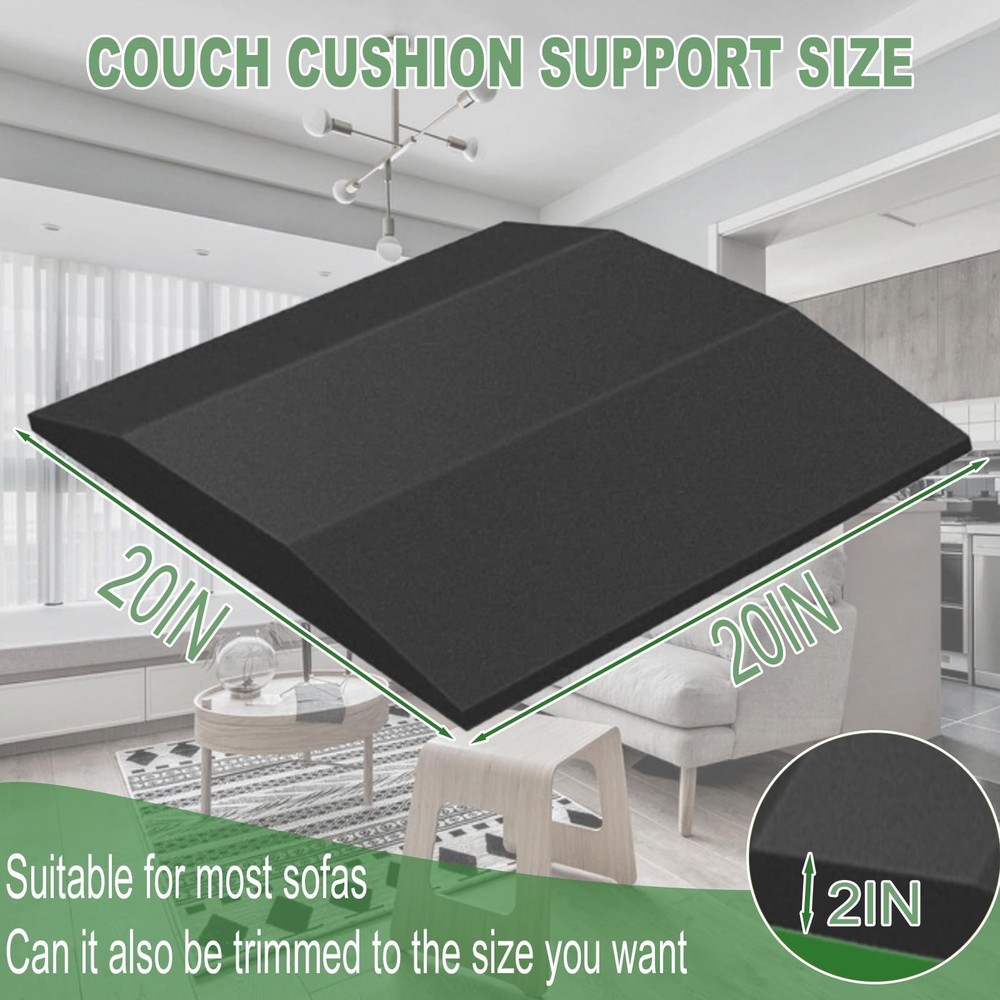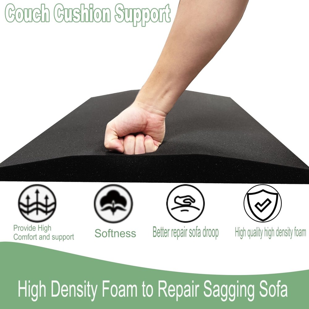 Black 20" x 20" Couch Cushion Support , made with high-density foam to give your sofa cushions the lift they need. Just place it under the sagging seat cushions, and it’ll help repair that uncomfortable sag, making your furniture feel cozy and supportive again Product Name: Couch Cushion Support Product material: Polyurethane (PU) Product size: 20"X20" Product color: Black Product quantity: 6PCS Features: 1.High-quality high-density foam, made of 40D strong and tough polyurethane foam, has a higher density and efficient resilience to ensure that the sofa deforms during the press and can extend its lifespan 2.Sofa cushions can be cut according to the size of the sofa to fit it more perfectly, making the sofa look more beautiful as a whole 3.The arched design of the sofa cushions can effectively repair sunken sofas and support them, making sitting more comfortable and relaxing High Density Foam: Couch Cushion Support Made of 40D High Density Foam, High Resilience, Better Repair Sofa Sagging, Thereby Extending the Sofa's Service Life Cutting Couch Cushion Support: 20"x20" Sofa Support for Sagging Cushions Can Be Cut According to Sofa Size to Fit the Sofa Perfectly Save Your Sagging Couch: Curved Couch Support Cushion Design Can Effectively Repair Sagging Caused by Long-Term Use of the Sofa, Restoring Hardness and Preventing Sagging 6PCS Couch Support: Sofa Cushions Can Be Used on Chairs, Sofas, Lounge Chairs, or Other Furniture with Detachable Cushions, Sofa Cushions Can Provide Long-Term Stable Support and Restore Comfort Comfortable Couch Supports: Sofa Cushions Provide Additional Support for the Sofa Itself, Enhancing Comfort and Support, and Offering a Different Experience