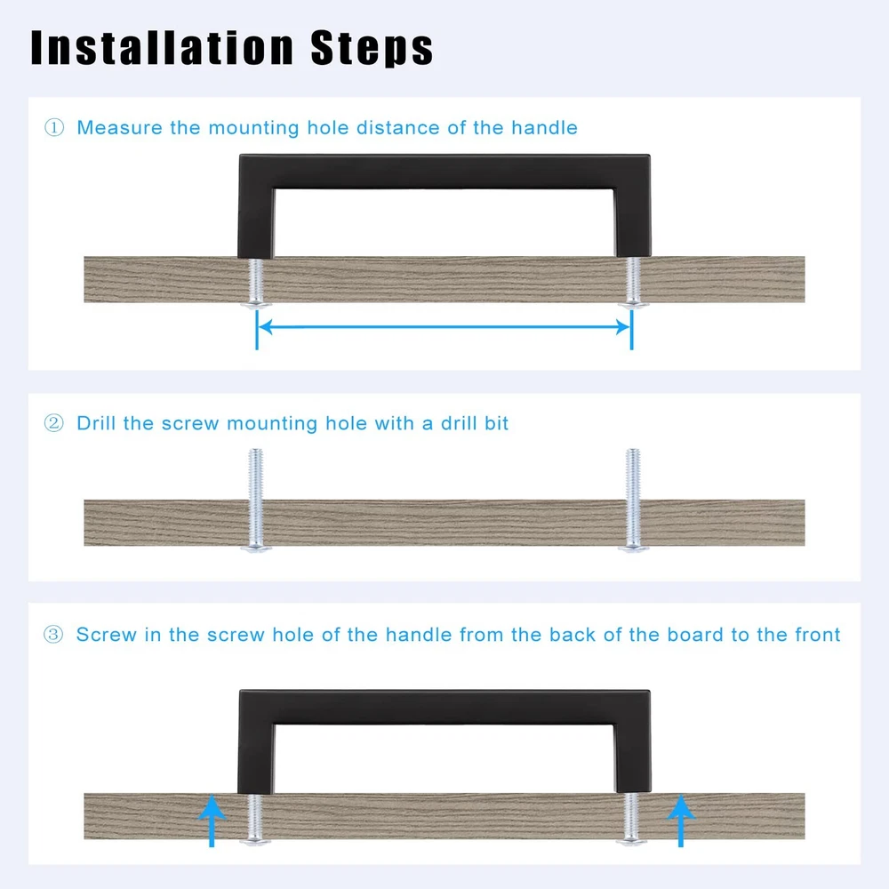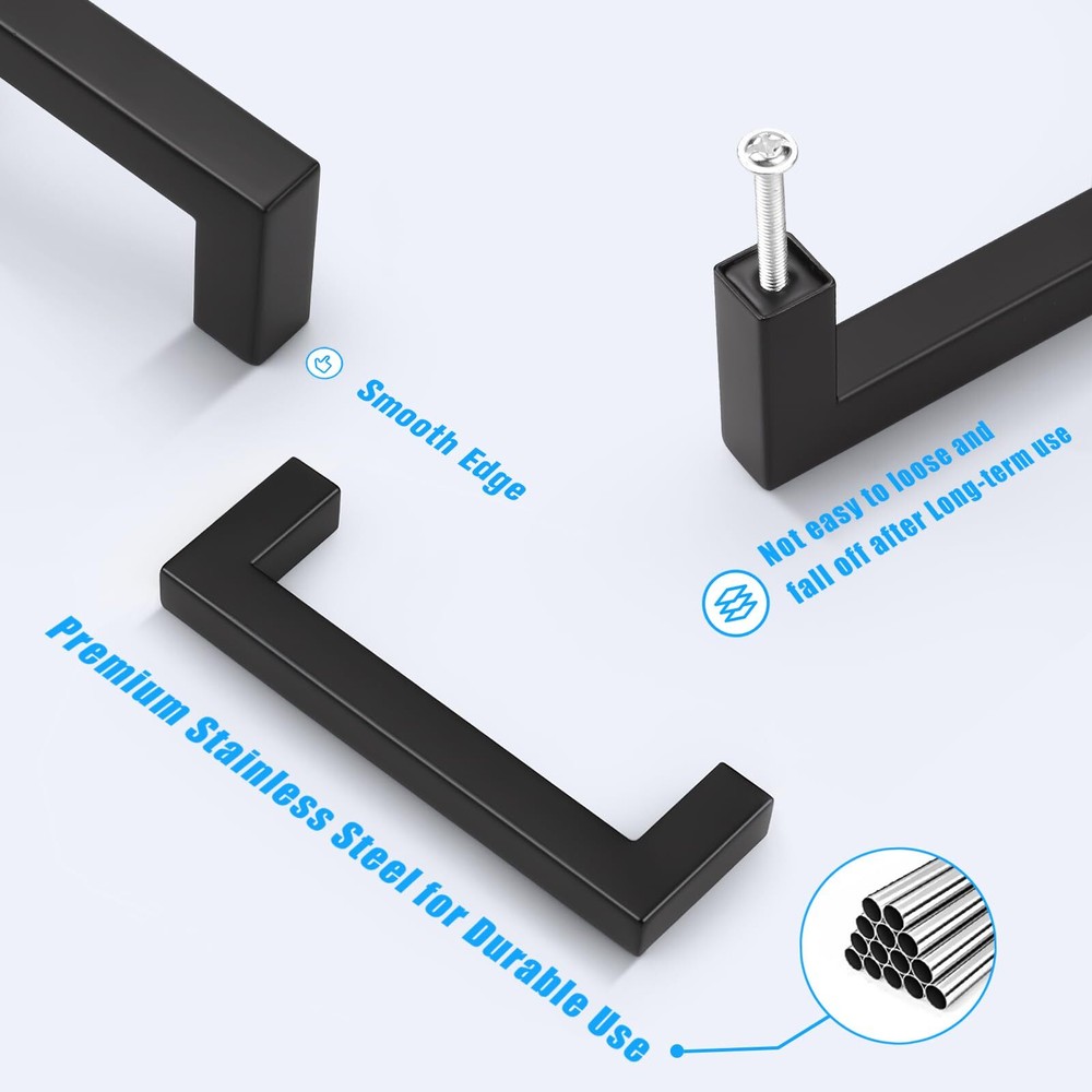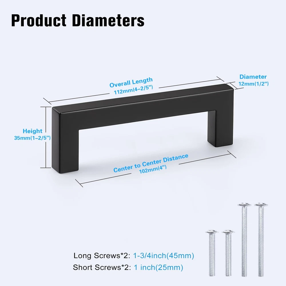 ★MEASUREMENTS - Center to Center Distance: 4"(102mm), Overall Length: 4-1/2"(114mm), Height: 1-3/10"(35mm), Width: 1/2"(12mm); fit for 12mm(0.5")-40mm(1-3/5") door thickness ★MATERIAL - Our Square Cabinet Pulls are made of high STAINLESS STEEL, with a fine MATTE BLACK finish; the smooth surface, beautiful finish and round edge is resistant to rust and corrosion, which is soft to touch and easy to clean, designed for years of use ★ALONG WITH SCREWS - Matched with 1 inch(25mm) and 1-3/4 inch(45mm) screws, the black pulls are suitable for almost all kinds of cabinets and drawers, no matter modern style or classic type(Screw of other sizes are also available in . Please tell us if you need.) ★WIDE APPLICATION - Perfect addition to any kitchen cupboard, cabinet door, desk drawer, vanity, wardrobe, closet, shoe cabinet, chest, bookcase, nightstand and much more; simple but elegant square black handle is also an excellent choice to decorate the furniture ★QUALITY - offer 30-DAY free trail and after-sale service. If there is any quality problem, we are always here to listen