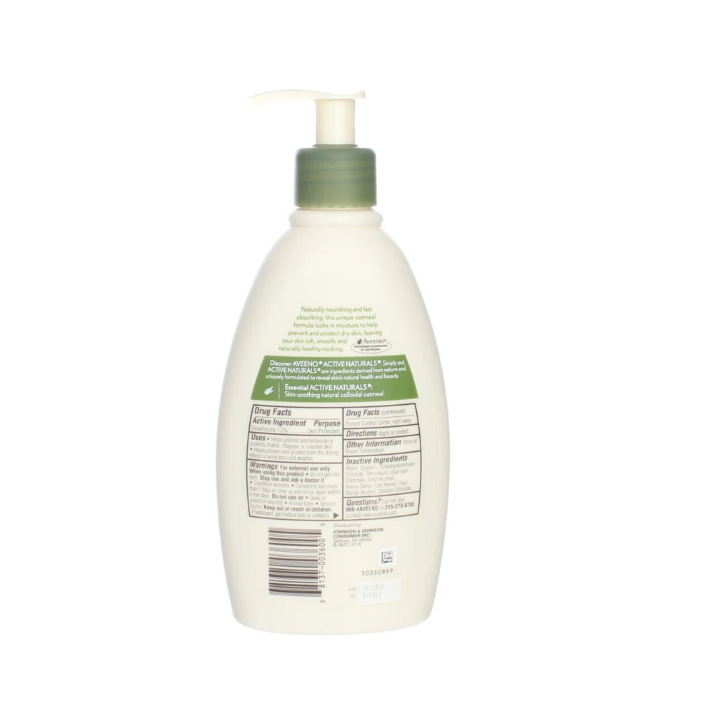 Product Description Aveeno Daily Moisturizing Lotion contains natural colloidal oatmeal blended with rich emollients and is clinically proven to moisturize for a full 24 hours. Its fast-absorbing formula helps prevent and protect dry skin, leaving it feeling soft, smooth and naturally healthy looking. It's gentle enough for everyday use and even good for sensitive skin. Additional Product Benefits Include: skin protectant, fragrance free, non-greasy, noncomedogenic. Ingredients Dimethicone, Water, Glycerin, Distearyldimonium Chloride, Petrolatum, Isopropyl Palmitate, Cetyl Alcohol, Oat Flour (Avena Sativa), Benzyl Alcohol, Sodium Chloride. Instructions Apply to hands and body or wherever skin feels dry or irritated. Product Description Aveeno Daily Moisturizing Lotion contains natural colloidal oatmeal blended with rich emollients and is clinically proven to moisturize for a full 24 hours. Its fast-absorbing formula helps prevent and protect dry skin, leaving it feeling soft, smooth and naturally healthy looking. It's gentle enough for everyday use and even good for sensitive skin. Additional Product Benefits Include: skin protectant, fragrance free, non-greasy, noncomedogenic. Ingredients Dimethicone, Water, Glycerin, Distearyldimonium Chloride, Petrolatum, Isopropyl Palmitate, Cetyl Alcohol, Oat Flour (Avena Sativa), Benzyl Alcohol, Sodium Chloride. Instructions Apply to hands and body or wherever skin feels dry or irritated. Suggested Use Helps prevent and temporarily protects chafed, chapped, cracked or windburned skin. Protects irritated skin. Relieves dryness. Warnings Safety Warning: For external use only. Keep this and all drugs out of the reach of children. In case of accidental ingestion, seek professional assistance or contact a poison control center immediately. Disclaimer The product descriptions and instructions provided by vitabox.com are for informational purposes only and are qualified in their entirety by the information available from manufacturers of the products. You should carefully read all product packaging, and contact the manufacturer with any questions before using a product. While we endeavor to ensure that product descriptions are current, manufacturers sometimes change their products. We are not liable for inaccuracies or misstatements about products. We do not provide medical advice or recommendations. You should not use the information provided by vitabox.com for diagnosing or treating a health problem or disease. If you have or suspect that you have a medical problem, immediately contact your health care provider. Information and statements regarding dietary supplements have not been evaluated by the Food and Drug Administration or any other government agency and are not intended to diagnose, treat, cure, or prevent any disease.