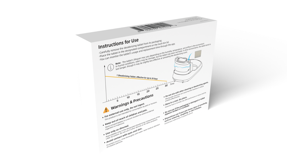 Say goodbye to lingering odors! The Litter IQ® Deodorizer Insert is designed to keep your Litter IQ® unit smelling fresh between cleanings. These ultra-scented tablets drop directly into the waste drawer and neutralize odors fast — no sprays or powders needed. Odor-Fighting Tablets. Helps mask and neutralize strong litter box odors. Designed for Litter IQ® Sized to fit perfectly. Effortless & Mess Free Just drop a tablet in the waste drawer—done. Safe Placement Design Stored inside the sealed waste drawer, keeping it out of reach from children and pets. Includes 6 Tablets per Pack a 3-month supply of freshness in every box. Odor Control Scented tablets neutralize strong smells fast. Perfect Fit Made for Litter IQ® waste drawer. Mess-Free Use Drop-in design, no sprays needed. Safe Placement Stays sealed away from kids and pets. Lasting Freshness 6 tablets = 3 months supply.