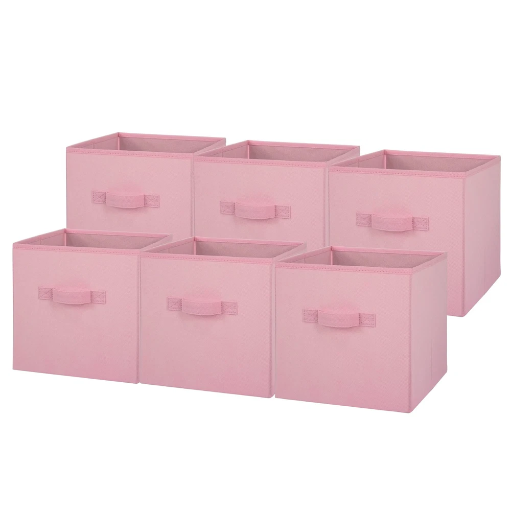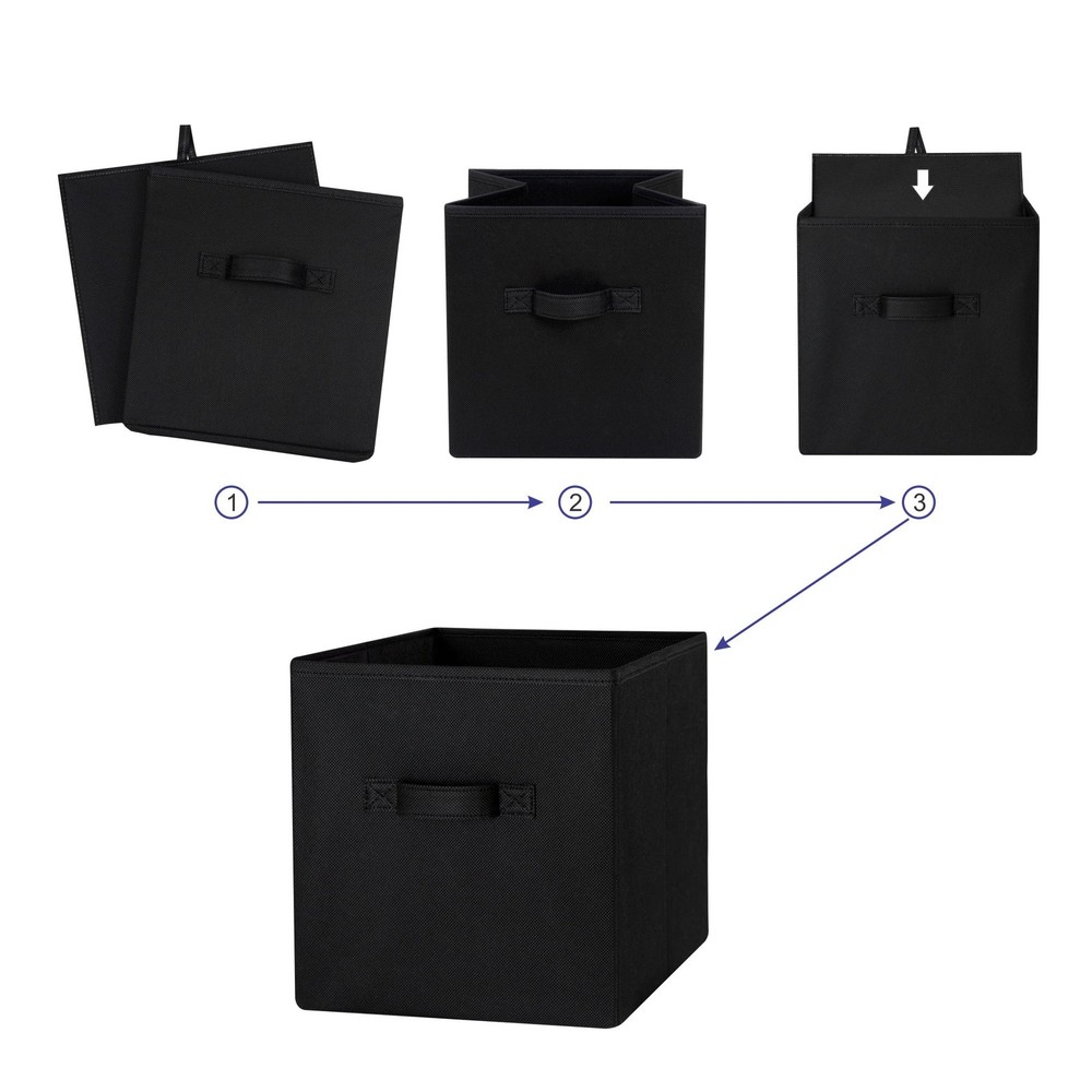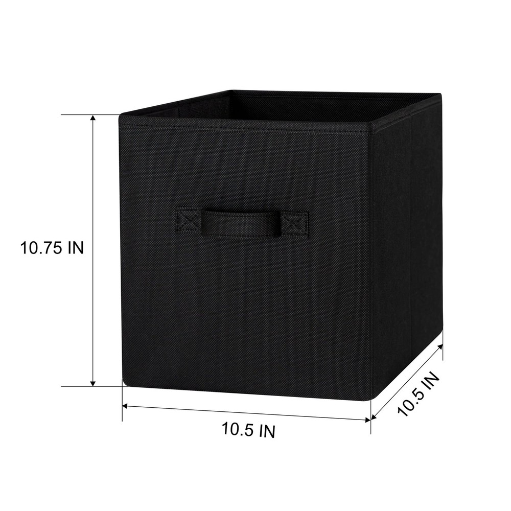 Our Mainstays Rich Black Collapsible Fabric Storage Bins are just what you need to help you create an organized home. Perfect for storing kids to adult clothes, books, electronics and more, these bins' 10.5-inch by 10.5-inch by 10.75-inch size offers plenty of room to keep a wide variety of belongings neatly tucked away and their sturdy handle allows you to pull them off shelves with ease. You can utilize our Mainstays Storage Cube's organizational expertise in your living room, bedroom, laundry room, or dorm room. When not in use, you can easily fold the bin down flat and keep it stored away in your closet for later. The fabric storage cubes are made to fit with our Mainstays Cube Storage Organizers and are designed with a durable fabric that holds up over time. With a variety of colors to choose from, you'll be able to perfectly match your home decor when you get organized with our Mainstays Collapsible Fabric Storage Bins. Helps you to create an organized and comfortable home Includes 6 black cube organizer bins Perfect for pairing with your favorite colors and patterns to mix and match Bin features an easy carry handle on the side that makes it easy to take the bin wherever you need to go Can be used with our Mainstays Cube Storage Organizer units or independently Cubes are collapsible when not in use to maximize your space Ideal for storing books or kids and adult clothing in the bedroom, living room, laundry room or dorm rooms Made of a durable fabric that won't crease easily, has good abrasion resistance and holds its shape Dimensions: 10.5" L x 10.5" W x 10.75" H (26.5 cm x 26.5 cm x 27.3 cm)