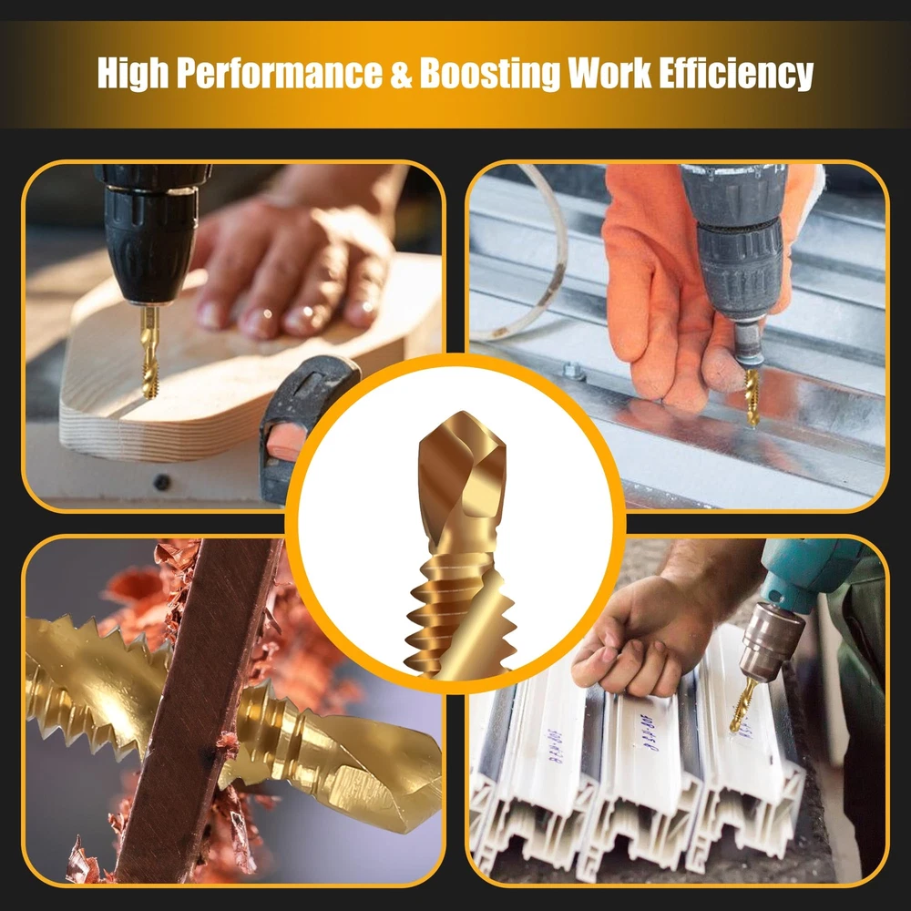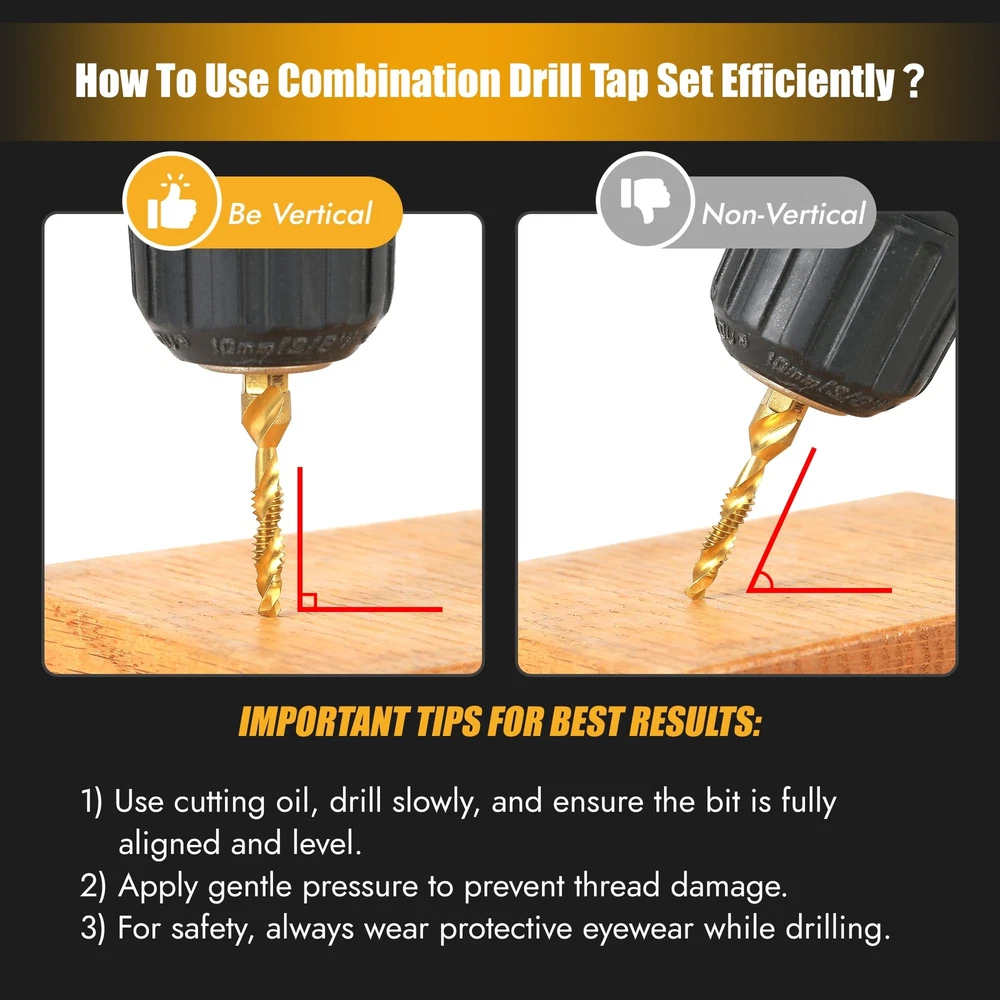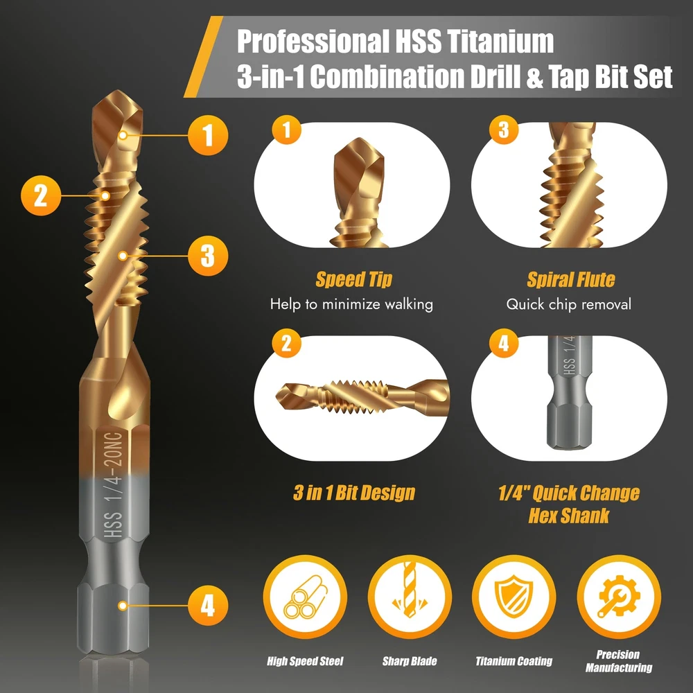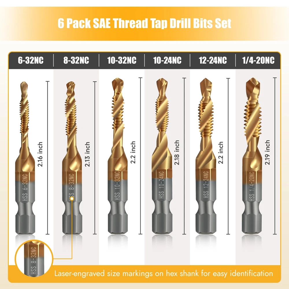 【ALL-IN-ONE HIGH-EFFICIENCY TOOL】 Experience seamless drilling, tapping, and countersinking with our 3-in-1 combination drill tap set. It eliminates the need to switch tools midway, saving you time and costs while boosting work efficiency. A must-have for both DIYers and professionals 【VERSATILE PERFORMANCE】 Perfect for fabricating aluminum, plastic, wood, fiberglass, and other thin soft metals (under 1/8" thick), this tap and drill set delivers reliable performance from workshops to DIY projects. Note: Not suitable for high-hardness metals and stainless steel 【WIDE APPLICATION & COMPATIBILITY】 drill tap bits set including 6 sizes sae tap - 6-32nc 8-32nc 10-32nc 10-24nc 12-24nc 1/4-20nc, with 1/4-inch hex quick-change shank, our drill and tap bit set fits variety power tools, like electric hand drill, impact drill, bench drill, electric screwdriver and other tap machines, ensuring versatility across different applications & scenarioes 【USER-FRIENDLY DESIGN】Each thread tap drill bit is clearly engraved with its size on the hex shank for easy identification. The hex handle’s tapered end minimizes excessive impact, while the extended back taper prevents over-drilling and thread damage. A practical tool for precise and hassle-free use 【IMPORTANT TIPS FOR BEST RESULTS】 Use cutting oil, drill slowly, and ensure the tapping drill bit set is fully aligned and level to ensure straight tapping holes. Apply gentle pressure to prevent thread damage. For safety, always wear protective eyewear while using this threaded drill bits set
