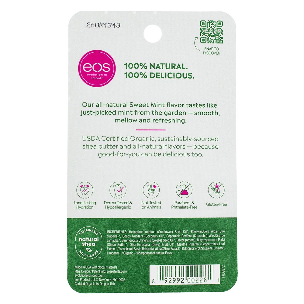 Product Description This eos organic lip balm is made to prevent dry, chapped, cracked lips. It comes in a small, round container that's perfect for traveling. Its petroleum-free, paraben-free design is a healthy alternative to other lip balms. Gives moisture to lips they crave with Smooth on the refreshing essence Refreshing essence of sweet mint and give your lips the moisture they crave Shea butter & vitamin E Long-lasting moisture Ingredients Olea Europaea (Olive Fruit Oil, Beeswax/ Cera Alba (Cire d'abeille), Cocos Nucifera (Coconut) Oil, Simmondsia Chinensis (Jojoba) Seed Oil, Mentha piperita (Peppermint) Oil, Butyrospermum parkii (Shea) Butter, Stevia Rebaudiana Leaf/ Stem Extract, Tocopherol, Limonene Linalool. Component Of Mentha Piperita (Peppermint) Oil. Instructions Smooth on the refreshing essence of sweet mint and give your lips the moisture they crave. Product Description This eos organic lip balm is made to prevent dry, chapped, cracked lips. It comes in a small, round container that's perfect for traveling. Its petroleum-free, paraben-free design is a healthy alternative to other lip balms. Gives moisture to lips they crave with Smooth on the refreshing essence Refreshing essence of sweet mint and give your lips the moisture they crave Shea butter & vitamin E Long-lasting moisture Ingredients Olea Europaea (Olive Fruit Oil, Beeswax/ Cera Alba (Cire d'abeille), Cocos Nucifera (Coconut) Oil, Simmondsia Chinensis (Jojoba) Seed Oil, Mentha piperita (Peppermint) Oil, Butyrospermum parkii (Shea) Butter, Stevia Rebaudiana Leaf/ Stem Extract, Tocopherol, Limonene Linalool. Component Of Mentha Piperita (Peppermint) Oil. Instructions Smooth on the refreshing essence of sweet mint and give your lips the moisture they crave. Disclaimer The product descriptions and instructions provided by vitabox.com are for informational purposes only and are qualified in their entirety by the information available from manufacturers of the products. You should carefully read all product packaging, and contact the manufacturer with any questions before using a product. While we endeavor to ensure that product descriptions are current, manufacturers sometimes change their products. We are not liable for inaccuracies or misstatements about products. We do not provide medical advice or recommendations. You should not use the information provided by vitabox.com for diagnosing or treating a health problem or disease. If you have or suspect that you have a medical problem, immediately contact your health care provider. Information and statements regarding dietary supplements have not been evaluated by the Food and Drug Administration or any other government agency and are not intended to diagnose, treat, cure, or prevent any disease.