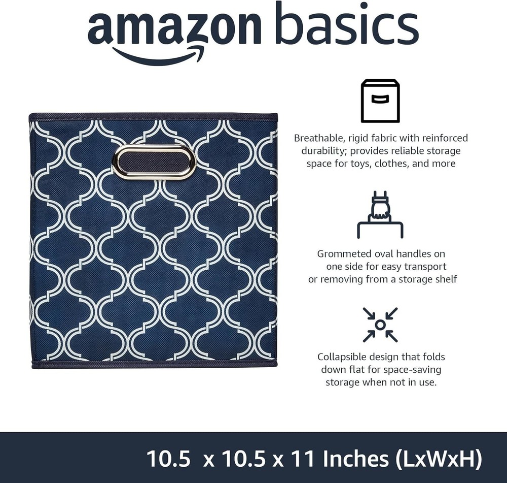 From the manufacturer AmazonBasic Collapsible Fabric Storage Cubes with Oval Grommets - 6-Pack Experience convenience at its best with the AmazonBasic Collapsible Fabric Storage Cubes with Oval Grommets. This set of six bins are perfect for apartments, dorm rooms, cubby hole storage in your craft room or child’s play room, and much more. Whether you’re keeping toys out from underfoot or linens separated and stored, the fabric cubes are a simple, reliable choice. 6-pack of fabric cubes for storage Breathable, non-woven construction Grommeted handles for easy moving Folds flat for space-saving storage Use individually or in most modular cube shelving systems Collapsible Design In addition to helping keep things organized, the bins offer a space-saving design that collapses down for storage when not in use. With structured yet breathable non-woven sides and a flat bottom for extra support, the cubes are sturdy enough to hold a moderate amount of weight without buckling. Dynamic Storage Designed for regular use, the AmazonBasics storage cubes feature grommeted oval handles on either side for easily transporting them between rooms. Use individually wherever necessary, or add to a modular cube shelf for multi-unit storage. To clean, wipe down with cold water and a sponge.