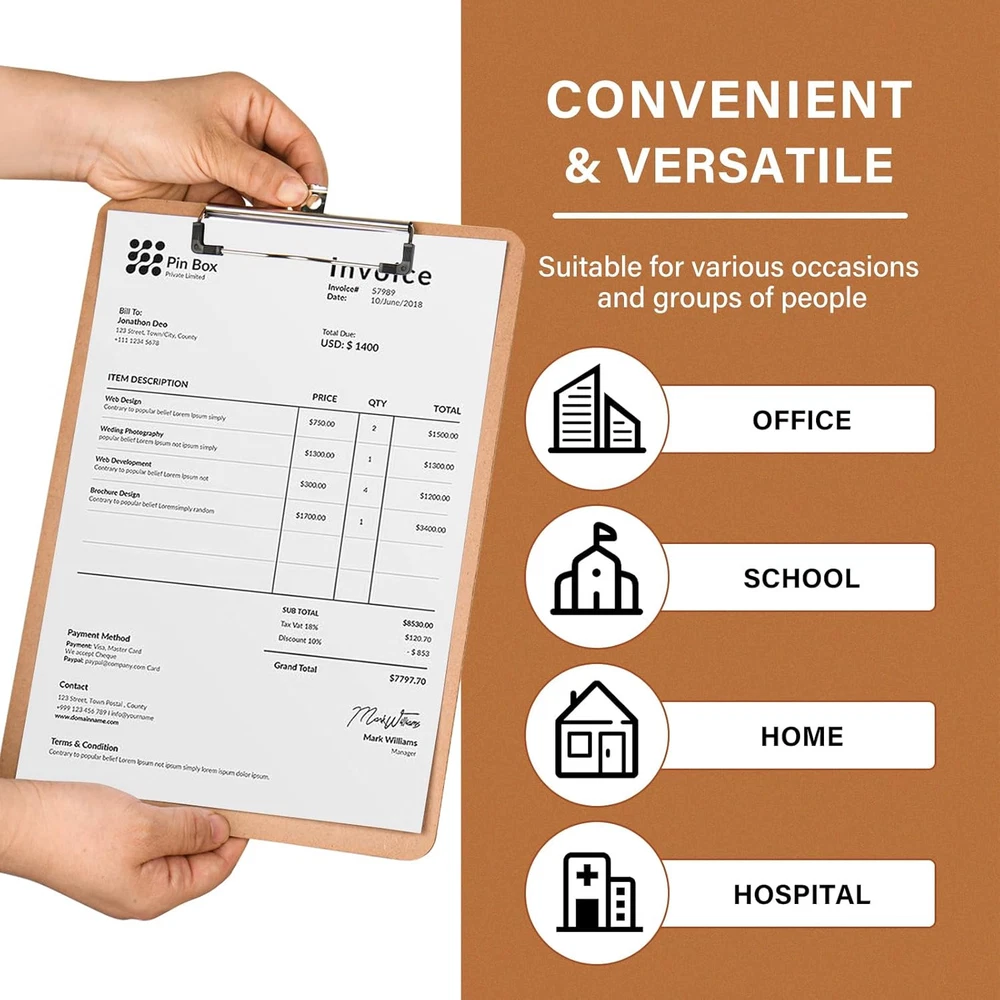 6 Pack Hardboard Office Clipboard, Letter-Size Clipboard with Low Brown Product Details Manufacturer: YEAHVIY Brand: YEAHVIY Item Weight: 2.55 pounds Product Dimensions: 12.5 x 8.94 x 0.04 inches Item model number: md0p-3 Color: Brown Material Type: Wood Number of Items: 6 Fastener Type: Low Profile Clip Sheet Size: Letter Manufacturer Part Number: md0p-3 Color: Brown Material: Wood Brand: YEAHVIY Sheet Size: Letter Product Dimensions: 12.5"L x 8.94"W Powerful steel clip: Worried about paper sheets falling off? Hardboard Clipboards comes with a low-profile steel clip with spring and PP corner ensures a secure grip, holds paperwork securely. Each of these clip boards have a retractable hanging loop, easy to hang it on a wall for quick access and stow away when not needed Smooth and Easy Writing Surface: Premium quality boards construction creates a smooth, flat and firm surface for writing notes, sign documentation or review paperwork and outdoor use. Letter-size clipboard will last years Easy to Use: Brown wooden clipboards with 3mm thickness fiberboard base and rounded edges for long-lasting use and a comfortable grip. Perfect, smooth writing experience for any environment. Lightweight and compact design allows you to easily carry it with you while on the go Measures 12.5" L x 8.94" W, the right size for fitting easily in a backpack. Holds letter-size papers and pads. The low-profile clip allows for easily stacking multiple clipboards together, easy to organize and takes up less space Multi pack clipboards - lightweight and durable designed specifically for your busy paperwork. Widely used in offices, hospitals, schools, clinic, warehouse, home. Loved by business professionals, nurses, teachers, students, lawyers