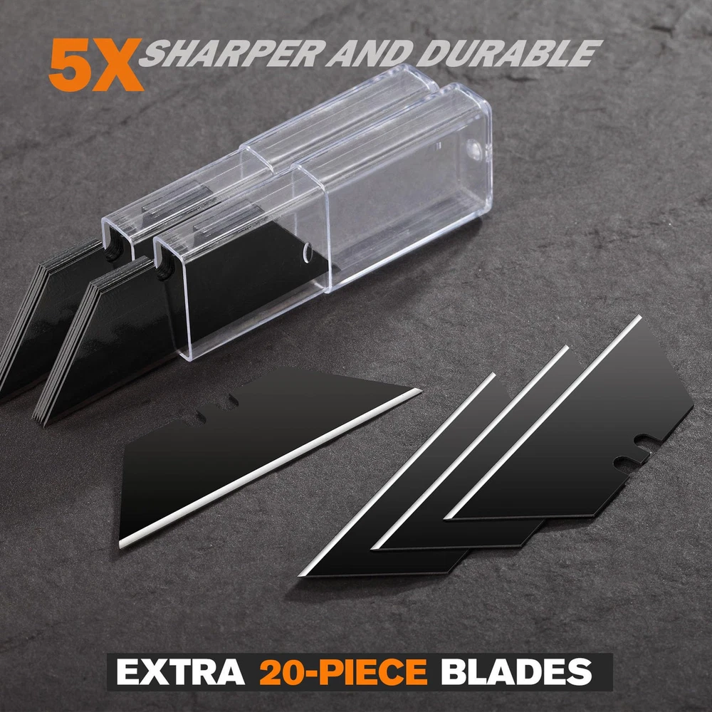 Ultra sharpness and double hardness blade, Perfect for hobby, DIY projects, cardboard, carpet, Rope,boxes, wallpapers, vinyl, rubber, leather, PVC material and etc Comes with 6-pack utility knife, retractable design and folding design. Ergonomical and rubbery handle offers strong grip all the time Blade storage design for easy and quick access. Extra 3 blades storage in the handle Extra 20-piece blades included Quick-change blade mechanism