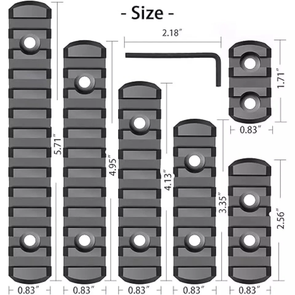 Free eBay listing template designed by dewiso.com 6 Pack Lock Picatinny Rail Aluminum 3/5/7/9/11/13 Slot Set M-Lok Picatinny Rail. About this Item This product is a single Picatinny rail that allows the attachment of all standard 21mm Picatinny-spec, rail-mounted accessories. It provides just enough rail space where you need it for each accessory, and is available in six different lengths. Installation is simple with the included screws and an Allen wrench tool, making it easy to install or remove. The pack includes rail sections with 3, 5, 7, 9, 11, or 13 slots, along with 13 sets of matched screws, 13 sets of locking T-Nuts, and 2 Allen wrenches. The ultra-light rail features solid polymer construction and a low-profile design to reduce bulk. The weight for each length is as follows: 13 slots (0.65 oz), 11 slots (0.56 oz), 9 slots (0.48 oz), 7 slots (0.36 oz), 5 slots (0.28 oz), and 3 slots (0.19 oz)—much lighter than aluminum alloy—while maintaining high strength and safety. These rail sections are injection molded from a proprietary reinforced composite material, offering enhanced strength and durability while keeping the weight low. The beveled ends help reduce snagging and eliminate sharp corners and edges. Contact us We can be contacted at any time through eBay messages if you have any questions, comments or product requests. We will respond to you within 24 hours and do our best to help you out! We encourage our customers to contact us with any questions or concerns! We'd like to be sure you are completely satisfied with your purchase. Payment We accept PayPal, PayPal credit, Visa, Mastercard, American Express, Discover, Google Pay and Apple Pay. Immediate Payment is required. Shipping We provide FAST, FREE SHIPPING to the Continental 48 US States. We do not ship to Alaska, Hawaii, APO/FPO, PO Boxes or any US Protectorates. PLEASE PROVIDEA PHYSICAL ADDRESS. Your order will be processed with in the allowed time frame. Most items ship out with 1-2 Business days after payment is received. Please. not that some orders may be shipped in multiple packages. . Returns If you have any problem with product we can accept return within 30 days after purchase. If you want to return product, you can contact with us. THANKS FOR SHOPPING!