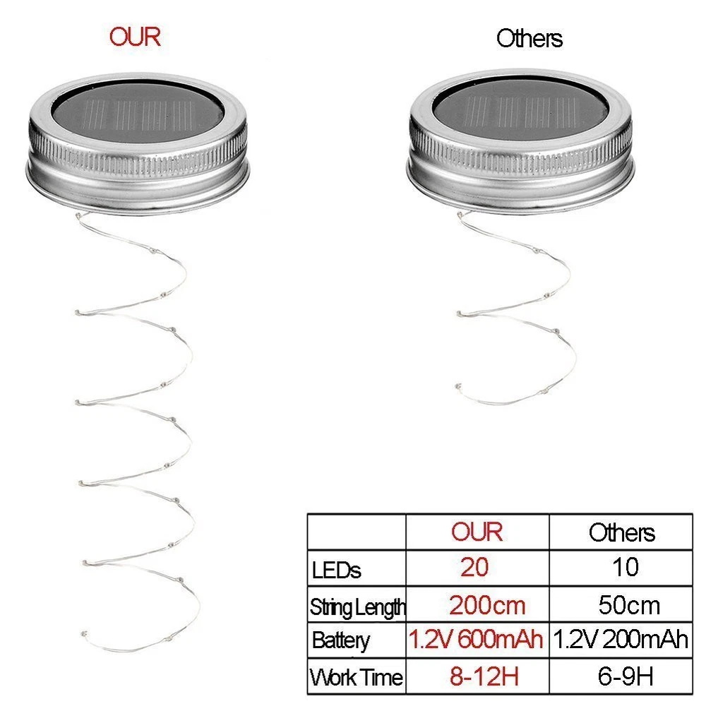 ♥With this mason jar lights, you could make full use of your mason jar to DIY the beautiful garden decor, deck decor, patio decor etc. If you hang it on the tree, when you have a garden party or wedding night, this light will definitely create beautiful ambient out of your expected. ♥Your solar mason jar lid insert fits into most standard glass mason jars. Simply open the jar and place the LED solar light into the mason jar ring, and close the lid - instant mason jar light! Each light has a built in light sensor so that it automatically turns on in the evenings as the light dims. Each light also includes and On/Off switch underneath the lid. User Manual: 1.Find the On/Off switch underneath the lid,and turn it on. Automatically turn ON/OFF by light sensor(Build-in the Lid), the light will turn ON when the dark,and the light will turn OFF when the daytime. 2.If the lights not bright, please put the lid under the sunny for recharging first. 3.Screw on the lid with your mason jar,hung it anywhere you like,suggest under the direct sunlight. Warning: Please keep the switch on, when you put the solar panel under the sunlight to get charged Please tear the protective films off before you install the mason jar lights into the mason jar lids Please keep the surface of solar panels clean, because the dust or something else will affect the efficient of charging Specification: Light color: Warm White Led Light Quantity: 20 lighting mode: Always(does not flicker) Charging Time: full recharge need 6 hours. Working time: 5-7 hours when the battery fully charged Package includes: 6 x Solar mason jar lid with led string lights(AAA Rechargeable Battery Included in the lid) (Manson Jar Not Included) Solar Powered Mason Jar Lid Lights. - Energy Saving & Environment Friendly. 100% solar powered solar panel, no requires external wiring. 1.2v/600mAH AAA rechargeable battery included. It need take 6-8 hours charging time by fine sun light, light up for about 8-12+hours. Recycle Discarded Mason Jars a Beautiful Lights. - Popular Solar Mason Jar String Lights Lid,be good decorations around apartment. Soft color easy make a indoor romantic atmosphere for family. Waterproof Regular Standard Mouth: The mason jar lid including waterproof gasket to make a better waterproof. Fits for all regular mouth mason canning jars.Great for outdoor garden patio deck wedding Christmas parties. Automatically Turn ON/OFF Smart Light Sensor. - Lights will turn ON when the dark,and turn OFF when the daytime. Each light includes an On/Off switch under the lid, turn it on before charging by solar. 100% for long life used. Any problem can us first for free, we will give you a prefect solution and provide you the best .