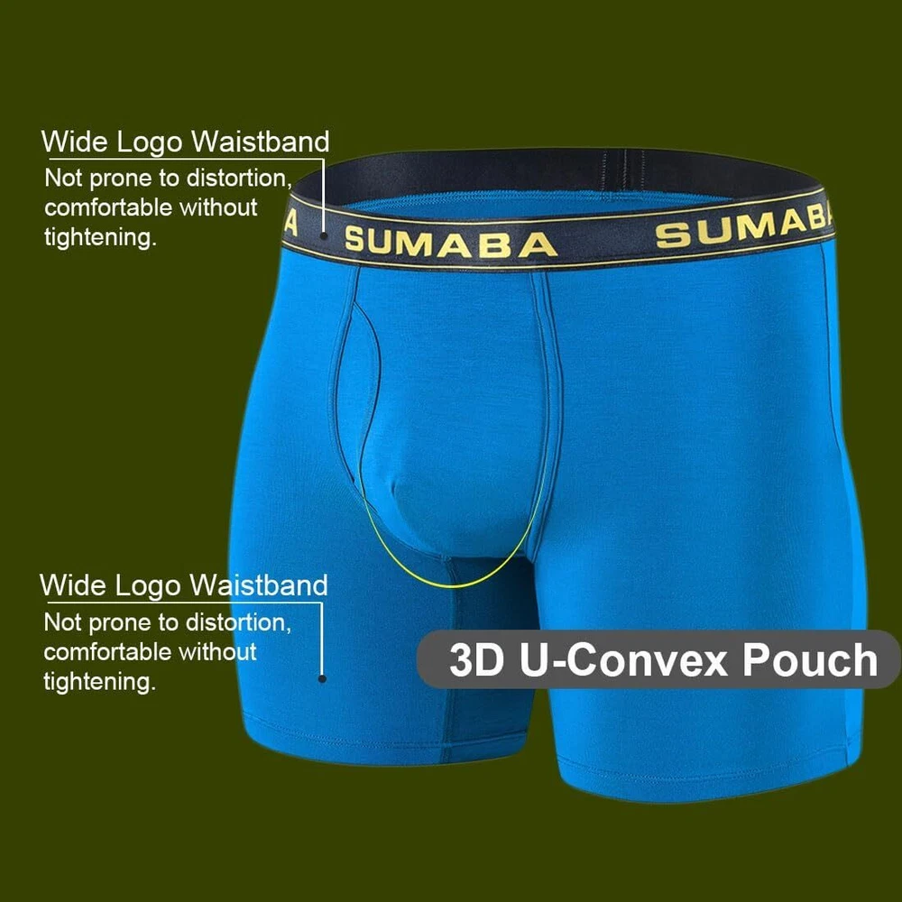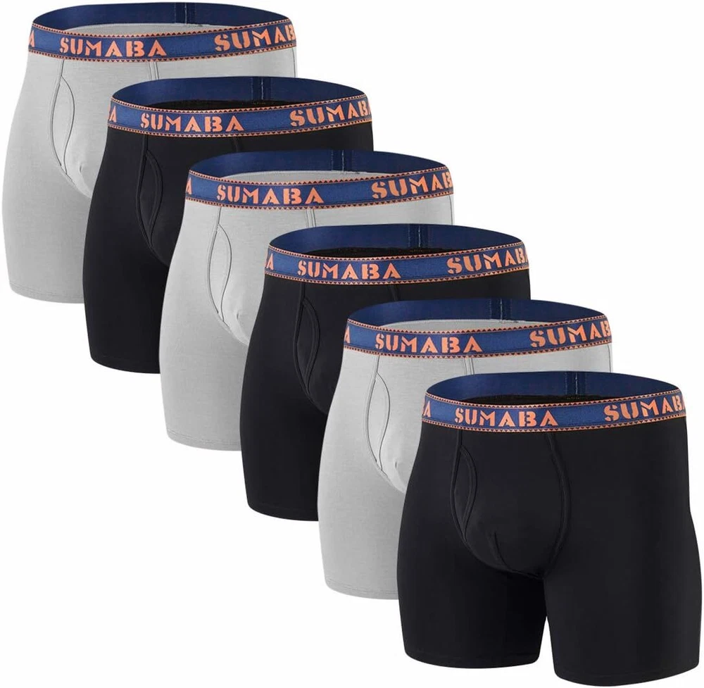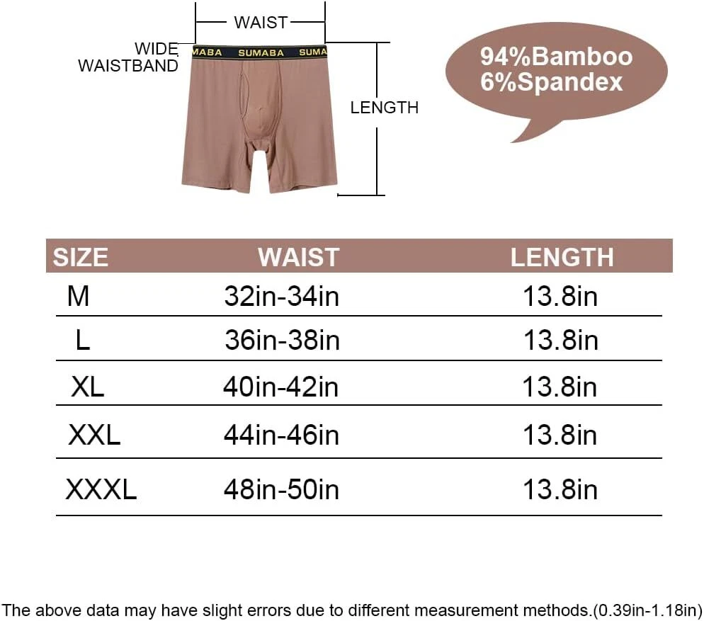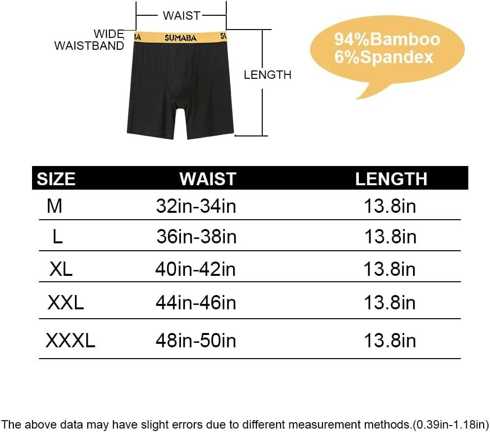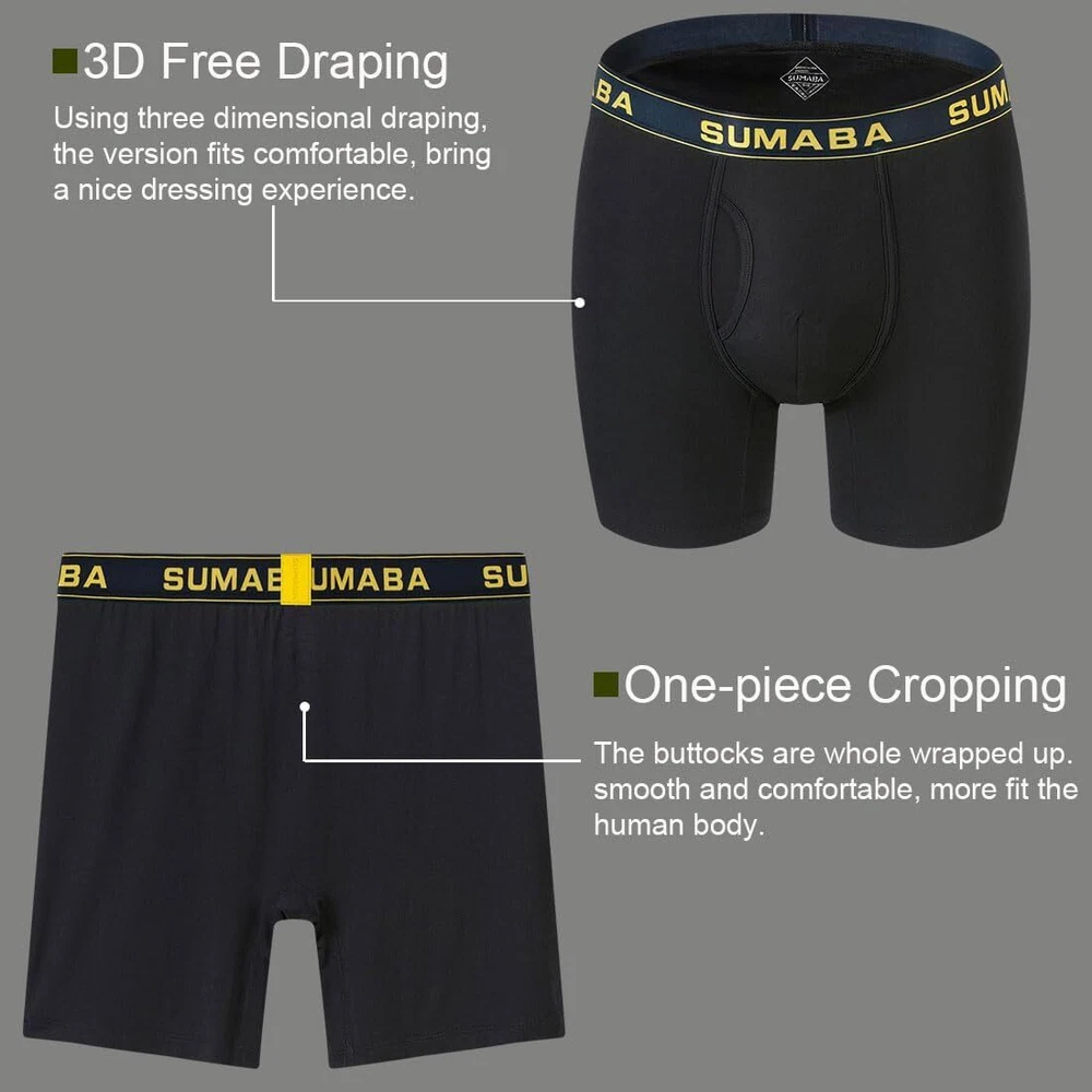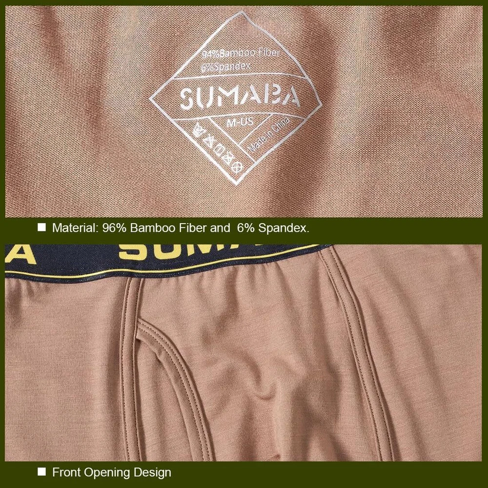Product Description SUMABA Moisture Wicking Underwear for Men KEY FEATURE: Premium Underwear Material: Made from 95% Bamboo Fiber and 5% Spandex, Super soft, Breathable, Stretch, Anti-Wrinkles. No Ride Up & Avoid Thigh Friction: With 6" Longer Leg Length, No Ride Up More Fitted to the Leg, and Effectively Prevent Pain Caused by Leg Friction. U-Pouch & Open Fly: With U-Pouch Design, Can Provide Good Support to Men. Pocket Open in Front is Easy-Go When Nature Calls. Tag-Free Label and Logo for All-Day Comfort. Healthy Fabric and Soft Touch: Bamboo Fiber is a Natural Material More Skin-Friendly and Feels Very Soft. Smooth Non-Chafing Stitching: No Sides Visible Seaming and Back Seam Feel Smooth on Your Skin. Material: 94%Bamboo Viscose and 6%Spandex The fabric is very soft, skin-friendly and breathable, leaving you comfortable all day long. No Roll Waistband The 1.38 inch wide waistband does not tighten the waist and is comfortable without marks. Mens Underwear with Pouch Open Front Double layer pouch open front , three-dimensional space is more comfortable and convenient. No Inductive Hot Dtamping Label No feeling label, more comfortable and frictionless.