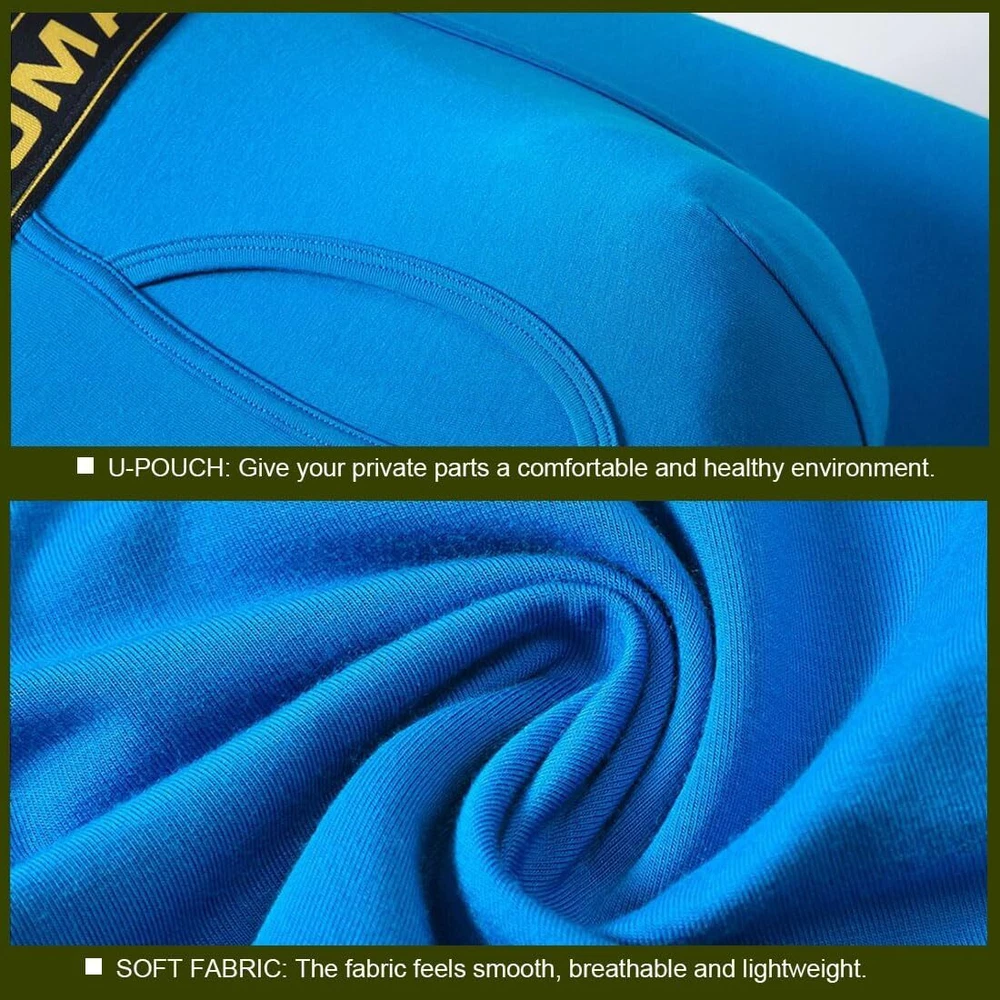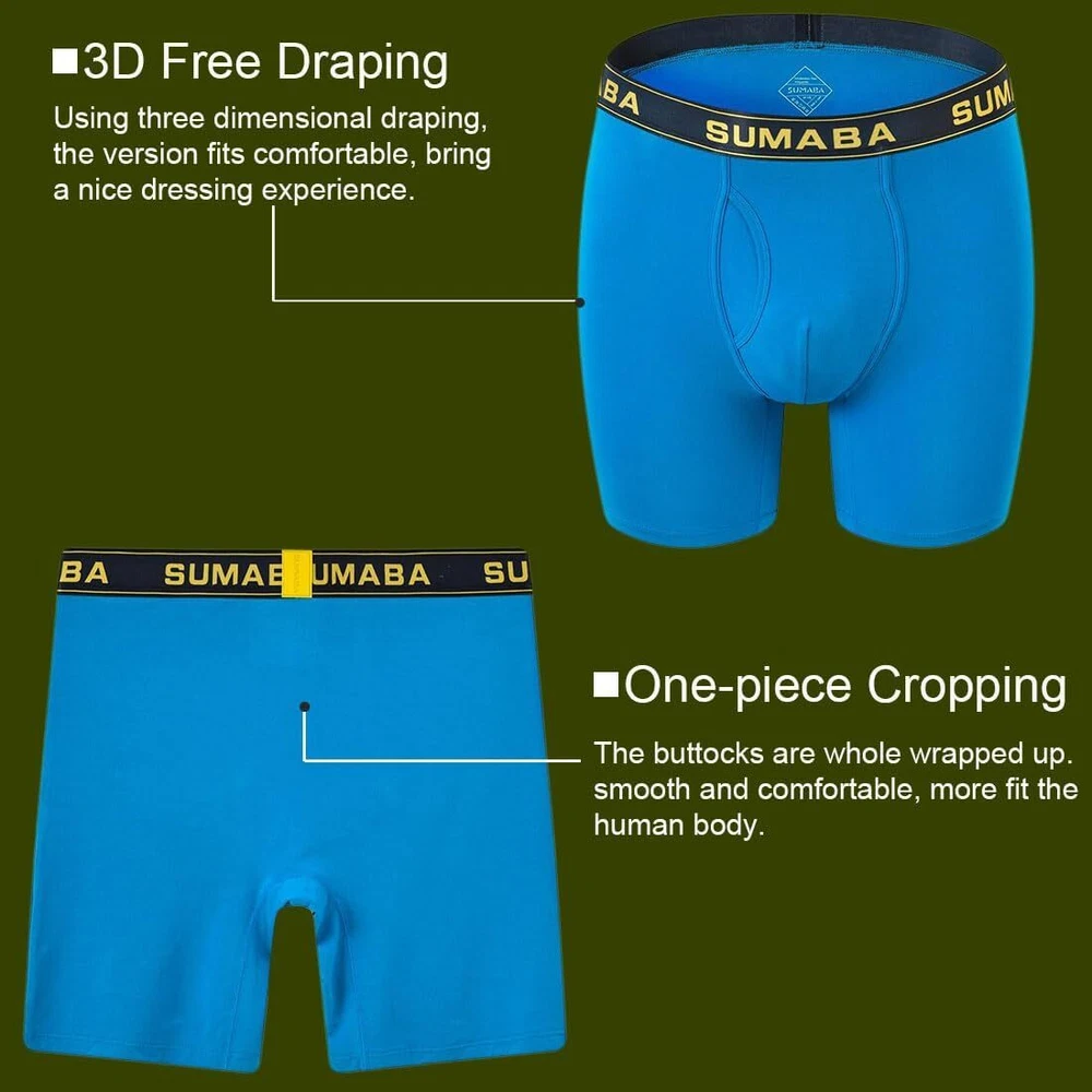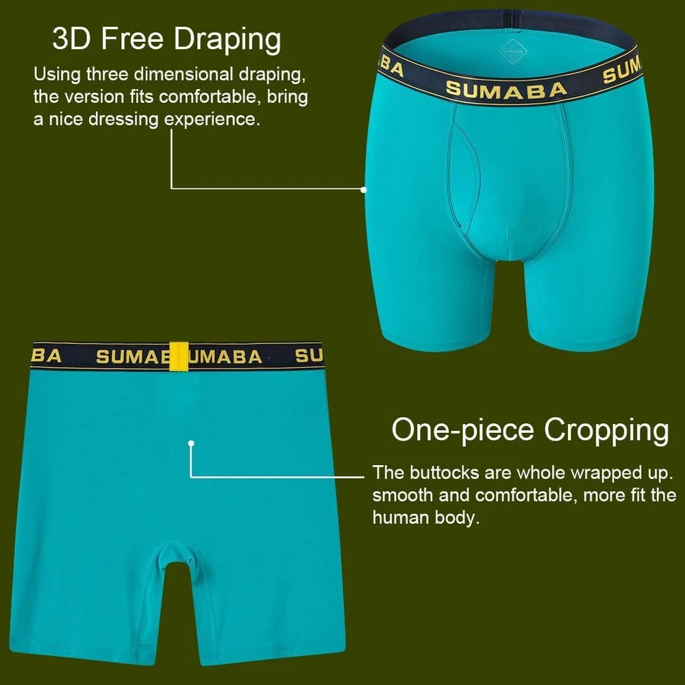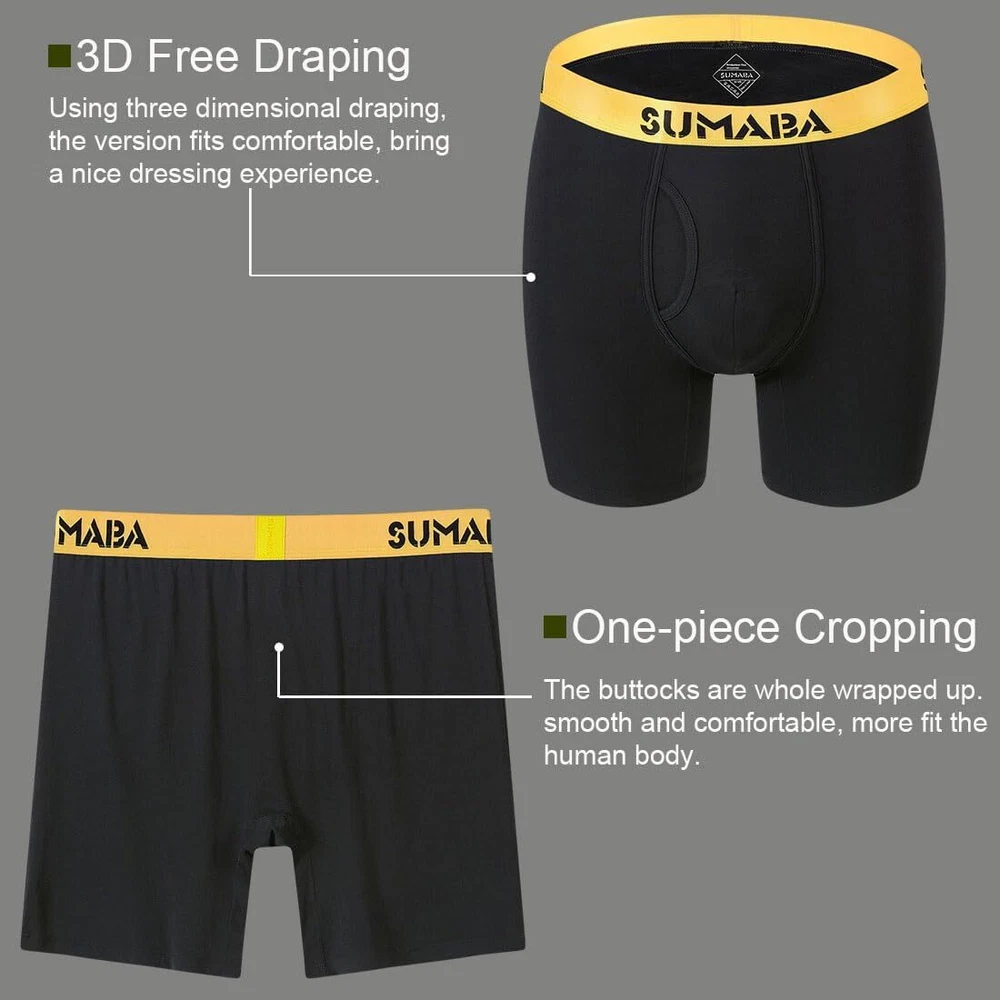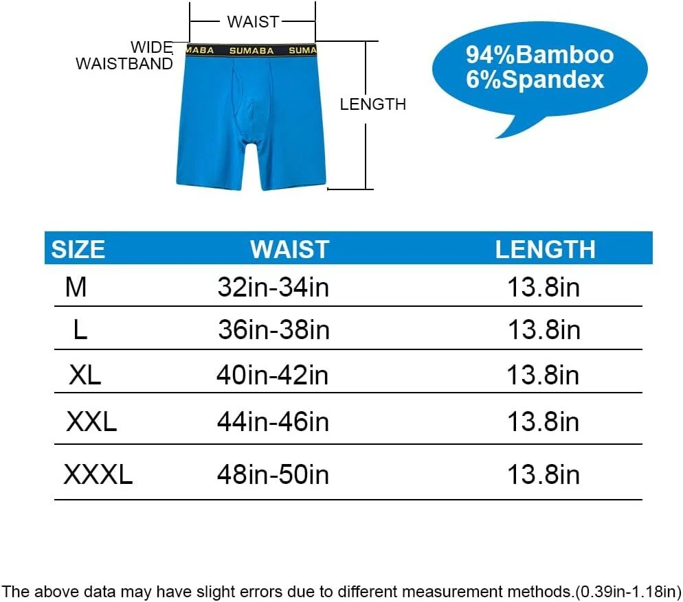Product Description SUMABA Moisture Wicking Underwear for Men KEY FEATURE: Premium Underwear Material: Made from 95% Bamboo Fiber and 5% Spandex, Super soft, Breathable, Stretch, Anti-Wrinkles. No Ride Up & Avoid Thigh Friction: With 6" Longer Leg Length, No Ride Up More Fitted to the Leg, and Effectively Prevent Pain Caused by Leg Friction. U-Pouch & Open Fly: With U-Pouch Design, Can Provide Good Support to Men. Pocket Open in Front is Easy-Go When Nature Calls. Tag-Free Label and Logo for All-Day Comfort. Healthy Fabric and Soft Touch: Bamboo Fiber is a Natural Material More Skin-Friendly and Feels Very Soft. Smooth Non-Chafing Stitching: No Sides Visible Seaming and Back Seam Feel Smooth on Your Skin. Material: 94%Bamboo Viscose and 6%Spandex The fabric is very soft, skin-friendly and breathable, leaving you comfortable all day long. No Roll Waistband The 1.38 inch wide waistband does not tighten the waist and is comfortable without marks. Mens Underwear with Pouch Open Front Double layer pouch open front , three-dimensional space is more comfortable and convenient. No Inductive Hot Dtamping Label No feeling label, more comfortable and frictionless.