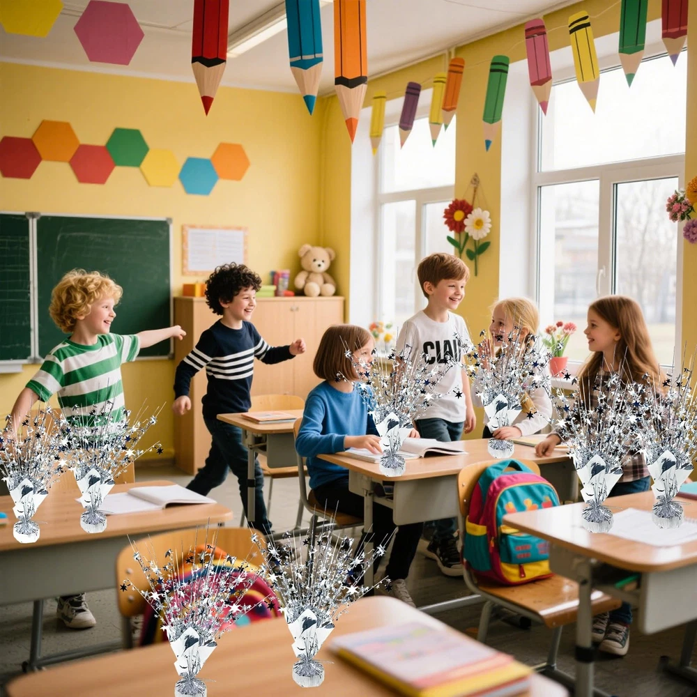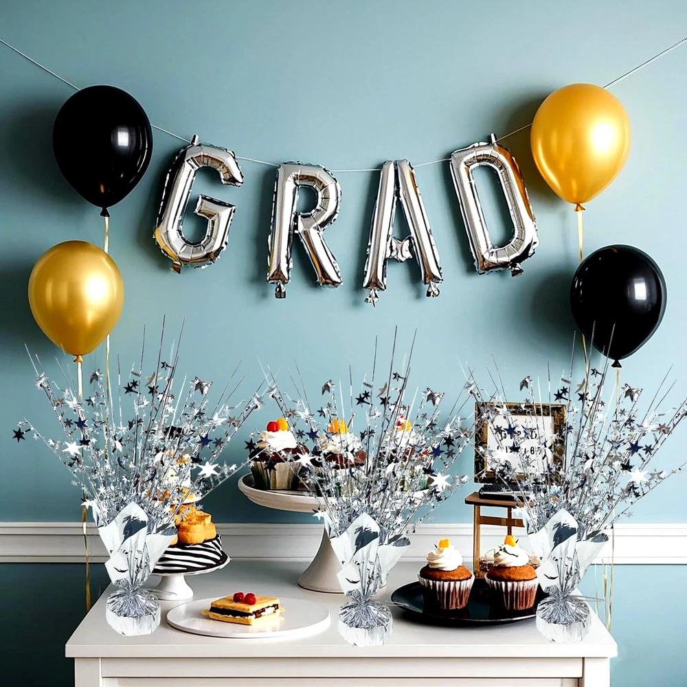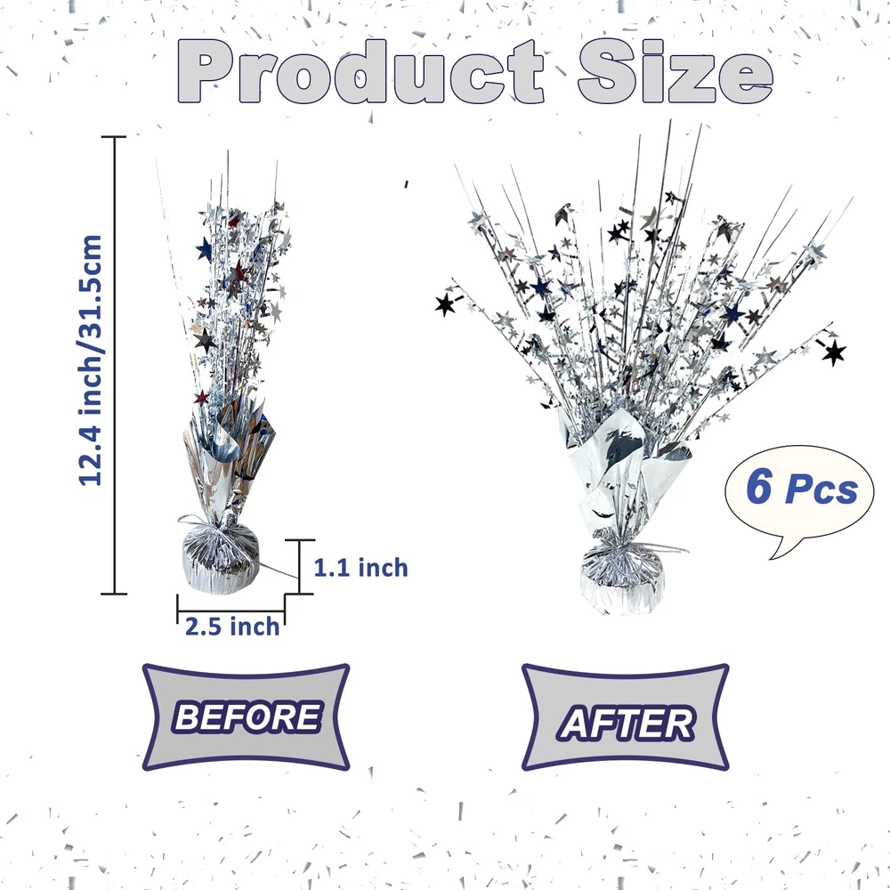 Silver Table Decor for Party 18 pieces of centerpiece spray table decorations with the vibrant and bright colors, each come with 24 spray bunches, the sufficient quantity and bright color can meet your need of decorating in your home or party, cute and shining under light, which will be a big hit at your party. Ideal for Various Celebratory Events Table decor centerpiece perfect for use as table decorations, home decorations, garden decorations, office decorations, scene decorations, photo props, weighted table decorations, prom decorations, etc. A great choice for event, anniversary, parties, Christmas, new year table decorations, silver new years eve table decorations, new year party table decorations 2026, weddings, theme parties, anniversaries, newlywed guest, disco centerpieces for tables, graduation season etc. Easy to Use The silver foil spray centerpieces are made of plastic and iron wire, bright color and not easy to fade, iron wire is bendable, so you can bend the silver centerpieces for table to bloom or DIY wire according to your needs Reusable and Reliable The table decorations for party centerpieces are mainly made of high quality aluminum foil and stick, sturdy and shining, eye catching, not easy to break or fade, ensuring can withstand the wear and tear of multiple celebrations. The table spray decorations can be stored easily. The reliable structure at the base offers a secure stand, reducing the risk of tipping or falling. Specifications: Material: metallic plastic, foil and metal wire Color: Silver/Metallic Gray Size: 12.4inch / 31.5cm Notes: Manual measurement, please allow slight errors on size. The color may exist slight difference due to different screen display. Star Centerpieces Set: 6 pack metallic foil spray centerpiece for tables, decorated with metallic bristles and stars, shining attractive. Enough to meet your needs for multiple festival decorations purposes, table stars decor ensure to create a vigorous festival atmosphere Silver Pentagon Decoration: Each star centerpieces for tables are finely crafted with a silver metallic thread and the elements of die cut foil pentagram shape. Plan your star-themed party with the spray table centerpiece Fine Workmanship: The glitter silver star centerpieces are made of quality metallic plastic, foil and metal wire,not easy to break or fade. The base is steady with wrapped in silver foil, not easy to fall down, silver table spray decorations can be recycle use year after year Proper Size: Metallic plastic star centerpieces is 12.4" height, and the firm base is 2.5" in the diameter. Party decorations for tables can be placed in the middle of the table to attract people's attention without taking up too much space, adorable and glitter to add party event Diy Your Party: The metal wire of table centerpieces for party can be easily unfolded and shaped, no assembly required. Use these spray bunches and stars to decorate your parties, use your creativity and imagination to combine the big centerpieces for tables Wide Applications: Foil table decoration for , engagement, anniversary, date, wedding, Christmas, new years table decorations, table centerpiece nye, bar mitzvah centerpieces, romantic dinner graduation season or other occasions, which can be applied to decorate your home and disco party, or just as daily home adornments