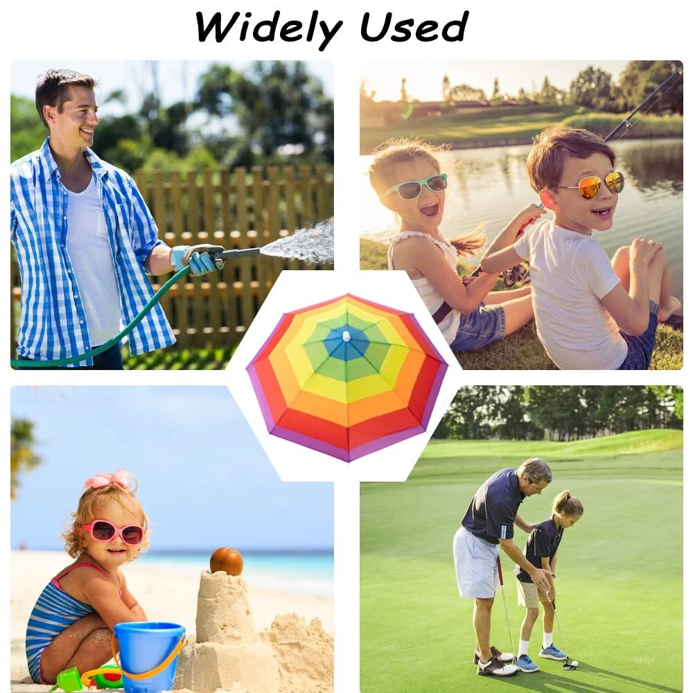 Description 6 Pack Umbrella Hat Rainbow Umbrella Hat for Colorful Umbrella Hat Rainbow Head Umbrella Cap for Sun 20 Inch Diameter Folding Waterproof Elastic Fishing Rain Hats for Outdoor Party Beach Hiking Multiple Performance: Made of quality nylon fabric, the head umbrella for has rained and sun-resistant performance. The top of our umbrella sun hat with water blocking coating can reflect light and doesn't absorb heat, keeping you cool under the sun and safe in the rain Elastic Headband Design: Adopt adjust the strong elastic headband to fit easily around your head without being too tight, giving you a comfortable wearing experience. Convenient to open and can be folded up like a normal umbrella, which is easy to Functional Application: Use for outdoor activities such as home, garden, fishing, golf, basketball, baseball, beach sports, travel, and camp; Suitable for sun, rain, and wind day. Great for all ages, including adults, men, women, and children who can enjoy Rich Styles: This package includes 6 pieces of umbrella hats in different styles, watermelon color, rainbow, camouflage, pink purple, dark blue, and rose red. Sufficient quantities and vibrant colors are suitable for your daily use and Lightweight and Compact: The dimension is about 20 inches/ 50 cm in open diameter, the length is approx. 12 inches/ 31 cm in folded or closed diameter, lightweight and portable. With beautiful colorful patterns, it is also perfect for costume parties and daily life use, bringing you a stylish and eye-catching outlook