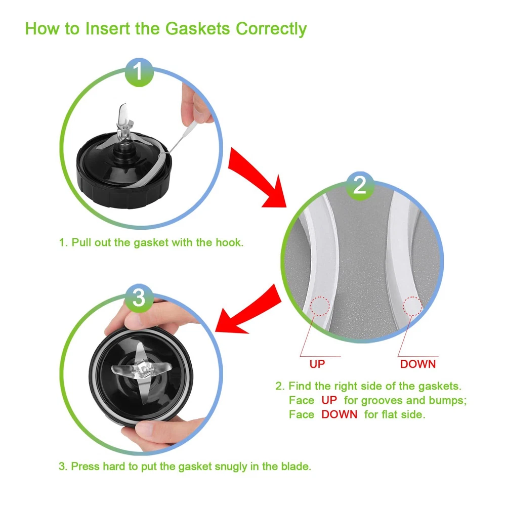 6 Pack Rubber Gaskets Seal 3.94 Inch for Nutri Ninja Blender Replacement 7 Fins 【Compatibility】-- The accessories fit for Ninja blades BL450-30, ( NOT for BL450-70 ), BL451-30, ( NOT for BL451-70 ), BL455-30, ( NOT for BL455-70 ), BL456-30, ( NOT for BL456-70 ), BL480-30, BL480D, ( NOT for BL480-70), BL481-30 ( NOT for BL481-70), BL482-30 ( NOT for BL482-70), BL486CO, BL486CO-30, BL487, BL487A, BL487T, BL487T-30, BL488W, BL490, BL491 BL492, BL492W, BL640, BL640-30, BL641, BL641C-30, BL642, BL680, BL680A, BL681A, BL682, BL682, BL2012, BL2013, NN100, NN100A, NN101, NN102, CT680, CT680SS,CT680CO2SS, CT682SP. 【Not Compatible】-- The blender replacement parts ONLY FIT for Ninja Auto-iQ Pro Extractor Assembly 7 Fins. ONLY fit 18,24,32-Oz cups, NOT fit 16-Oz blender cups. NOT fit for Ninja model 70 series. Not fit for Ninja BL450-70, BL451-70, BL455-70, BL456-70, BL480-70, BL481-70, BL482-70.The model number # must be identical. If any number or letter is not the same, please don’t buy it.ONLY 3.94 inch / 10 cm Gaskets are suitable. 【For Ninja Blender Seal Ring】-- Made of silicone rubber, the replacement washer is sturdier and more flexible to avoid leakage. Use a toothpick to take it out after each use to keep it clean and prevent the base from getting moldy. 【How to Insert the Gaskets Correctly】 -- The grooves are different on each side of the ring. Make sure you install it Face UP for grooves and bumps; Face DOWN for flat side. Otherwise, it won't fit properly.Please refer to the pictures for details. After the gasket replacement make sure to push the gasket as dare down as it will go using the handle end of a fork or spoon for the ring seal to put snugly in the blade for better seal. Specifications: Material: Silicone Rubber Plastic Size: Diameter: 3.94 inch / 10 cm, Thickness:0.4 inch / 1 cm. Please refer to the picture for the measurement. ONLY 3.94 inch / 10 cm Gaskets are suitable. Do make sure your original Ninja gasket is in the same size before ordering as there are many kinds of the rubber rings for Ninja blender. Compatibility: The 3.94 gasket is compatible with Ninja Bullet Blender Blade Assembly. Models listed below: BL480, BL480D, ( NOT for BL480-70, BL480W-70), BL486CO, BL486CO-30, BL487, BL487A, BL487T,BL487T-30, BL488W,BL490, BL491 BL492, BL492W, BL640, BL640-30, BL641, BL641C-30, BL680, BL680A, BL681A ,BL682, NN100, NN101, NN102 CT680, CT680SS, CT680CO2SS, CT682SP. ONLY fit 18,24,32-Ounce cups, NOT fit 16-Ounce blender cups. The model number # must be identical. If any number or letter is not the same, please don’t buy it. Shipping We offer FREE shipping on all orders! We ship within Three business days of payment, usually sooner. We use a selection of shipping services such as UPS, FedEx, USPS etc. We only ship to the lower 48 states, no APO/FPO addresses or PO Boxes allowed. Local pickups and combined shipping options are not provided at this time. Return You can return a product for up to 30 days from the date you purchased it. Any product you return must be in the same condition you received it and in the original packaging. Please keep the receipt. Payment We accept payment by any of the following methods: PayPal Please pay as soon as possible after winning an auction, as that will allow us to post your item to you sooner! Feedback Customer satisfaction is very important to us. If you have any problem with your order, please contact us and we will do our best to make you satisfied. Contact Us If you have any queries, please contact us via ebay. We usually respond within 24 hours on weekdays. Please visit our eBay store to check out other items for sale! Thank you for shopping at our store.