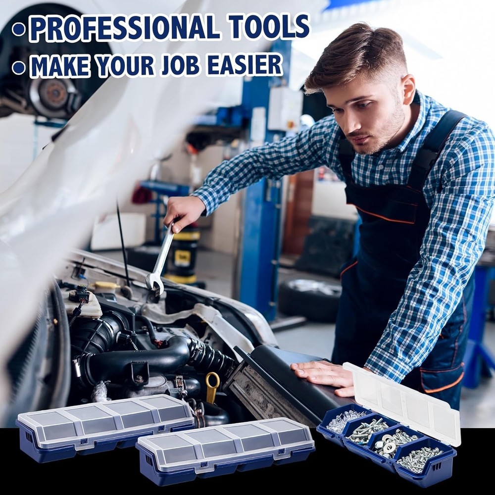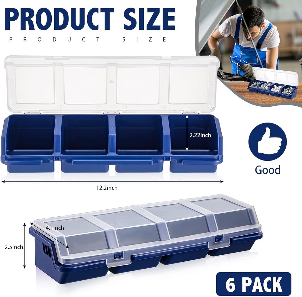Hushee 6 Pack Screw Organizer Box with Lids 4 Compartments Tool Bin Divider Small Parts Storage Organizer sorting Screw Toolbox Case for Garage Craft Hardware Workbench Storage(Blue) Ample Organizing Capacity: tired of losing small screws, bolts, and other hardware? This package includes 6 ample sized screw organizer boxes for practical organization; Each box offers four individual compartments, providing an abundant space for all your tiny items; There is no lose a crucial piece again with this comprehensive storage solution Constructed with Reliable Material: don't settle for subpar storage; These screw organizer boxes are manufactured from plastic, bringing durability and longevity; Experience the reassurance of knowing your small items are secured in a container designed to resist wear and tear, providing reliable use for years come Suitable Sizes: our screw organizer box presents a practical size of approximately 12.2 x 4.1 x 2.5 inches in total; Additionally, each compartment measures an ideal dimension of 3 x 2.6 x 2.2 inches, suitably sized to accommodate a variety of small items without the fear of them getting cramped Ingenious Design: experience the convenience brought by our cleverly designed screw organizer box; With a translucent lid, you can easily view your contained items, saving you from unnecessary rummaging; The box also features an angled opening, ensuring effortless access to your screws Diversity in Application: these organizer boxes aren't just for screws; Their design and size make them widely applicable for storing a variety of small items such as beads, buttons, bolts, nuts and much more; Organize your workshop, craft corner, or tool shed