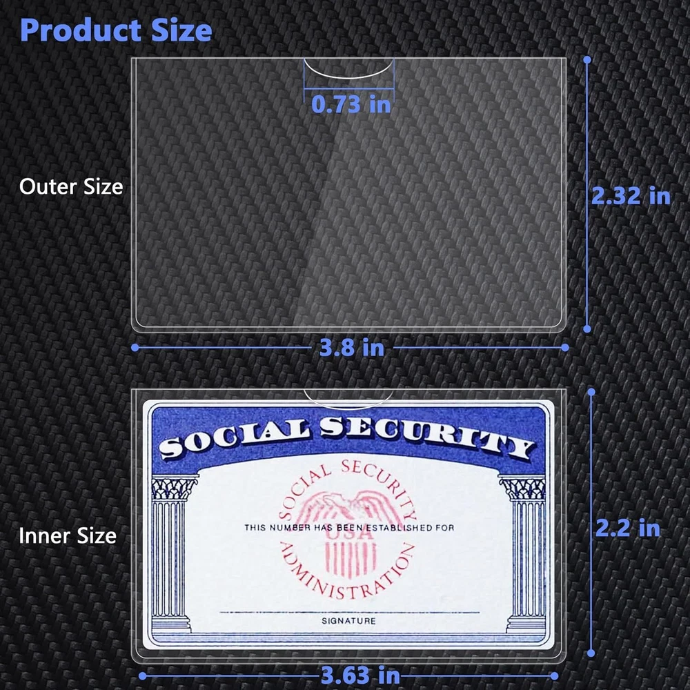 Store New Arrivals Add to Favorite View Feedback Contact 6 Pack Social Security Card Protector/Medicare Card Protector Sleeve/Social Card Description Max Input Sheet Capacity 6 Style Classic Number of Items 6 Color Clear Material Polyvinyl Chloride (PVC) Material Type Polyvinyl Chloride (PVC) Maximum Sheet Capacity 6 Number of Pieces 6 Item Dimensions L x W 3.8"L x 2.32"W Type Security Card Sleeves MPN Does Not Apply Features Clear Country/Region of Manufacture Unknown Unit Quantity 1 ๐๐ซ๐จ๐๐ฎ๐๐ญ ๐๐ข๐ณ๐:๐.๐๐ฑ๐.๐๐ ๐ข๐ง ๐ ๐ข๐ญ ๐๐จ๐ซ ๐๐ฅ๐ฅ ๐๐ข๐ณ๐ ๐๐๐ซ๐๐ฌ:๐๐๐ฐ ๐๐๐๐ข๐๐๐ซ๐ ๐๐๐ซ๐, ๐๐จ๐๐ข๐๐ฅ ๐๐๐๐ฎ๐ซ๐ข๐ญ๐ฒ ๐๐๐ซ๐, ๐๐ฎ๐ฌ๐ข๐ง๐๐ฌ๐ฌ ๐๐๐ซ๐, ๐๐ซ๐๐๐ข๐ญ ๐๐๐ซ๐ ๐๐จ๐๐ข๐๐ฅ ๐๐๐๐ฎ๐ซ๐ข๐ญ๐ฒ ๐๐๐ซ๐ ๐๐ซ๐จ๐ญ๐๐๐ญ๐จ๐ซ,๐๐๐ฐ ๐๐๐๐ข๐๐๐ซ๐ ๐๐๐ซ๐ ๐๐จ๐ฅ๐๐๐ซ ๐๐ซ๐จ๐ญ๐๐๐ญ๐จ๐ซ ๐๐ฅ๐๐๐ฏ๐๐ฌ ๐๐๐ฌ๐ฒ ๐ฌ๐ฅ๐ข๐๐ & ๐๐จ๐ง-๐ฌ๐ญ๐ข๐๐ค: ๐๐ฉ๐๐๐ข๐๐ฅ ๐จ๐ฉ๐๐ง๐ข๐ง๐ ๐๐๐ฌ๐ข๐ ๐ง ๐๐๐ง ๐ข๐ง๐ฌ๐๐ซ๐ญ ๐๐ง๐ ๐ซ๐๐ฆ๐จ๐ฏ๐ ๐ฒ๐จ๐ฎ๐ซ ๐๐๐ซ๐ ๐๐๐ฌ๐ข๐ฅ๐ฒ ๐๐ฎ๐ซ๐๐๐ฅ๐ ๐๐๐ญ๐๐ซ๐ข๐๐ฅ๐ฌ:๐ฆ๐๐๐ ๐จ๐ ๐ฐ๐๐ญ๐๐ซ-๐ซ๐๐ฌ๐ข๐ฌ๐ญ๐๐ง๐ญ ๐๐ง๐ ๐๐จ๐ซ๐ซ๐จ๐ฌ๐ข๐จ๐ง-๐ซ๐๐ฌ๐ข๐ฌ๐ญ๐๐ง๐ญ ๐๐๐ ๐๐๐ซ๐ ๐ฌ๐ฅ๐๐๐ฏ๐๐ฌ Product Description ABOUT US We can be contacted at any time through eBay messages if you have any questions, comments or product requests. We will respond to you within 24 hours and do our best to help you out! We encourage our customers to contact us with any questions or concerns! We'd like to be sure you are completely satisfied with your purchase. SHIPPING We offer FREE shipping on all orders! We ship within 3 to 5 business days of payment, usually sooner. We use a selection of shipping services such as UPS, FedEx, AUS Post, Bluecare Express, etc. We only Ship to the lower 48 states, no APO/FPO addresses or PO Boxes are allowed. Local pickups and combined shipping options are not provided at this time. RETURNS & Payment: If you are not 100% satisfied with this purchase, if you have any quality problems or damage, please feel free to contact us and request a refund or replacement. A 60-day refund and 24-hour email support are available. We Accepted Payments Via PayPal, Debit Card, Credit Card, Amex Cards PAYMENT We accept PayPal. CONTACT US This page content is yet to come Please ad us to your favorite seller and visit again later Thank You
