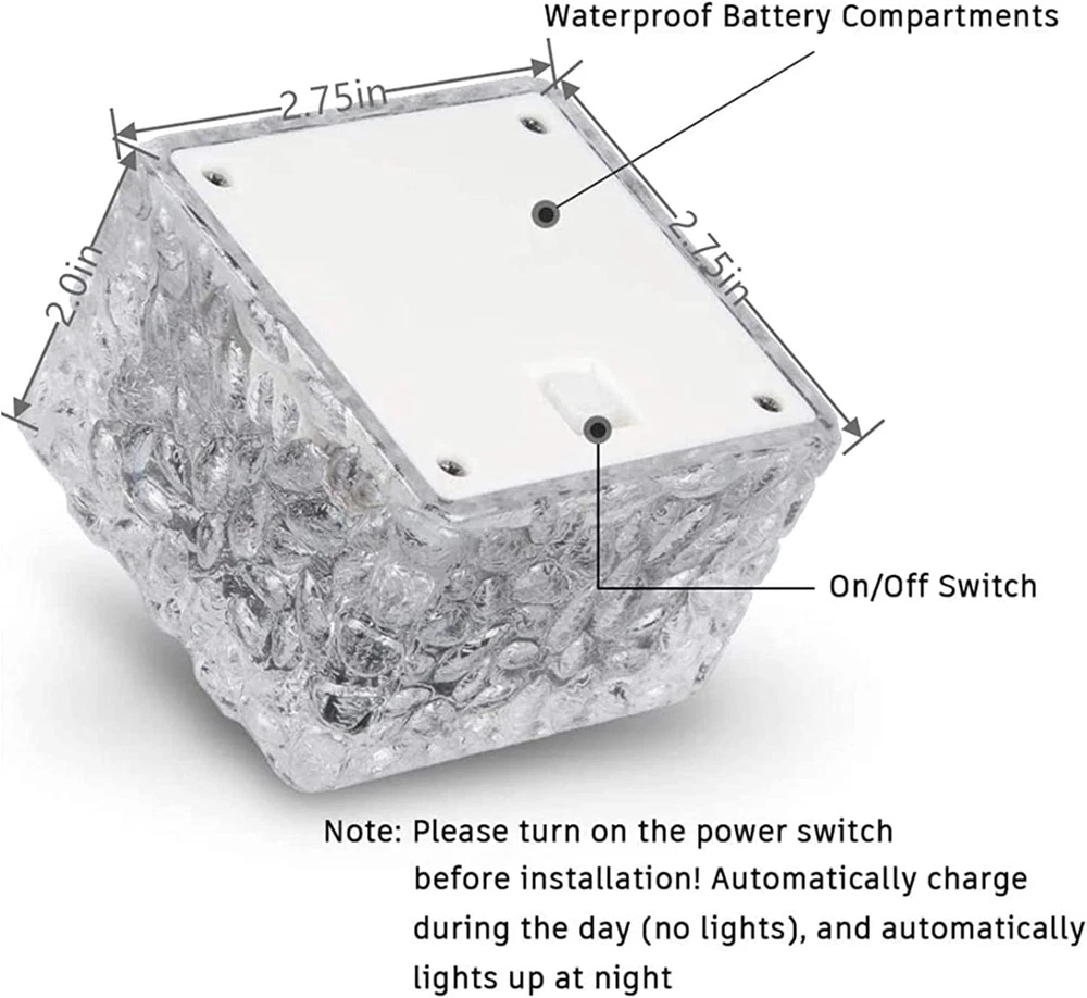 Fixture Type: Removable Part Number: CL-XBZ Style: Classic Lighting Method: LED Batteries Included?: Yes Room Type: Patio Water Resistance Level: Waterproof Batteries Required?: Yes Product Dimensions: 2.76"L x 2.76"W x 1.97"H Average Life: 5000 Hours Color: White Size: 6 pack 2.75" UPC: 313084444425 Country of Origin: China Light Source Type: LED gtin13: 313084444425 Number of Light Sources: 6 Voltage: 3.68 Volts (DC) Material: Acrylonitrile Butadiene Styrene Specific Uses For Product: Garden, Pathway, Walkway Wattage: 59.98 milliamp_hours Light fixture form: Path Power Source: Solar Powered Included Components: solar brick lights Unit Count: 6.0 Count Indoor/Outdoor Usage: Outdoor Shade Material: Acrylonitrile Butadiene Styrene, Glass Plug Format: A- US style Special Features: Waterproof Brand: Does not apply Control Method: Remote Installation Type: Surface Mount Shape: Rectangular Shade Color: White Warranty Type: Limited Item Weight: 1.78 pounds Light Color: White, Warm White Type: Does not apply Model Name: CL-XBZ-6 Special Feature: Waterproof Mounting Type: Floor Mount Number of Items: 6 Assembly Required: Yes Item model number: CL-XBZ