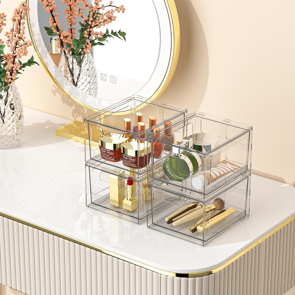 Premium Material: Each organizer measures 5.5 "L x 7.5 "W x 4.4 "H. The transparent color is convenient for you to find what you need quickly, and is ideal for storage and stronger and safer than glass. Multiple Storage Ways: Plastic organizer can help you organize your home. They can be used as vanity, bathroom, kitchen, under sink, pantry, storage and restroom storage. Maximize the use of containers. Stackable Design:The makeup organizer can be stacked and used, depending on the shape you need to determine its use, maximize the use of the organizer. Pull-Out Handles: Acrylic organizer is designed with a pull-out handle, which makes it easy to store and remove items, while keeping them neat and dust-free. Versatile Use: The storage bins are suitable for storing a variety of items, such as stationery, makeup tools, toothbrushes, cotton swabs, snacks, miscellaneous items and more.