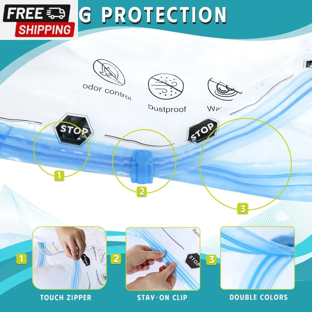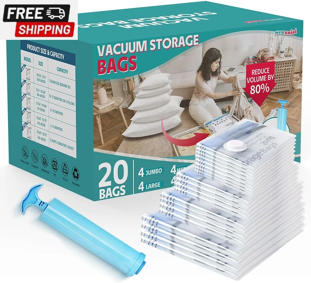 6 Pack Vacuum Storage Bags, Vacuum Seal Bags for Clothing, Comforters, Blankets, Space Saver Compression Bags with Hand Pump. (2×Jumbo, 2×Large, 2×Medium) Vacuum Seal Storage Bags: Variety sizes space saver vacuum storage bags for multiple sizes of items including clothes, comforters, pillows, and bedding. Volume reduction of 80%. Hand Pump Included for Easy Use: Works with a standard vacuum cleaner. Put the items in our storage vacuum bag, seal the zipper, suck out the air, and close the lid. 1 hand pump is included in the combo, which can be used during your trips. PA & PE: The compression bag is made of extra thick PA+PE, With a triple-seal turbo valve & double zipper seal design. Don’t worry about the long-term effects of storage in compression bags. Multi-use: Our vacuum storage bags are essentials for saving household space and organizing travel. It functions as a storage bag for clothes, comforters, and blankets. Package Included: 2×Jumbo(39.37” X27.5”); 2×Large: (31.5” X 26.65”); 2×Medium: (27.56” X 19.68”); 1×Hand Pump. Product Description Our vacuum storage bags combination is a must-have for you to save storage space! The compression bag is made of PA+PE material, which is highly flexible, durable, not easy to leak, and can be reused. Use our space-saver bags and store away various items including clothes, bedding clothes, blankets, pillows, plush toys, and more. What's more: you can use our compression bags to reduce larger and fluffier items such as vests and winter coats to minimal sizes with ease giving your clothing full protection and keeping your outfit dry. The package has vacuum storage bags of different sizes, suitable for various purposes: storage, travel, camping, moving, etc. 6 Pack Includes 2× Jumbo: 39.37” X 31.5”(100cm X 80cm) 2× Large: 31.5” X 23.65”(80cm X 60cm) 2× Medium: 27.56”X 19.68”(70cm X 50cm) 1× Hand Pump How To Use a Vacuum Storage Bag: PACK: Put the items inside our vacuum storage bag SEAL: Zip along the dual-zip 2-3 times and ensure the zipper is fully sealed VACUUM: Suck all the air out with a vacuum cleaner/hand pump included STORE: Close and secure the valve cap Usage Tips : Dehydrate all items before putting them away and storing them in vacuum bags. Avoid over-stuffing beyond the max volume line, use multiple bags instead. Double-check the zippers for full closure, and avoid stuff with sharp corners. Check leaking holes if there is a "hiss" sound, sticky tape should fix this problem. Re-vacuum the bags every 3-4 months for long-term storage. Vacuum storage is not suitable for down fibers and leather items. Shipping Fast shipping is very important for us. Our standard US shipping service is FREE. Your order will be shipped within 2-3 business days upon full payment received. Your order will be delivered within 2-3 business days after the handling time. We only ship to the confirmed PayPal address. We reserve the right to cancel any order for any reason at any time. We are not responsible for undeliverable addresses. Returns and payment We offer a 30 days return policy from checkout winning date. We allow only PayPal as payment method FeedBack Your feedback very important to us, after you get your package and you are satisfied with our service please leave us positive feedback If you have any problem with your order / any questions please before leave any type of feedback For any questions, using eBay contact system Please visit our eBay store to check out other items for sale! Thank you for shopping at our store.
