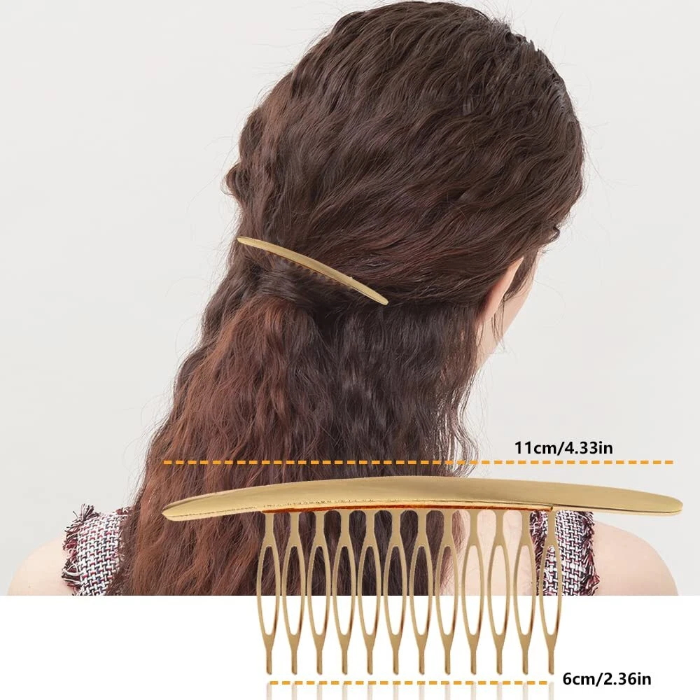 - Romantic Goddess Hair Comb Set - Package includes 6 different golden hair side combs in butterfly, laurel leaf branch and french twist shapes. Vintage palace styles hair comb set to make hair decoration different every day - Durable Metal Material - Well made of durable alloy metal, and the welding process fixes the decoration and the comb tightly is not easy to break or separate. The teeth are not easily broken after repeated adjustment, and can be used for a longer time - More Sizes To Choose From - The leaf hairpin set consists of 5/10/12/15 teeth, you can choose to fix or decorate according to your different hairstyles. Lightweight and versatile side comb for women of all ages from teens, kids, adults, with more possibilities - Suitable For All Hairstyles - Whether you have thick curly hair or long straight hair, childlike and thin hair, a high-quality alloy tooth comb can adjust the gap between the teeth to make it firmly wear on the head without falling out easily - More Occasions Are Needed - A romantic French retro hair clip for all occasions - weddings, anniversaries, proms, graduations, or as a gift for those closest to you, it's also a great choice for everyday wear Product Description 6 Pack Vintage Gold Metal French Twist Hair Side Combs Clip With Teeth Grip Clasp Pins for Women Bridal Wedding Decorative Headpiece SPECIFICATION Quantity: 6 PCS Color: gold Material: alloy metal Shape: butterfly, laurel leaf branch and french twist Approx size: Glossy twist hair comb - 11cm/4.33in Point twist hair comb - 12cm/4.72in Large leaf hair clip - 13cm/5.12in 2 pieces leaf hair clip - 10cm/3.94in Single piece leaf hair pin - 9cm/3.54in Butterfly hair pin - 4cm/1.57in SOME QUESTIONS YOU MAY WANT TO KNOW Q1: I'm always annoyed by not getting the right hair accessories for my thick/thin hair Answer:The alloy material allows the teeth to be repeatedly adjusted to the left and right to be fixed on the head and not easy to fall off. Q2:A single style prevents me from having too many choices when it comes to clothing matching Answer:The set contains 6 different styles of hairbrushes with 5/10/12/15 teeth to match a variety of hairstyles. Q3:I'm worried that it won't last long after I buy it, or I'll receive a damaged package. Answer:Metal material makes it last longer.