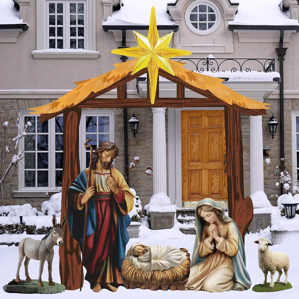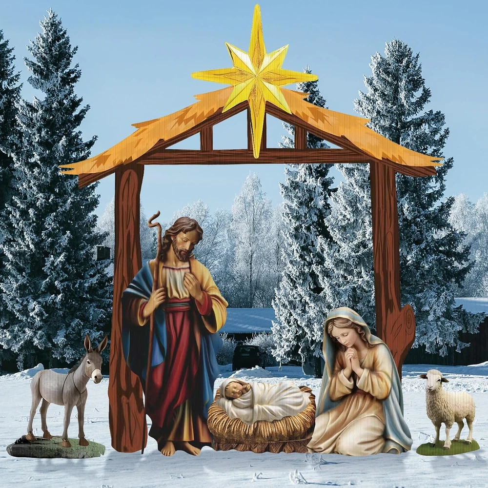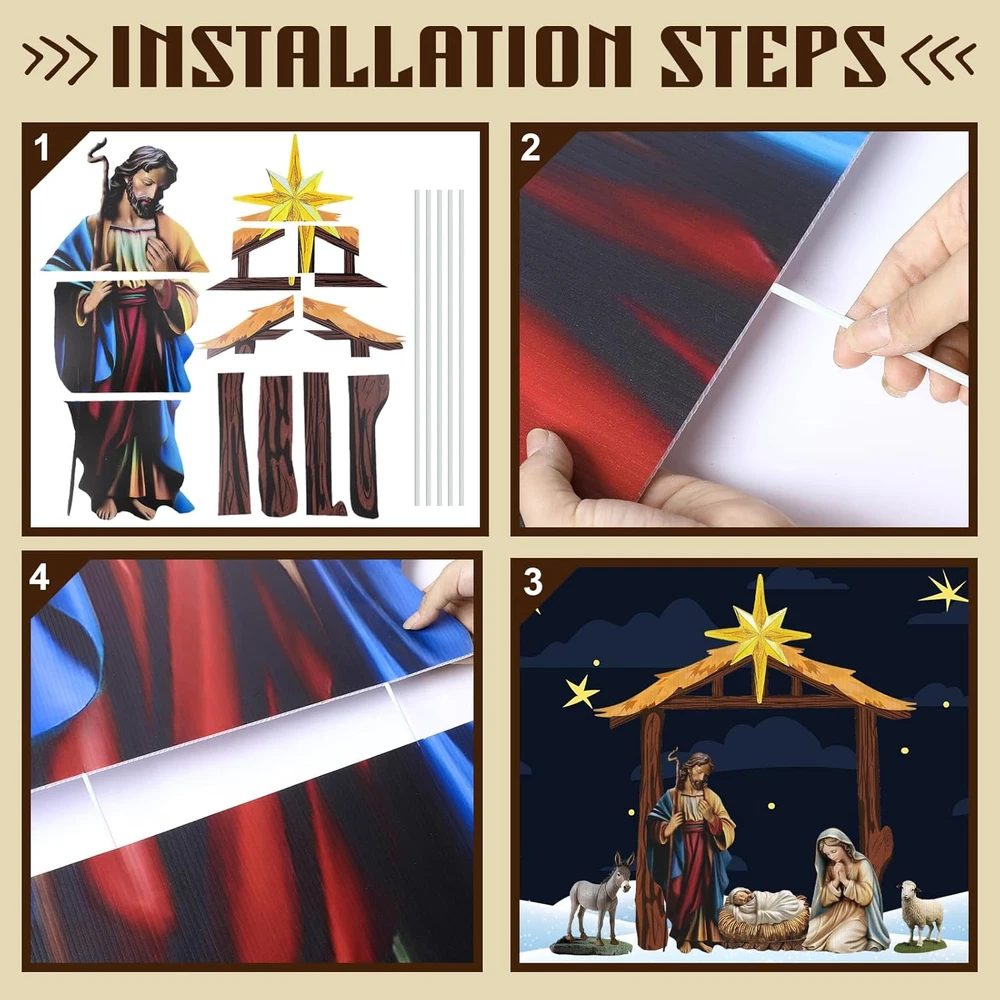 Menu Other Items Feedbacks About Us Contact Us Add To Favorites 6 Pcs Christmas Outdoor Nativity Set 6.7Ft Large Manger Christmas Yard Signs Nativity Outdoor Christmas Decorations Religious Holy Jesus Birth Manger Scene Supplies with Stake for Xmas Lawn Christmas Outdoor Nativity Set: you will receive a complete nativity outdoor grounding set including the Holy Family, stable, donkeys and sheep,packaged with 17 parts for convenient transportation;This outdoor nativity scene can show your religious beliefs and support,realistic and bright,ensuring to provide a well rounded and robust aesthetic effect on your christmas outdoor decoration Reliable Material to Support Your Usage: with Christmas outdoor yard signs stakes made from corrugated plastic cardboard signs and metal stakes, our outdoor nativity sets are not just visually pleasing but also highly sturdy, these strong and solid materials ensure the longevity of our product and enhance its performance even in outdoor conditions Large Sizes and Diverse Decorative: our Christmas decorations outdoor yard come in various sizes, the size of the horse trough is 70 x 81 inches, the size of the Virgin Mary is 29 x 23 inches, the size of the baby is 21 x 14 inches, the size of the donkey is 19 x 24 inches, the size of the sheep is 10 x 10 inches, and the size of the man is 20 x 47 inches; This variety in size creates a beautiful tiers effect when displayed together, enhancing the space they are applied in Easy to Install and Use: our Christmas yard stakes, each with 2 metal stakes, are lightweight and easy to install; You just need to compare the pictures, assemble them together, splice them together with plastic pipes, and then insert the metal piles underground; It's simple and safe, whether you're setting it up for holidays or religious occasions, our Nativity kit is easy to use Various Applicable to Occasions: our Xmas outdoor nativity sets are fitting for diverse occasions, whether you are celebrating Christmas, Easter, or looking for an attractive year round landscape addition, including anniversaries, weddings, baptisms, baby showers and more; Their neutral colors blend seamlessly with different settings and themes Product Description Item Specification Item Weight 7.68 pounds Country of Origin China Package Dimensions 25 x 18 x 4 inches Dimensions Shipping Returns Additional Info Product Dimensions: 18.0 inches x 25.0 inches x 4.0 inches. Weight: 7.68 lb Fast shipping is very important for us. Our standard shipping service is FREE. Your order will be shipped within 1-3 business days upon full payment received. Most items are delivered within 3-5 business days, however, please allow 3-10 business days. We are shipping only to USA. We only ship to the confirmed Paypal address. We reserve the right to cancel any order for any reason at any time. We are not responsible for undeliverable addresses. We offer a 30 day return policy from checkout winning date. Your satisfaction is guaranteed! If for any reason you are unhappy with your item, just return it within 30 days for a full refund, minus shipping cost. Please contact us prior to initiating a return so that we can issue you a refund authorization. Items defective upon receipt must be packaged in their retail packaging as if new and returned with a detailed description of the problem. Return shipping fees are not refundable. We reserve the right to decline any returns if the above guidelines are not followed. All of our items, unless otherwise stated, will only run on 120 volts. Please check to make sure your country complies with these specifications. If you have a problem or question regarding your transaction please contact us before leaving any type of feedback. We will work with you to resolve any problem you may have.