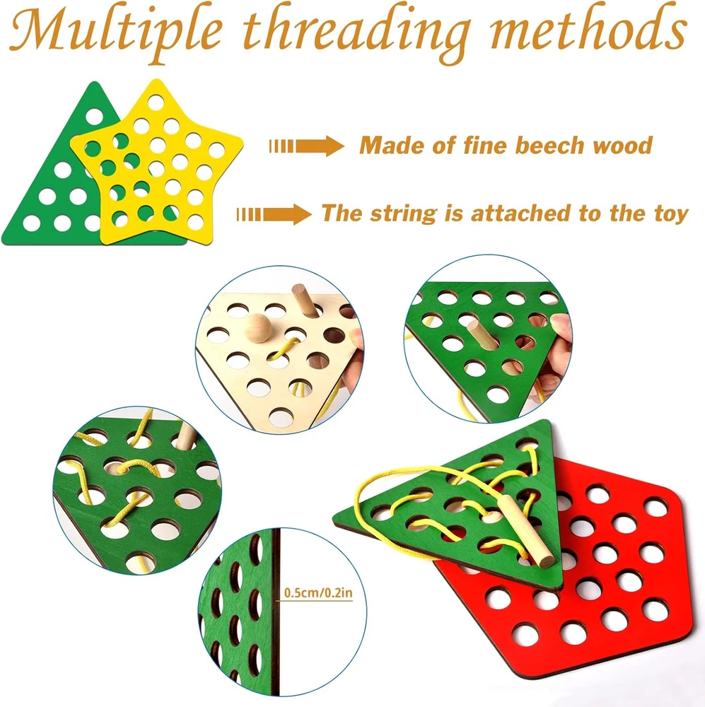 ❤【WOODEN LACING FRUIT TOYS】The lacing toy set includes 6 lacing ropes and 6 different sliced shapes: star, square, heart, circular, triangle, pentagon. These wooden threading toys help to develop kid's imagination, hand-eye coordination, fine motor, cognitive and visual perception skills ♦【EDUCATIONAL MONTESSORI TOYS】These threading toddler toys reference Montessori teaching activities, guide children develop strong essential skills and encourage them independence, such as shoe tying, zippering and buttoning ⭐【TODDLER TRAVEL TOYS】These travel toys are perfect for toddler airplane activities and road trip activities for kids, not only in planes and cars, but even restaurants and schools. Children focus on playing with rope toys to eliminate boredom and irritability from traveling 🔺【ATTRACTIVE DESIGN】A cute wooden caterpillar and log are attached to each end of the lacing rope, the caterpillar is used to thread the rope, and the log is used to stuck the hole of the wooden toys. When children thread the string through the holes of the geometric wooden threading toys, it looks like the caterpillar is "eating" the wood ⚪【SAFETY MATERIAL & DURABLE】 These lacing toys for kids 3-6, made of durable wood, lead-free, BPA-free, and no chemical smell. Suitable size easy for small hands to hold and play, it is also large enough to prevent accidental swallow. Perfect gift for Birthdays, Easter, Children's Day WARM FAMILY TIME Enjoy warm family time while everybody interacting together, playing children's wooden toys. To build a colorful childhood for your kids. GIFT TOYS FOR KIDS This lacing toy set is a great gift for kids, it can bring classic endlessly fun for toddlers, also can keeps children busy for hours. TRAVEL TOYS ACCOMPANY This is a great star & square & heart & circular & triangle & pentagon lacing toy for toddler, perfect size and portable carry around, kids can enjoy the happiness of wooden toys accompany during the trip and adults can feel more comfortable. Package: 1 x star slice (6.4 x 6.4 x 0.2 in) 1 x square slice (6.4 x 6.4 x 0.2 in) 1 x heart slice (6.4 x 5.6 x 0.2 in) 1 x circular slice (6.4 x 6.4 x 0.2 in) 1 x triangle slice (6.4 x 5.6 x 0.2 in) 1 x pentagon slice (6.4 x 6.4x 0.2 in) 6 x lacing rope with caterpillar (30.5 x 0.8 x 0.8 in) Material: Wood & Nylon Color: As picture shown