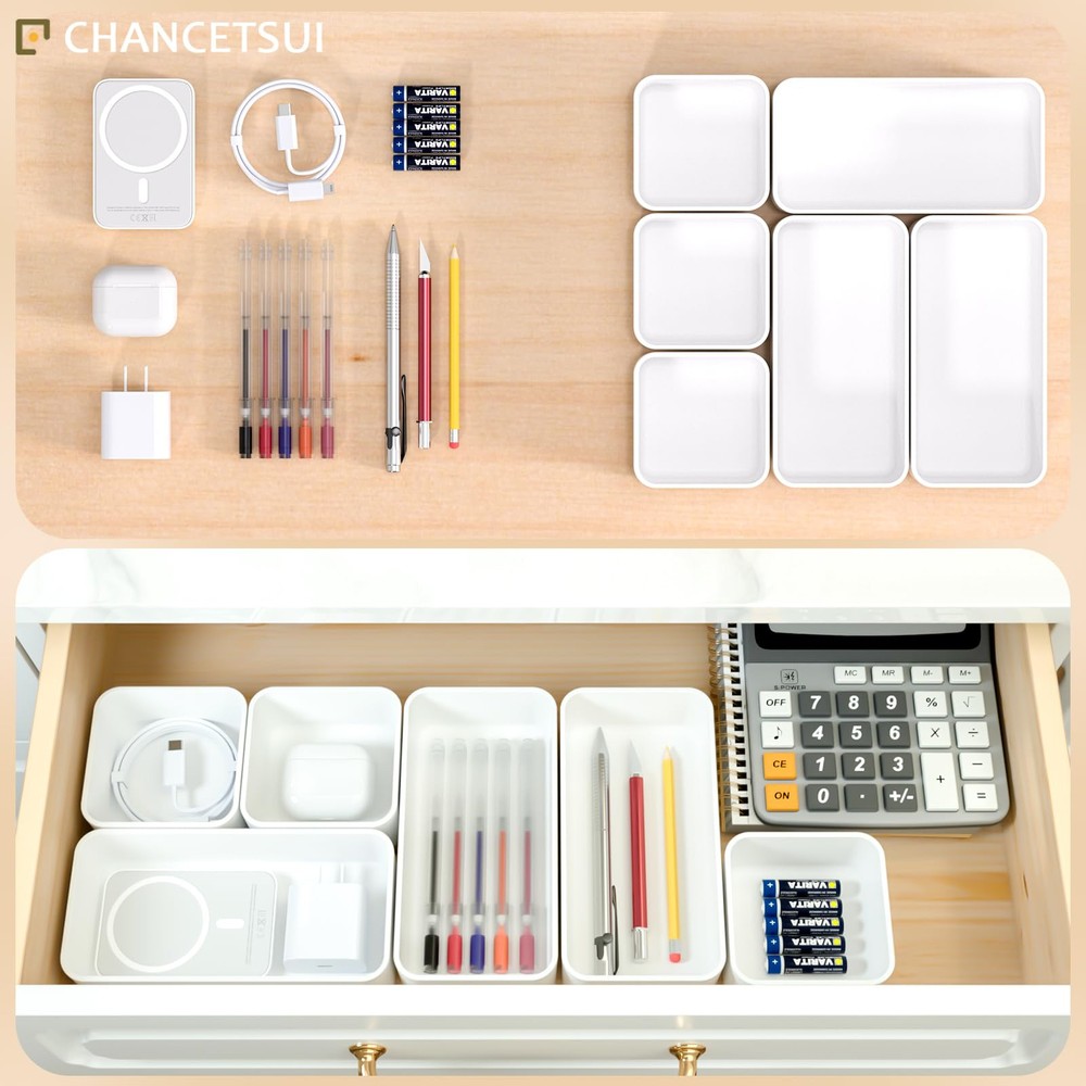 【6 Pcs Set 】 This multifunctional organising trays comes in a 6 pcs set. Package includes : 3.35 x 3.35 x 1.77'' (3 pcs), 3.35 x 6.6 x 1.77'' (3 pcs). You can flexibly use our storage organizer for house organization and storage according to your needs. 【Customize and Stackable】 Individual Plastic Storage Bins can be used to separate your messy drawer and fit all kinds of drawers, such as vanity, bathroom, kitchen, and office drawers. You can customize the layout of the drawer organizers to suit any specific needs. 【Sturdy and Durable】 The desk drawer organizer trays set are made of durable and environmental PET plastic, ensuring a long life of use. Drawer organizer bins are break-resistant and could accommodate different items keeping the organiser nice and steadily stacked. 【Stackable and Space Saving】 These storage bins fit any part of your home. Suitable for use in different drawers to keep your desktop neat and tidy. Offer a generous capacity for storing toiletries, hair accessories, cosmetics, medicine, toothpaste, office supplies, craft supplies, nail polish, jewelry, etc. 【Easy to Clean】These desk drawer storage bins are easy to be wiped clean with a damp cloth. It is very convenient to keep your desktop tidy and easy to find items in the drawer to save time. Making everything look beautiful and better organized.